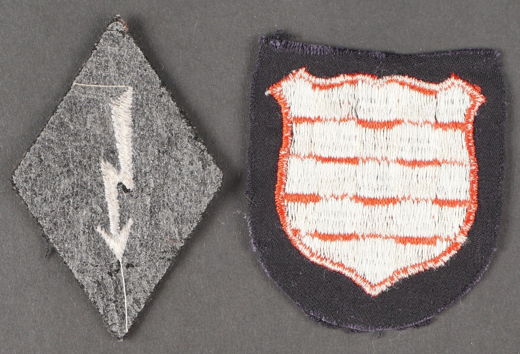 Insignia for Croatian volunteers in the Waffen SS. Embroidered sleeve badge on black background, never mounted on a jacket. SS radio speciality badge, black background, grey back. Never mounted. Some wear and patina to be noted. Condition II+. Croatian Volunteers Insignia in the Waffen SS Sleeve insignia embroidered on black background never mounted on a tunic together with an SS radio operator specialty insignia on black cloth with grey reverse. Both pieces show light wear and patina consistent with age. Condition II+.