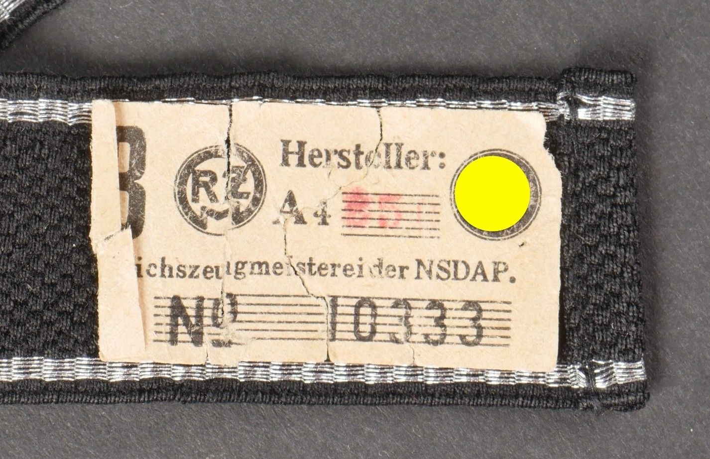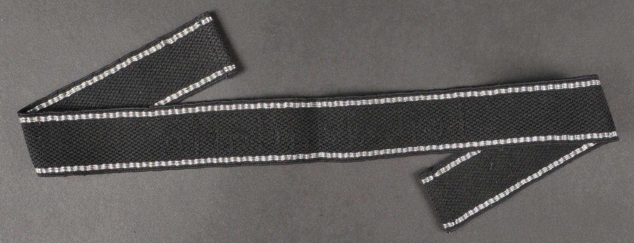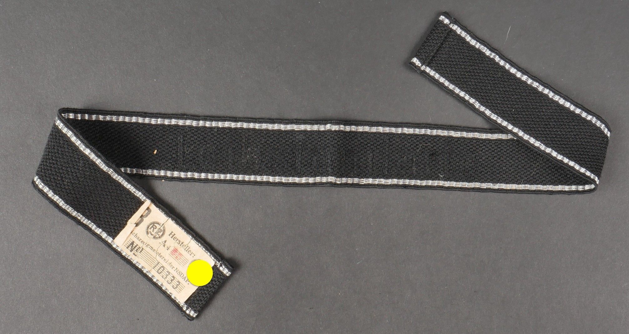 SS arm band. Black cotton fabric. Double silver piping around the edges of the arm band. Blank. Full length. Label marked B SS, number 10333, manufacturer's code illegible. Length 45cm. Some wear and patina. Condition II+. SS Armband Made of black cotton with double silver piping along both edges. Unissued and complete. Label marked B SS number 10333 manufacturer code illegible. Length 45 cm. Some wear and patina consistent with age. Condition II+.