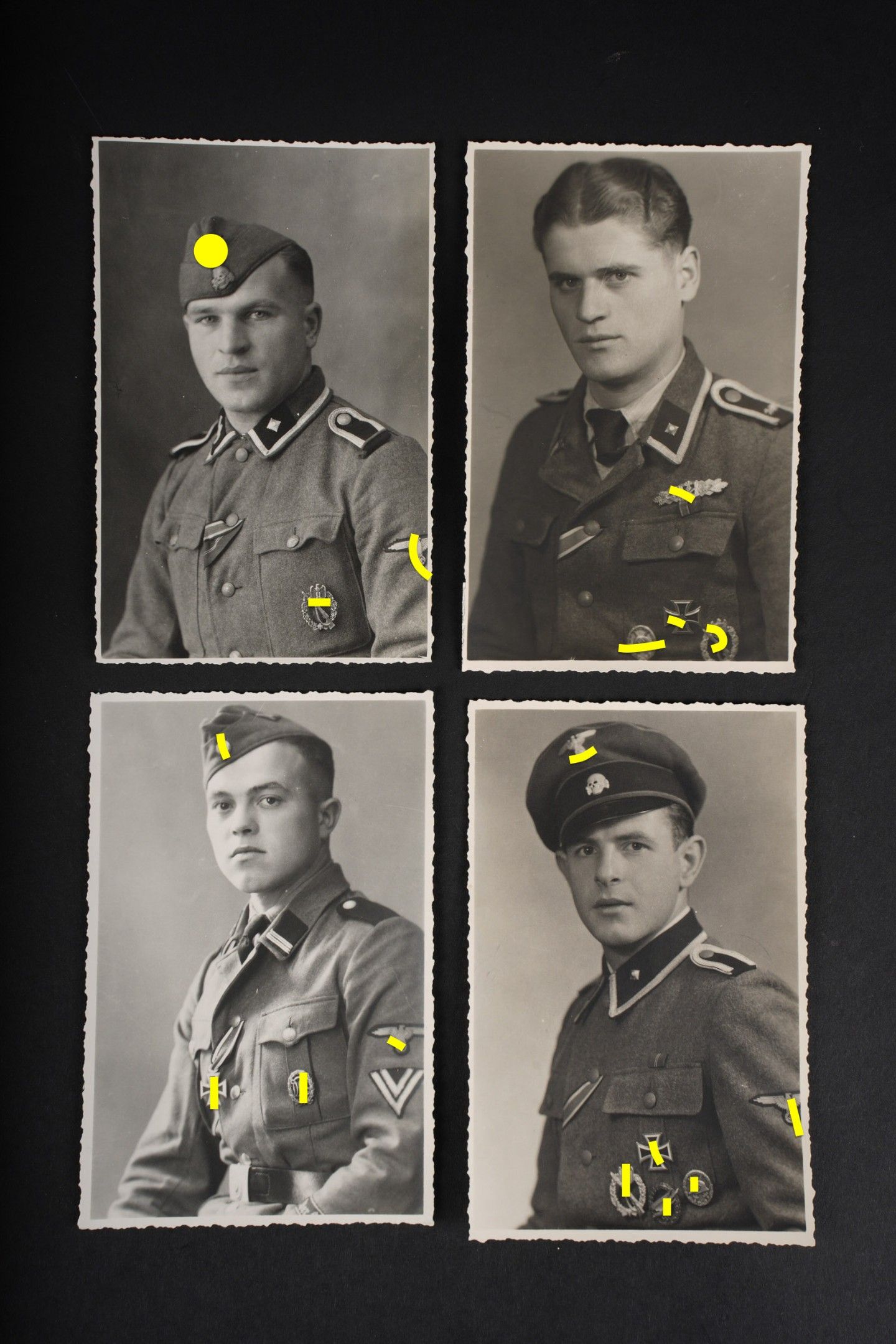 SS photos. Including a photo of a Rottenführer. A photo of a Sturmmann of the Totenkopf. A photo of an Unterscharführer. A photo of an Unterscharführer. A photo of an Unterscharführer. Back of the parts marked Echte Photographie. To note a light wear and patina of the parts. Condition I-. SS Photographs Including a photo of a Rottenführer a photo of a Sturmmann from the Totenkopf Division and three photos of Unterscharführer. Backs marked Echte Photographie. Light wear and patina consistent with age. Condition I-.