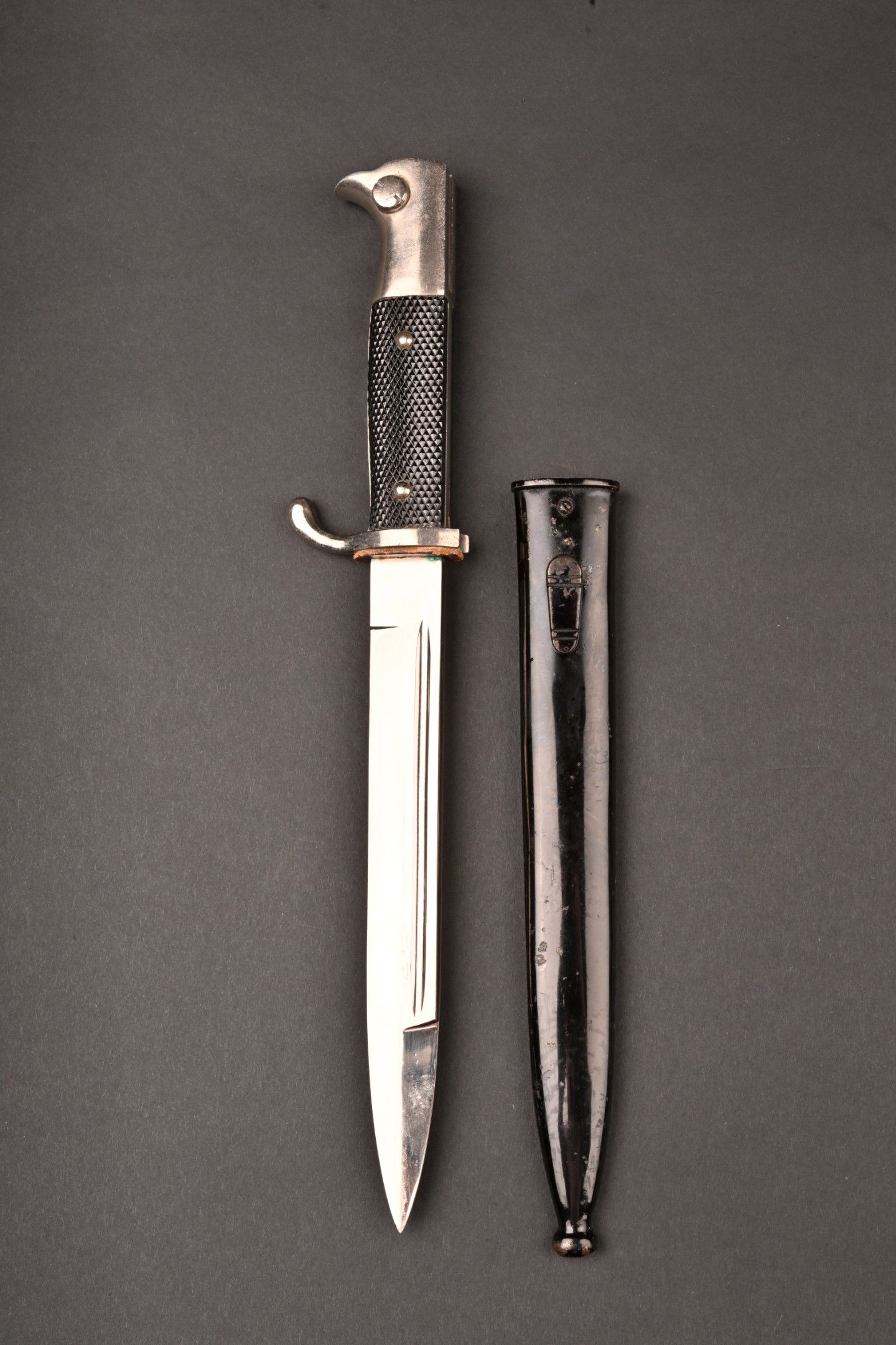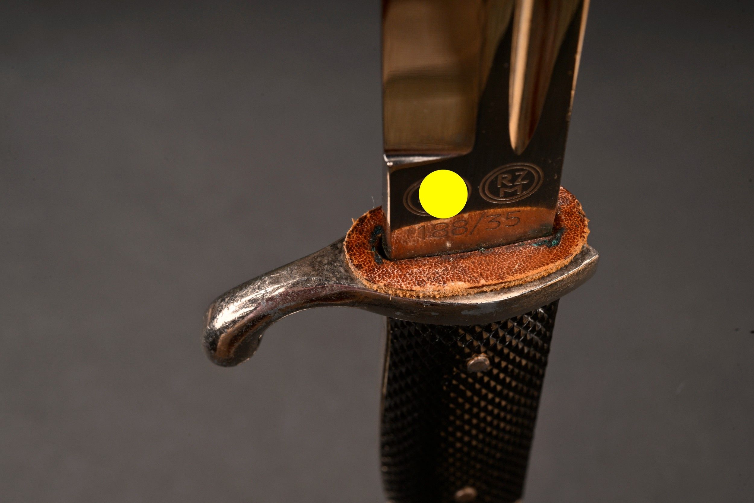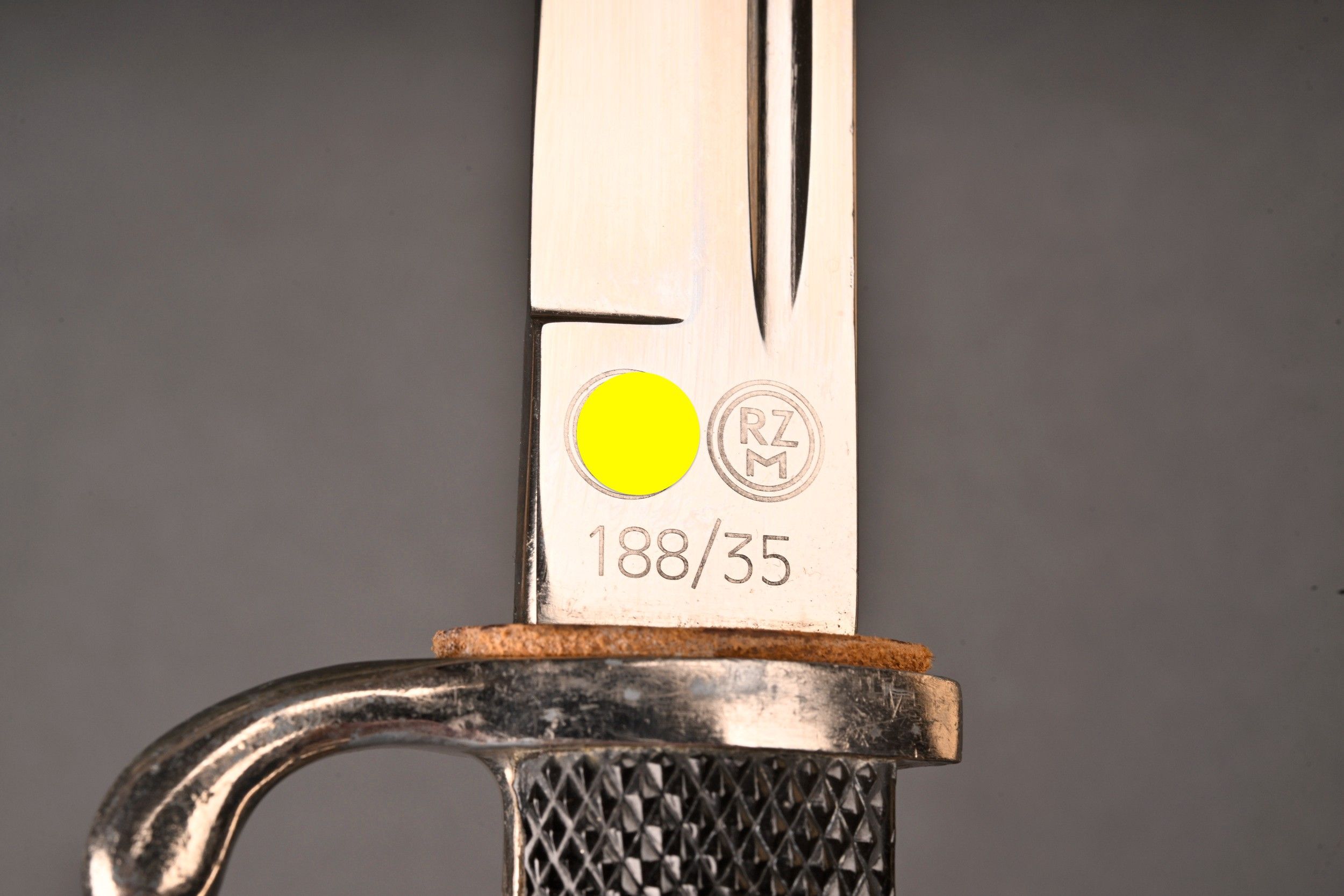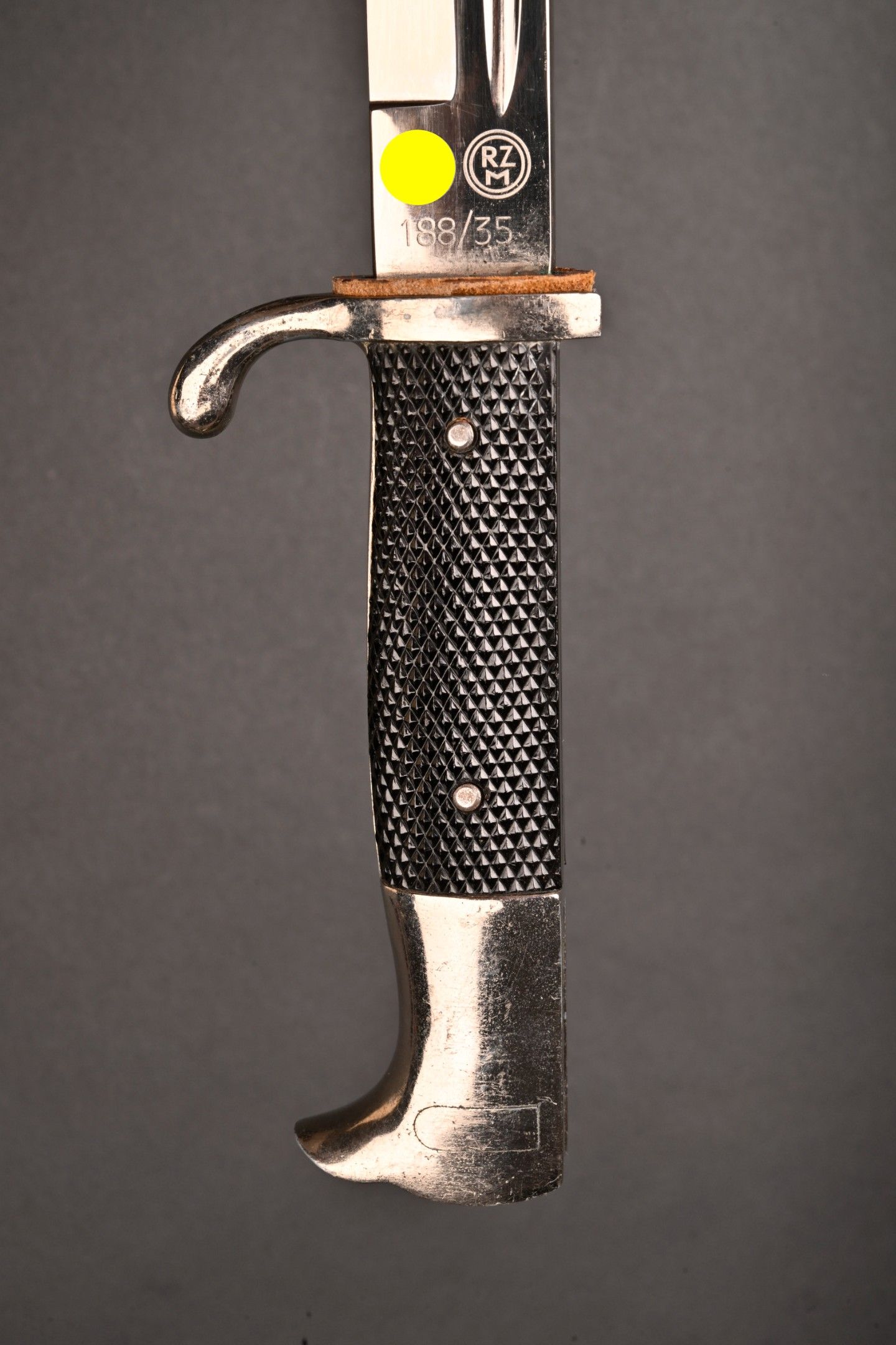 SS exit bayonet, model KS 98. The manufacturer of this exit bayonet with 20 cm blade and active push-button has not yet been identified, but its purpose is clear from its marking, which is also known from the blade of some 1933 model service daggers. This bayonet was issued in 1935, i.e. at the very beginning of the creation of the SS-Verfügungstruppe (SS-VT), for whose personnel it was clearly intended. The handle has two riveted black bakelite plates in perfect condition. The nickel plating is clearly visible, as is the piece of leather under the guard designed to seal the scabbard. The blade is also in perfect condition, with the only maker's marks being the double runes, the RZM logo and the numbers 188/35. The scabbard is in black painted steel. On the reverse side, there is a slight impact on the lower part of the scabbard, attesting to its use. The paint is 90% intact. This bayonet was intended to be worn during outings and permissions granted to the very first members of what was soon to become the Waffen-SS. An uncommon item. SS Dress Bayonet Model KS 98 Maker not identified but the marking on the blade clearly indicates Waffen SS use and corresponds to markings found on some early Model 1933 service daggers. This short bayonet of 20 cm blade length was introduced in 1935 at the beginning of the SS Verfügungstruppe (SS-VT) and was intended for personnel of these units. The grip has two black bakelite plates riveted and in perfect condition. The nickel plating of the metal parts is complete and the leather washer under the guard is intact. The blade is in excellent condition with only the SS double rune logo the RZM mark and the numbers 188/35 engraved near the ricasso. The steel scabbard retains 90% of its black paint with a small dent near the lower section showing service use. This type of bayonet was carried during leaves and dress occasions by the first members of what would soon become the Waffen SS. Rare piece.