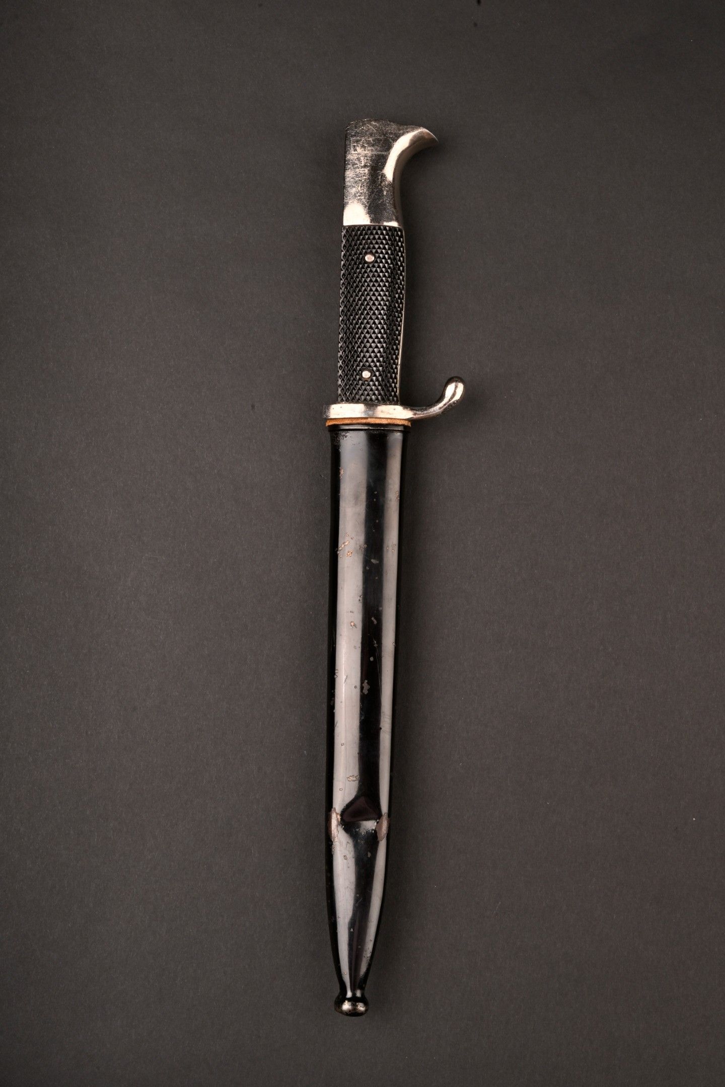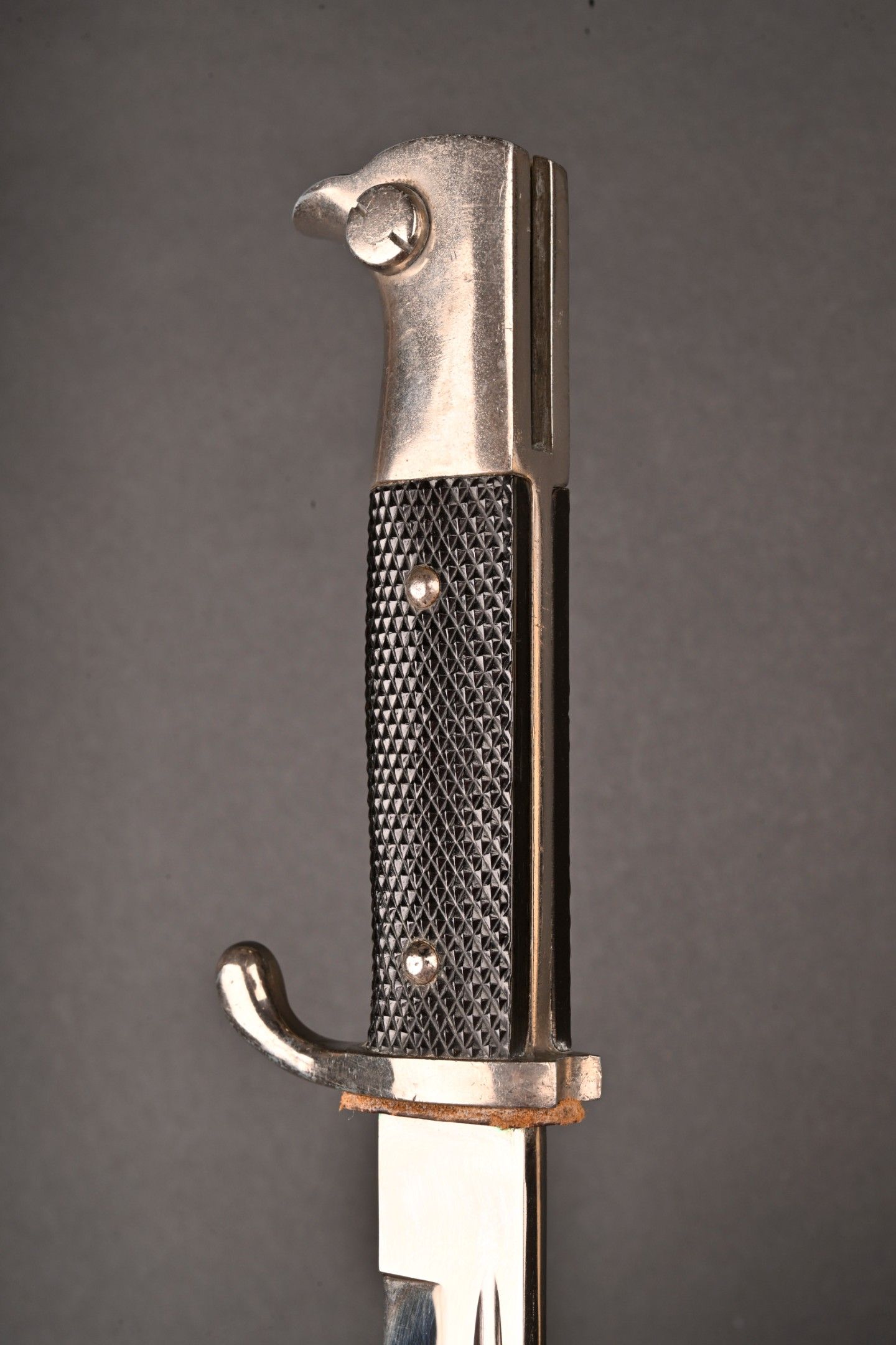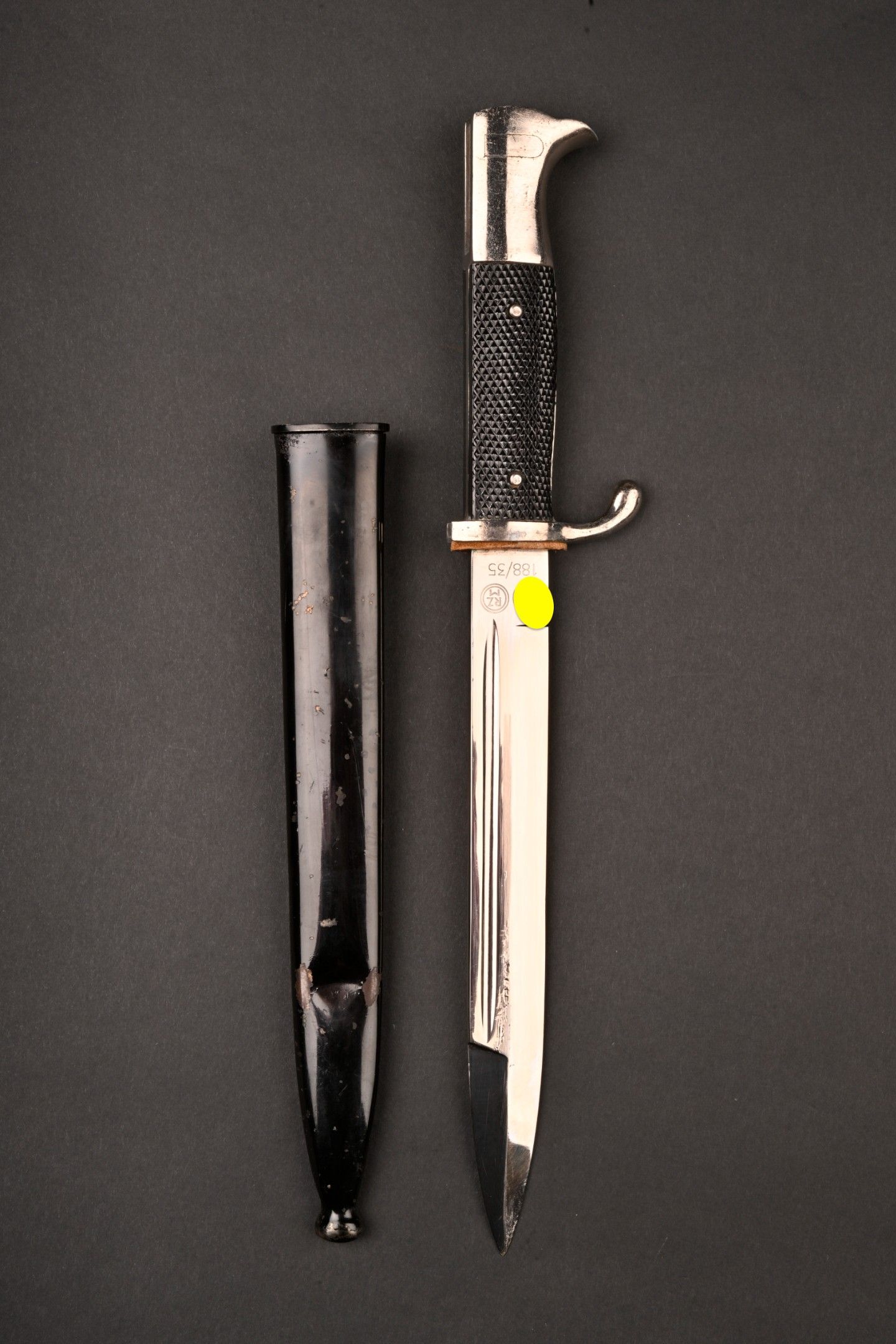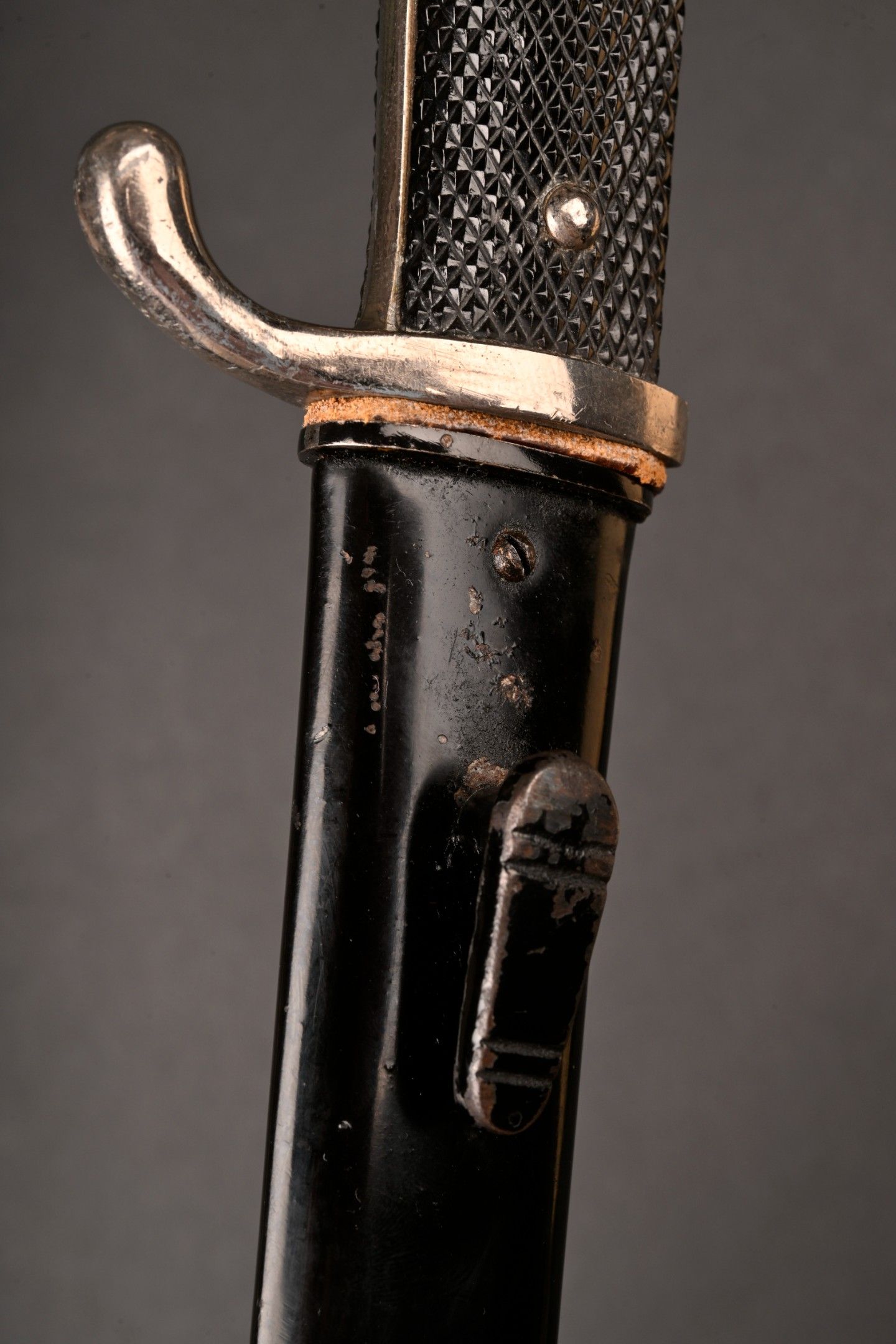 SS exit bayonet, model KS 98. The manufacturer of this exit bayonet with 20 cm blade and active push-button has not yet been identified, but its purpose is clear from its marking, which is also known from the blade of some 1933 model service daggers. This bayonet was issued in 1935, i.e. at the very beginning of the creation of the SS-Verfügungstruppe (SS-VT), for whose personnel it was clearly intended. The handle has two riveted black bakelite plates in perfect condition. The nickel plating is clearly visible, as is the piece of leather under the guard designed to seal the scabbard. The blade is also in perfect condition, with the only maker's marks being the double runes, the RZM logo and the numbers 188/35. The scabbard is in black painted steel. On the reverse side, there is a slight impact on the lower part of the scabbard, attesting to its use. The paint is 90% intact. This bayonet was intended to be worn during outings and permissions granted to the very first members of what was soon to become the Waffen-SS. An uncommon item. SS Dress Bayonet Model KS 98 Maker not identified but the marking on the blade clearly indicates Waffen SS use and corresponds to markings found on some early Model 1933 service daggers. This short bayonet of 20 cm blade length was introduced in 1935 at the beginning of the SS Verfügungstruppe (SS-VT) and was intended for personnel of these units. The grip has two black bakelite plates riveted and in perfect condition. The nickel plating of the metal parts is complete and the leather washer under the guard is intact. The blade is in excellent condition with only the SS double rune logo the RZM mark and the numbers 188/35 engraved near the ricasso. The steel scabbard retains 90% of its black paint with a small dent near the lower section showing service use. This type of bayonet was carried during leaves and dress occasions by the first members of what would soon become the Waffen SS. Rare piece.