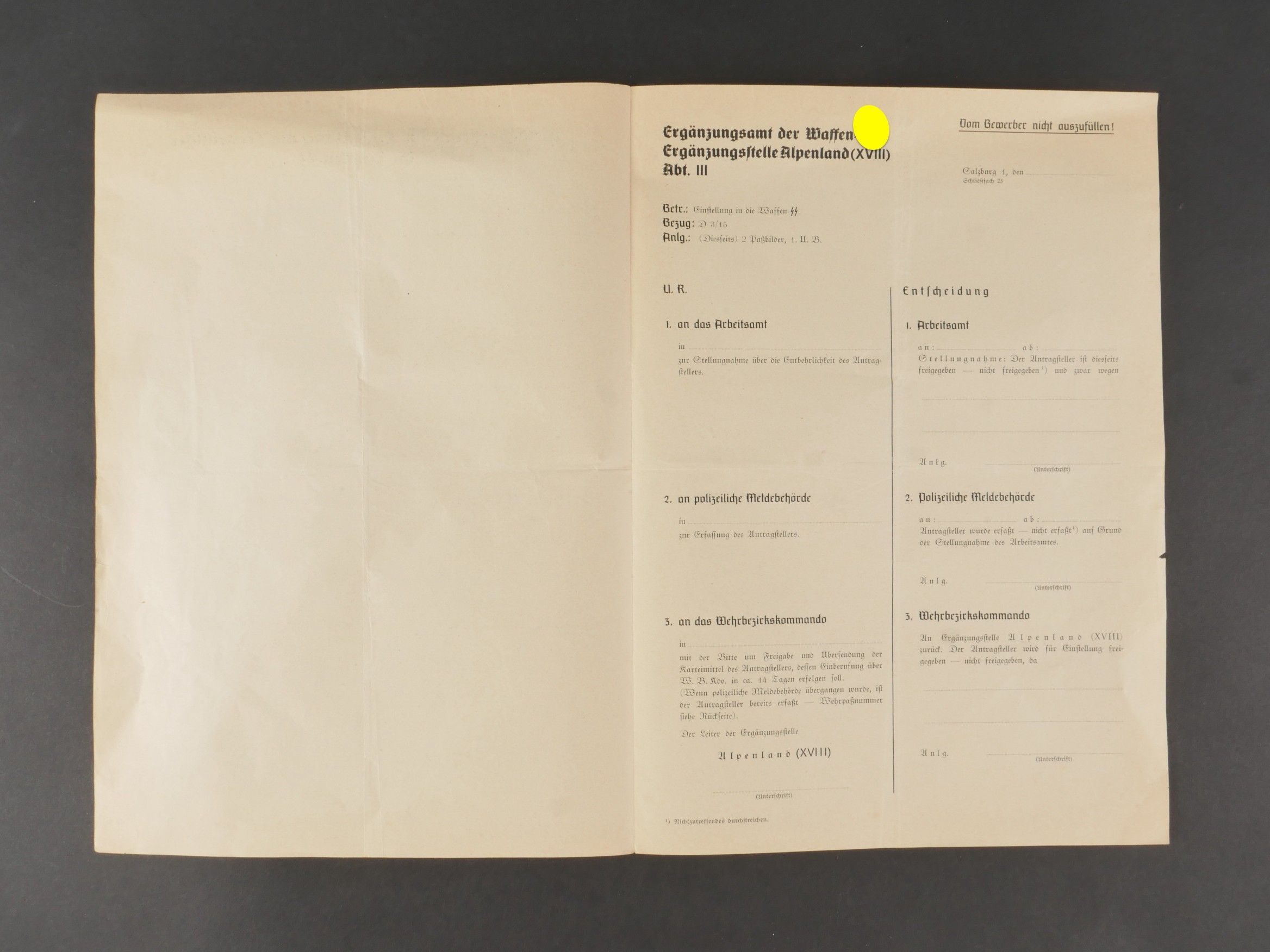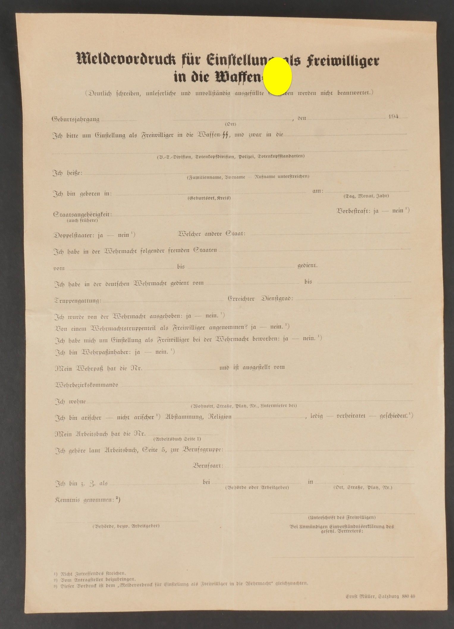 SS registration document. Paper, blank. Titled Meldevordruck für Einstellung als Freiwilliger in die Waffen SS. Slight wear and patina. Condition I-. SS Registration Document Blank paper form titled Meldevordruck für Einstellung als Freiwilliger in die Waffen SS. Light wear and patina consistent with age. Condition I-.