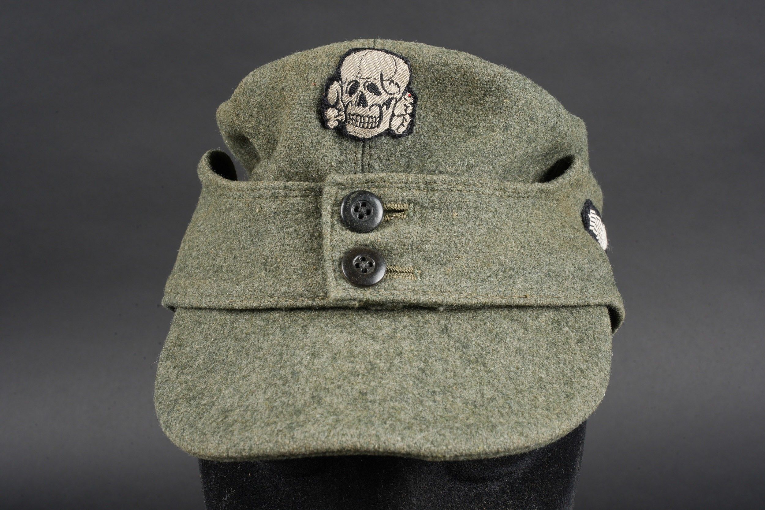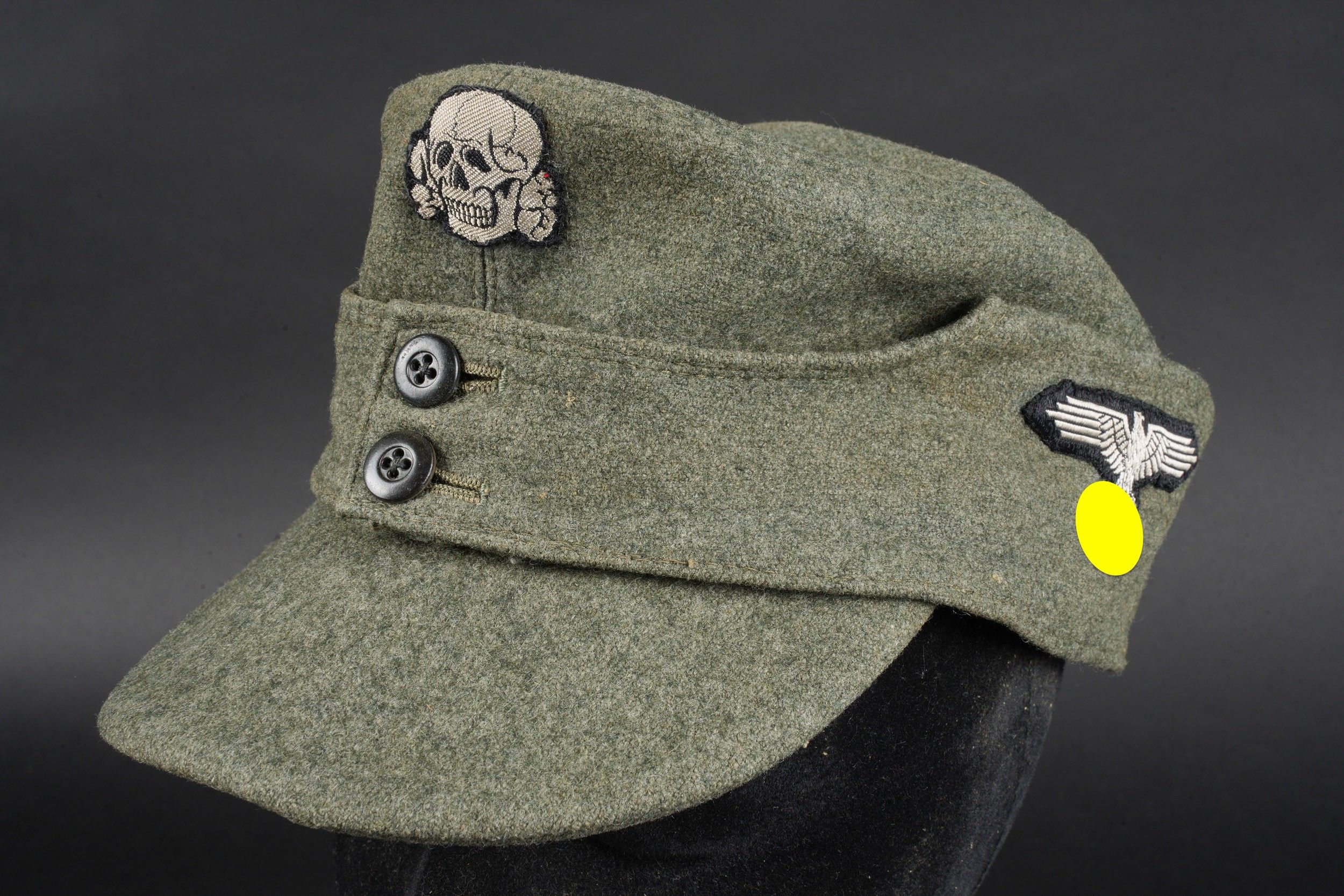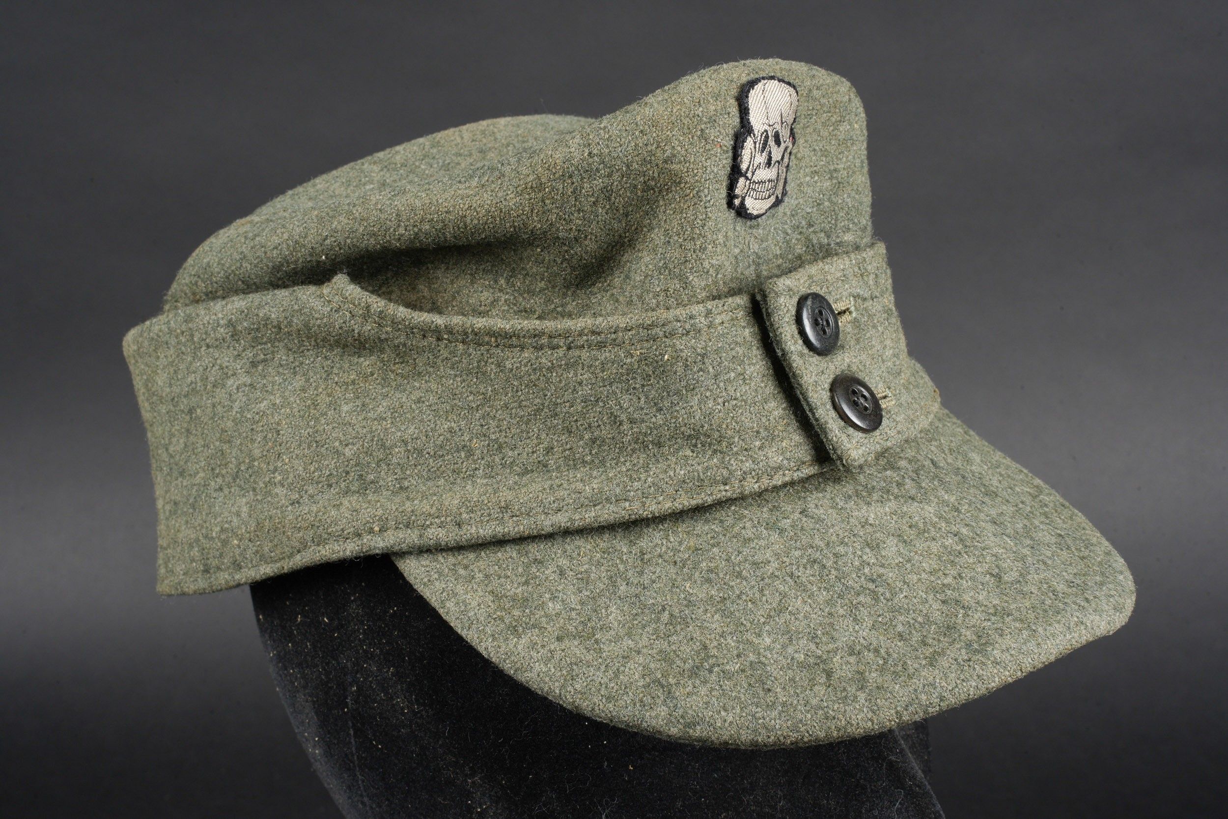 M-43 SS cap. In Feldgrau cloth. Two bakelite buttons closing the flaps. Bevo skull and crossbones hand-stitched to the front of the cap. Hand-stitched Bevo eagle on the left side of the headdress. Lined with black cotton fabric, no visible markings. Some wear and patina. Condition II+. SS M43 Field Cap Made of Feldgrau cloth with two brown bakelite buttons. Hand-sewn Bevo skull on the front and hand-sewn Bevo eagle on the left side. Black cotton interior without visible markings. Some wear and patina consistent with age. Condition II+.