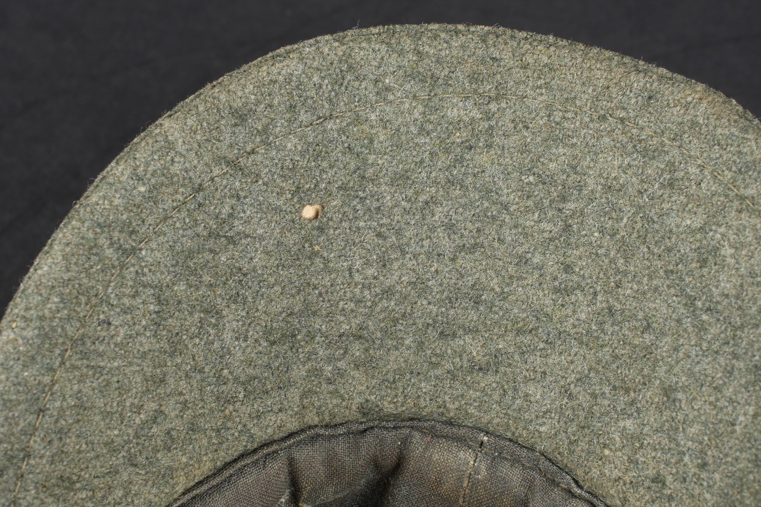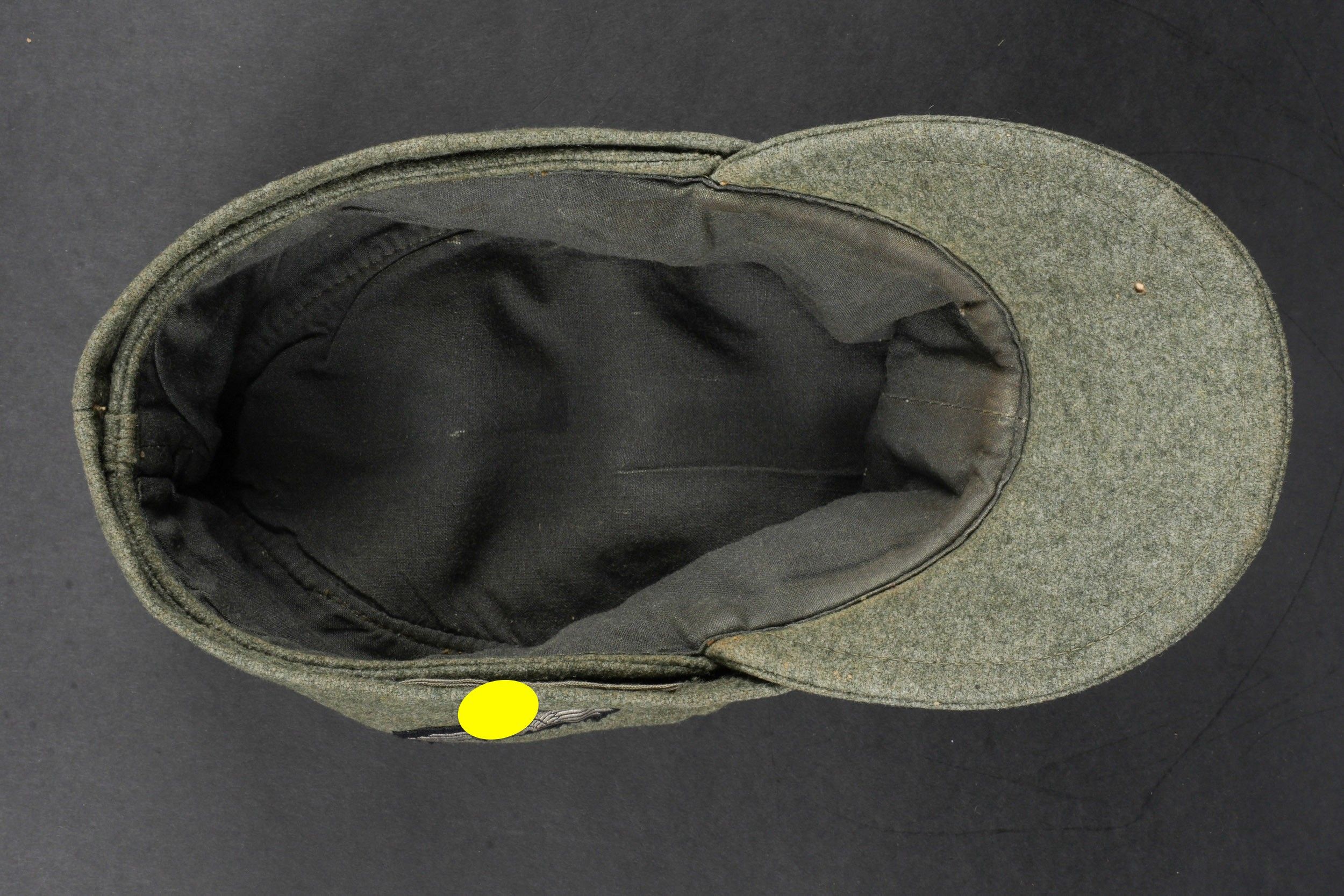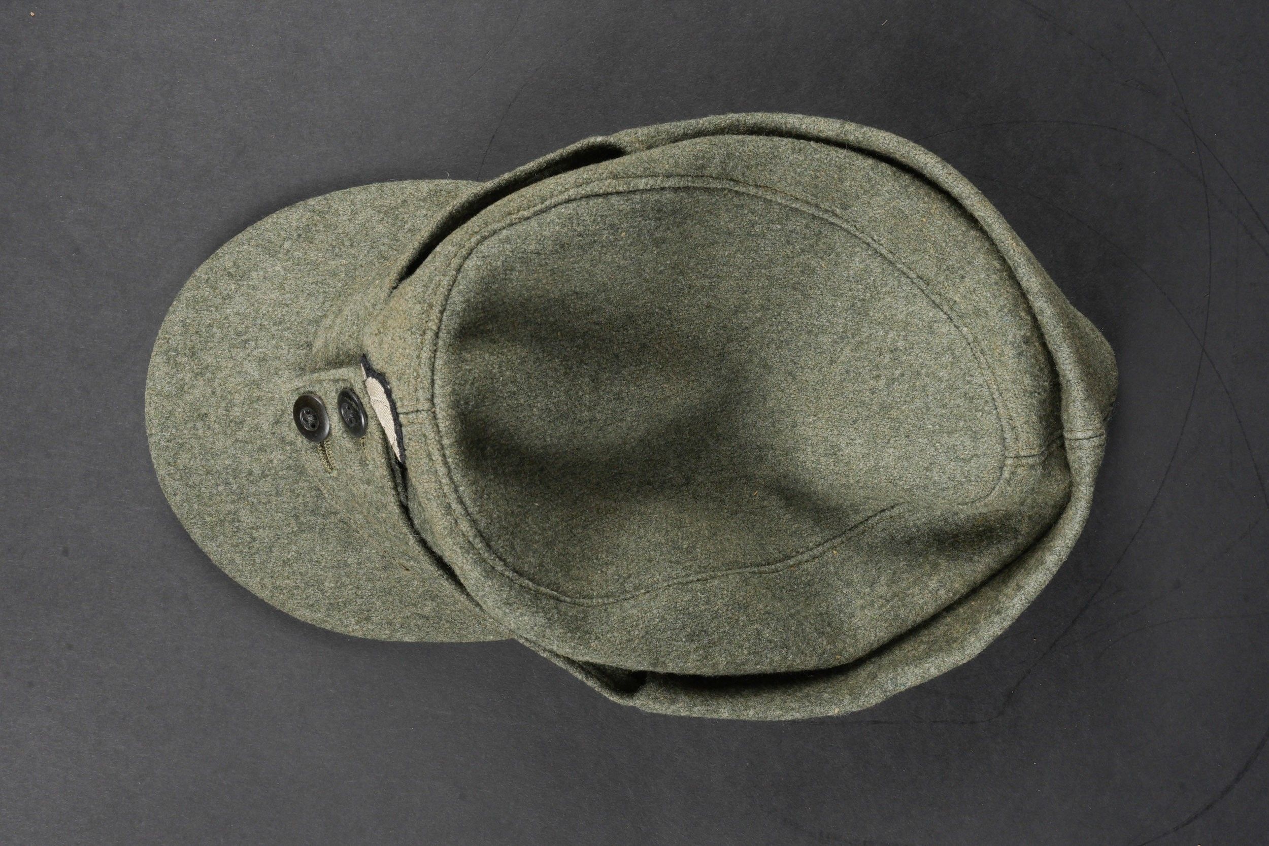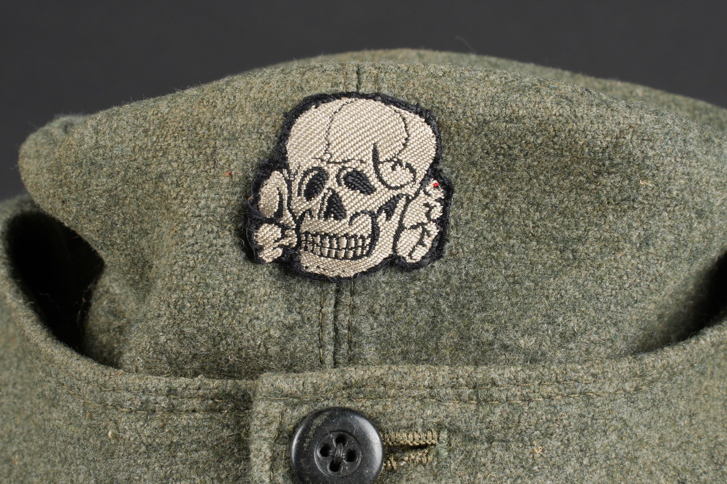 M-43 SS cap. In Feldgrau cloth. Two bakelite buttons closing the flaps. Bevo skull and crossbones hand-stitched to the front of the cap. Hand-stitched Bevo eagle on the left side of the headdress. Lined with black cotton fabric, no visible markings. Some wear and patina. Condition II+. SS M43 Field Cap Made of Feldgrau cloth with two brown bakelite buttons. Hand-sewn Bevo skull on the front and hand-sewn Bevo eagle on the left side. Black cotton interior without visible markings. Some wear and patina consistent with age. Condition II+.