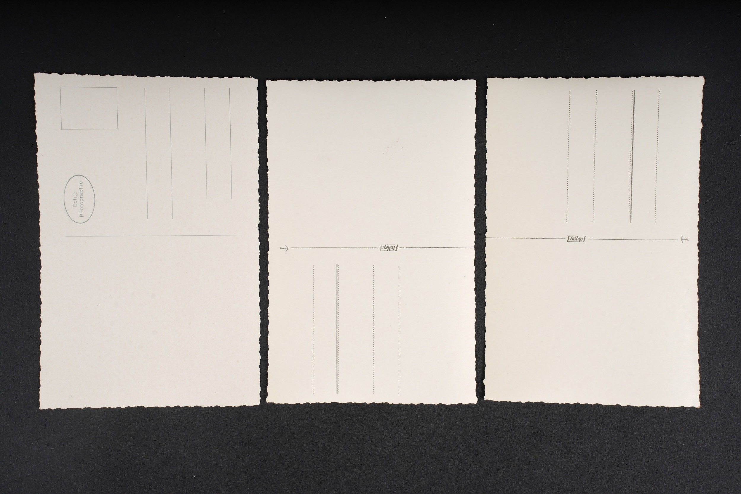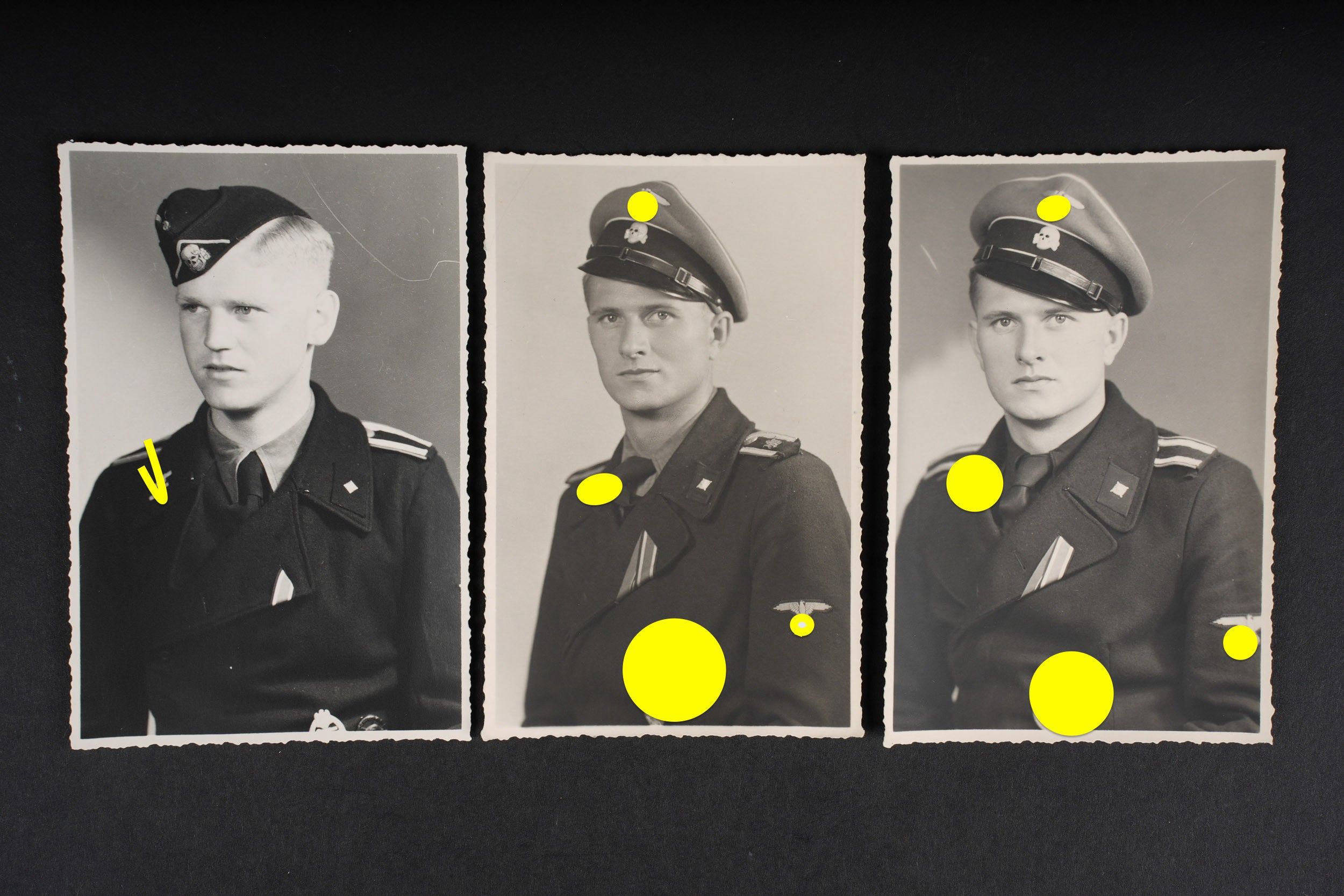SS Panzer postcard photographs. Including a photo of an Unterscharführer in a double-breasted jacket. A photo of a LAH Unterscharführer in a double-breasted jacket. A photograph of an Unterscharführer of the SS Panzer units. Back of the pieces marked Echte Photographie. To note a light wear and patina of the parts. Condition I-. SS Panzer Postcard Photos Including a photo of an Unterscharführer wearing a wrap-over jacket a photo of an Unterscharführer from the LAH in a similar jacket and a photo of an Unterscharführer from an SS Panzer unit. Backs marked Echte Photographie. Light wear and patina consistent with age. Condition I-.