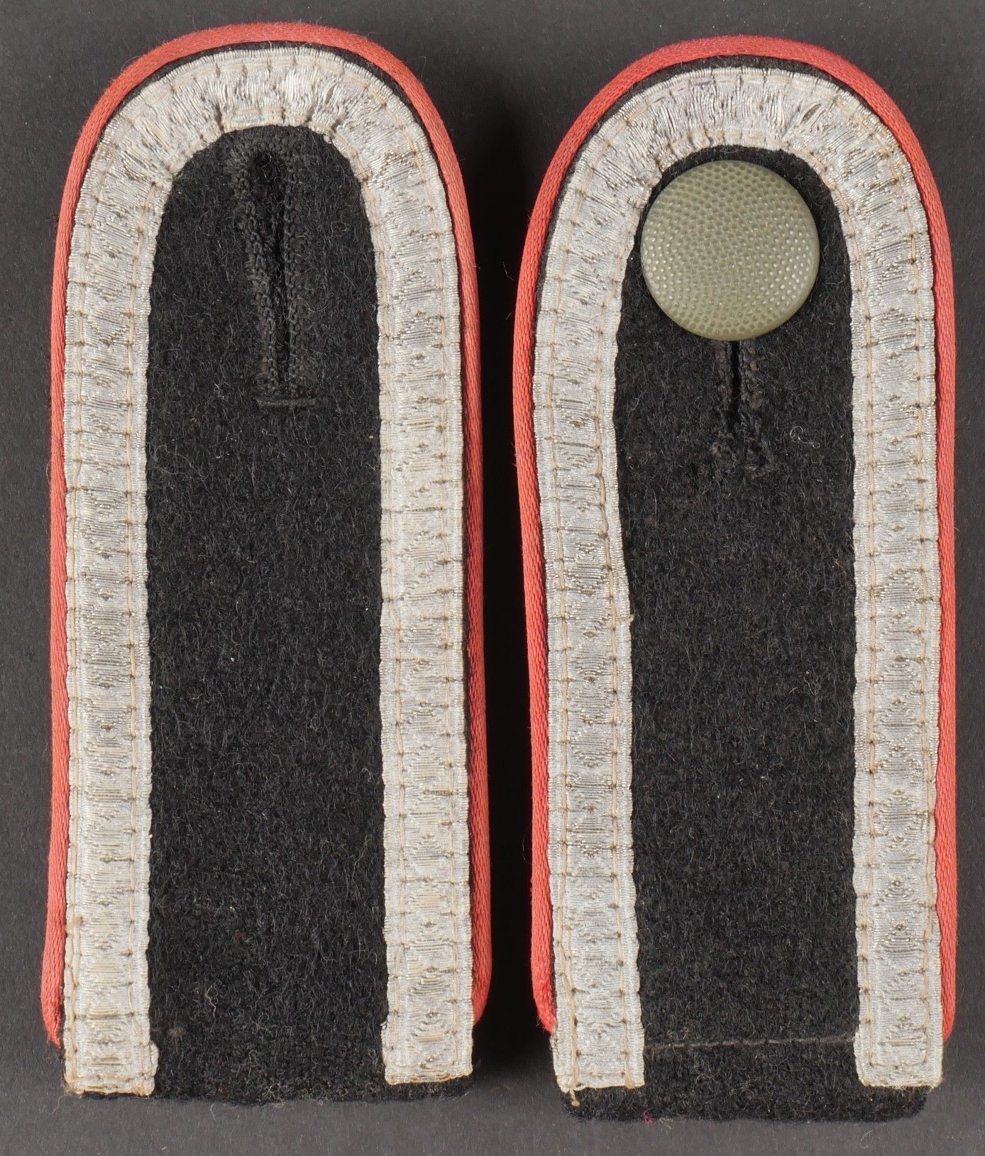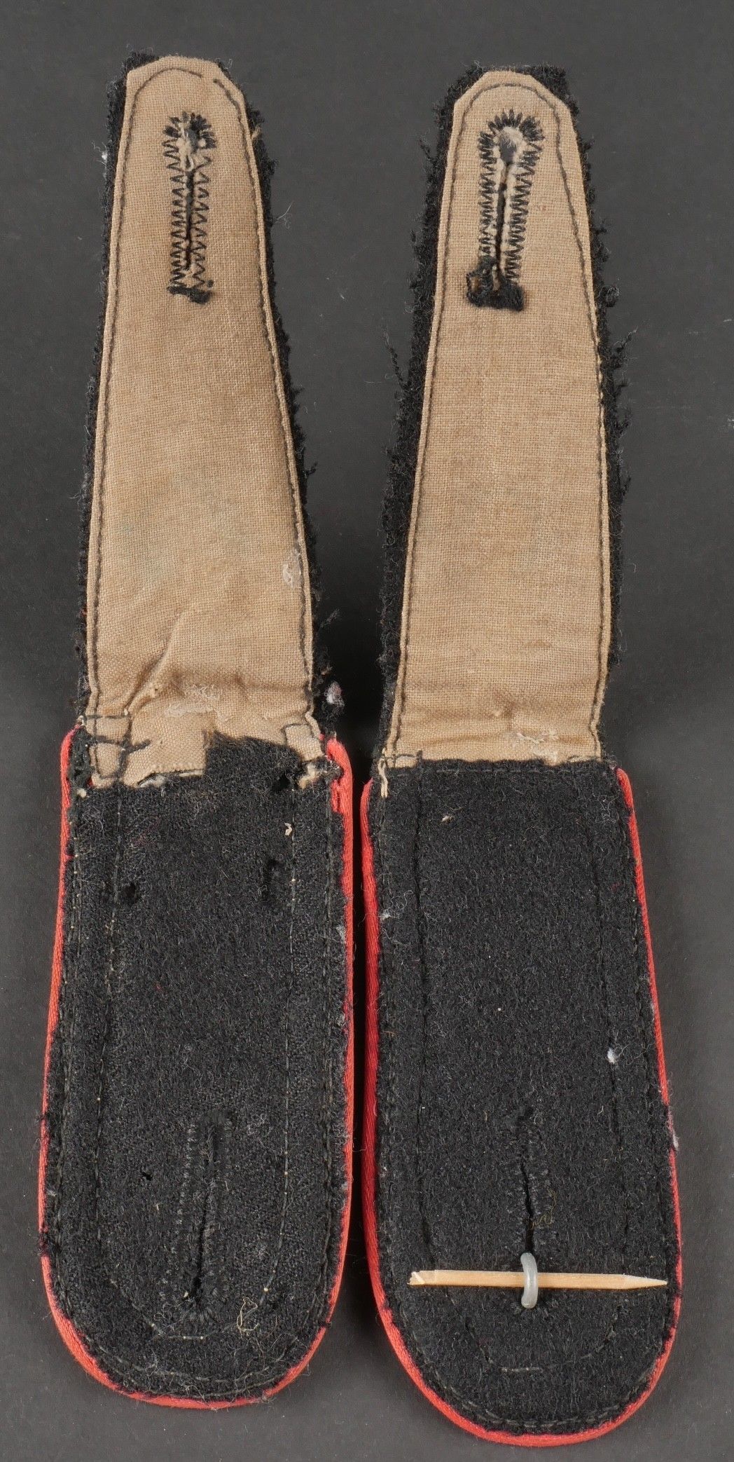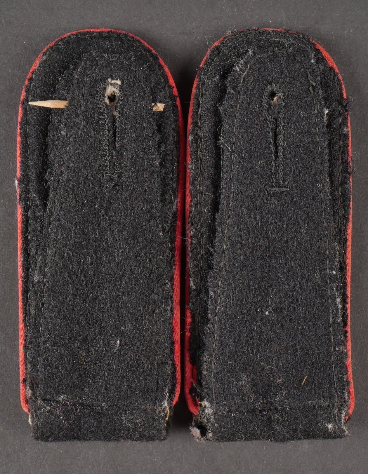 SS Panzer shoulder straps. Uniform pair in black cloth. Pink armoured unit piping around the shoulder straps. Silver braid running partly around the pieces. Light grey cotton lining. One grained metal button is present, and in 98% original colour. Rank of Unterscharführer. Some wear and patina. Condition II+. SS Panzer Shoulder Boards Matching pair made of black cloth with pink piping for armored units and partial silver braid around the edges. Light grey cotton lining. Metal pebbled buttons retain about 98% of original colour. Rank of Unterscharführer. Some wear and patina consistent with age. Condition II+.