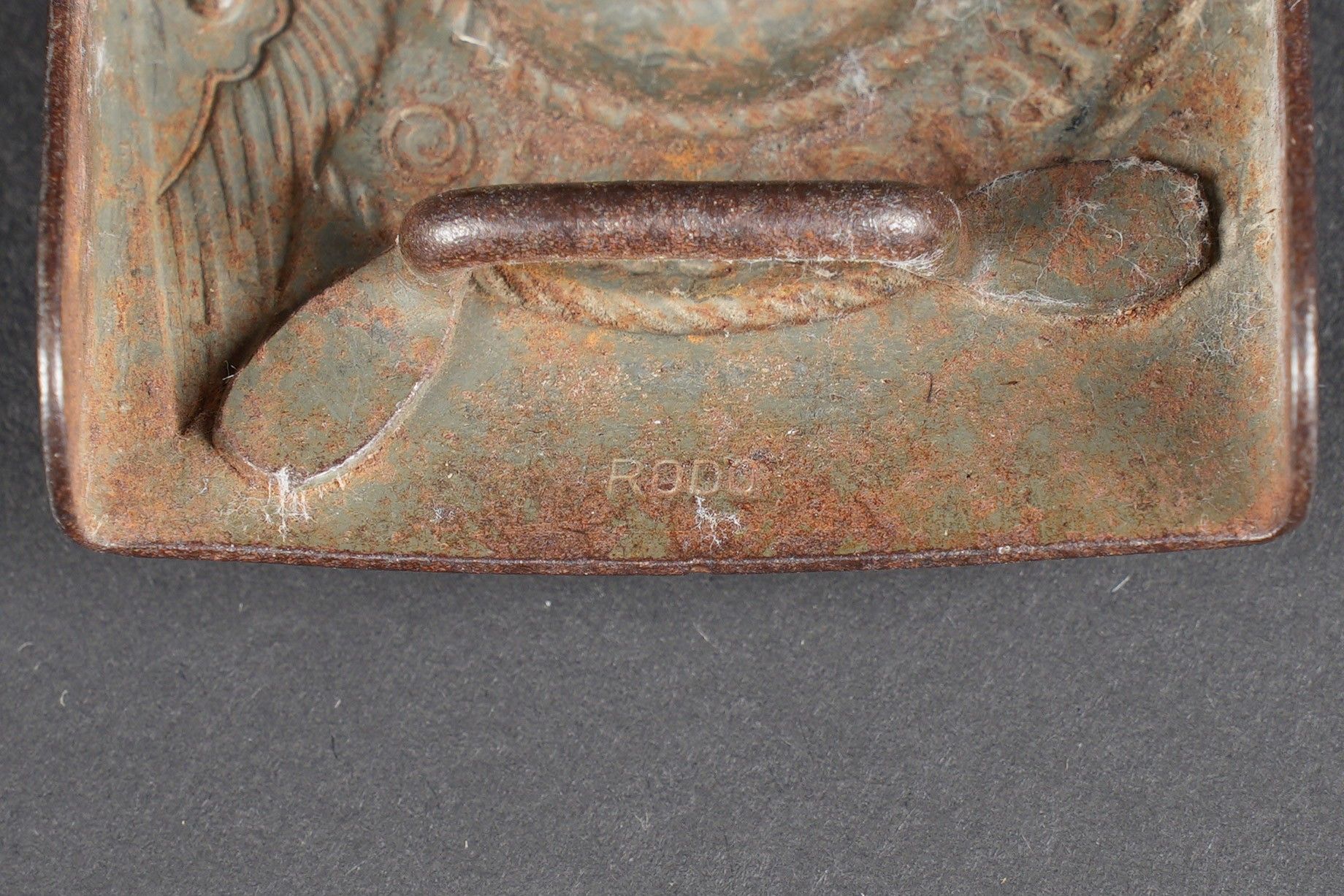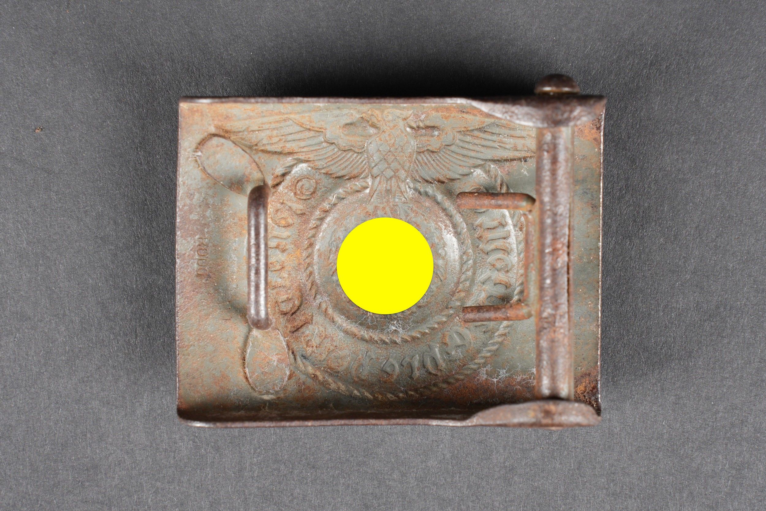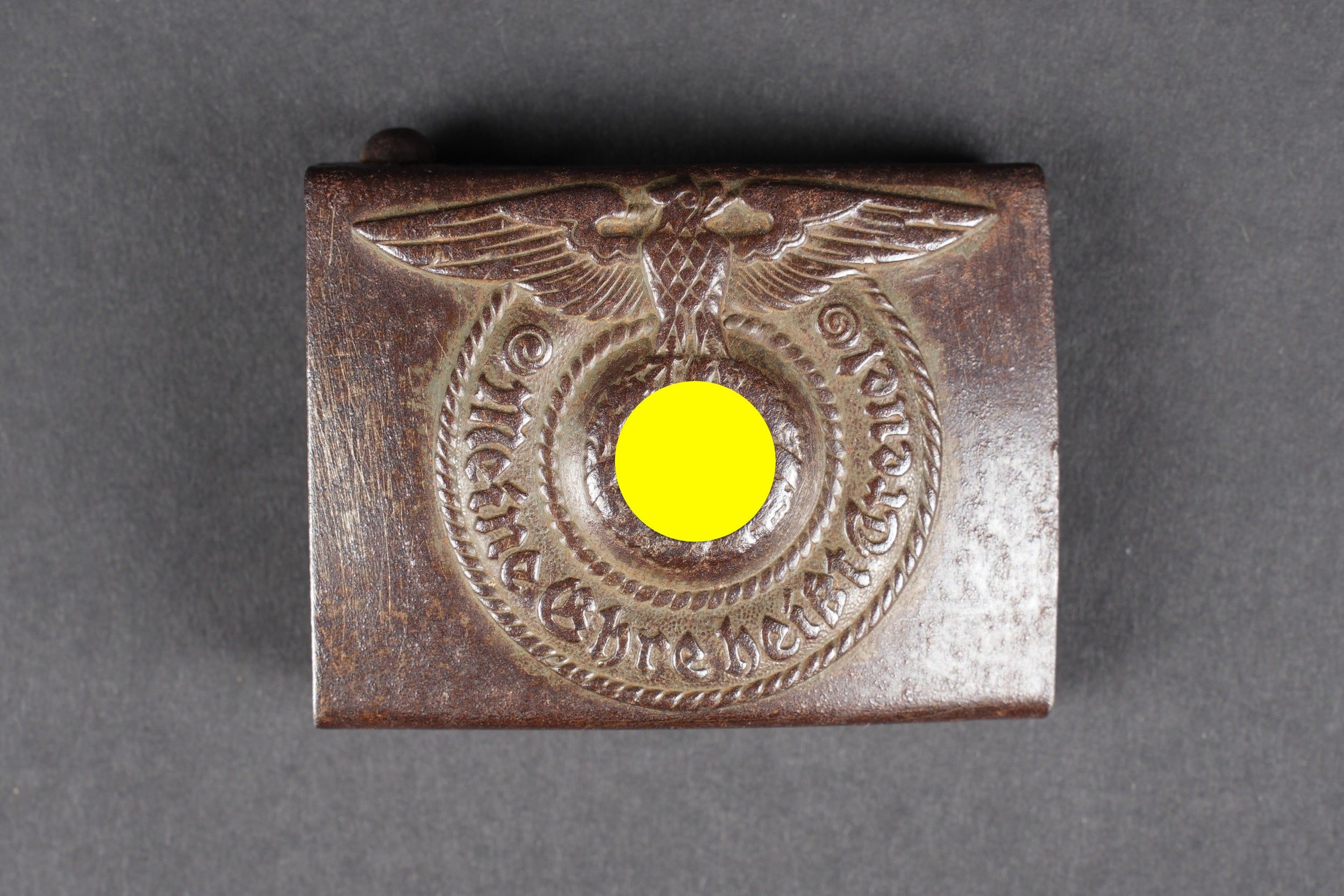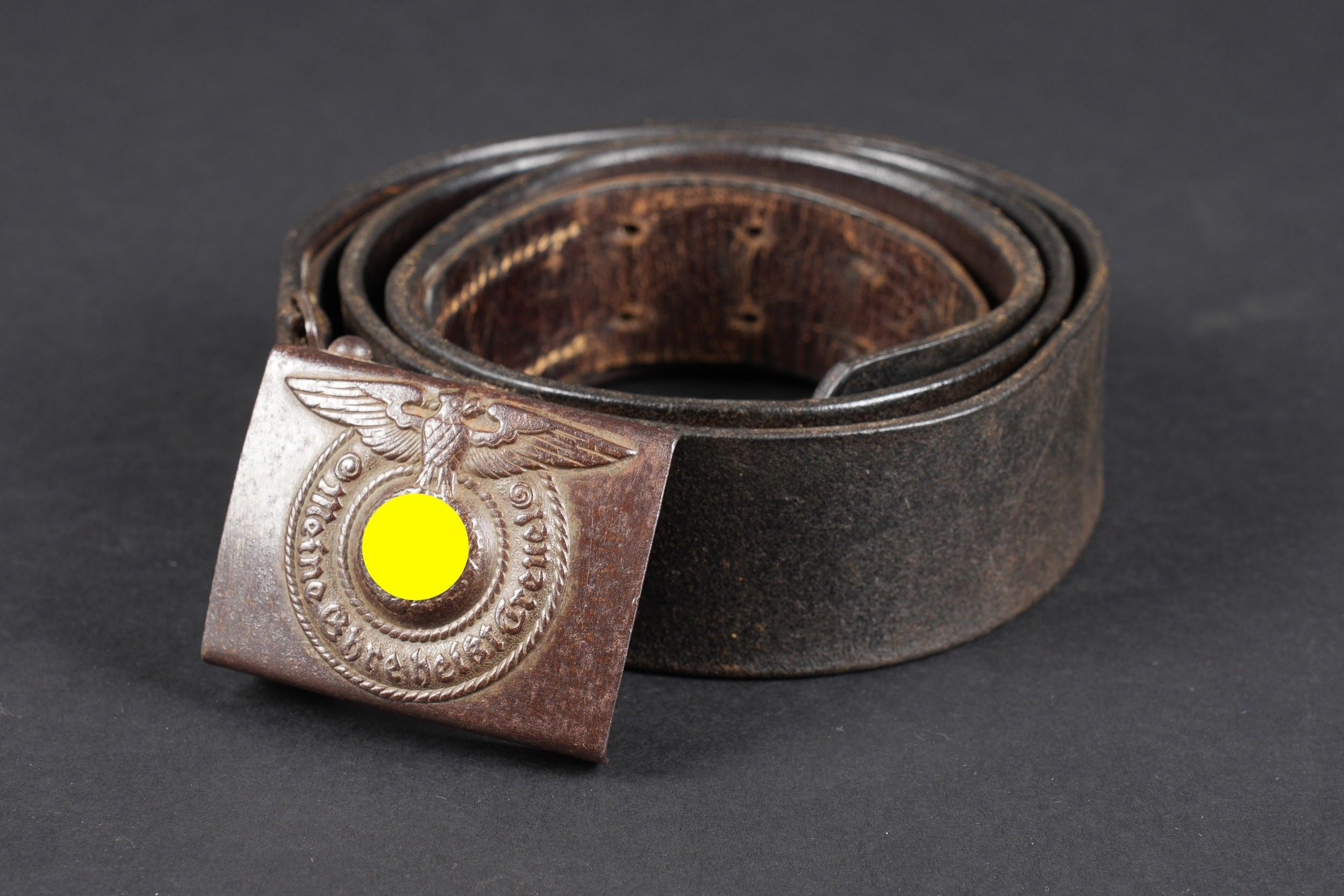 SS belt. Black leather belt with metal buckle. The belt markings are partially illegible. Complete adjustment tab. Size 100. Metal SS belt buckle, 20% Feldgrau paint residue. Made by RODO. Some wear and oxidation. Condition II+. SS Belt Black leather belt with metal buckle. Belt markings partially illegible. Adjustment tab complete. Size 100. SS metal buckle retaining about 20% of its Feldgrau paint. Maker RODO. Some wear and oxidation consistent with age. Condition II+.