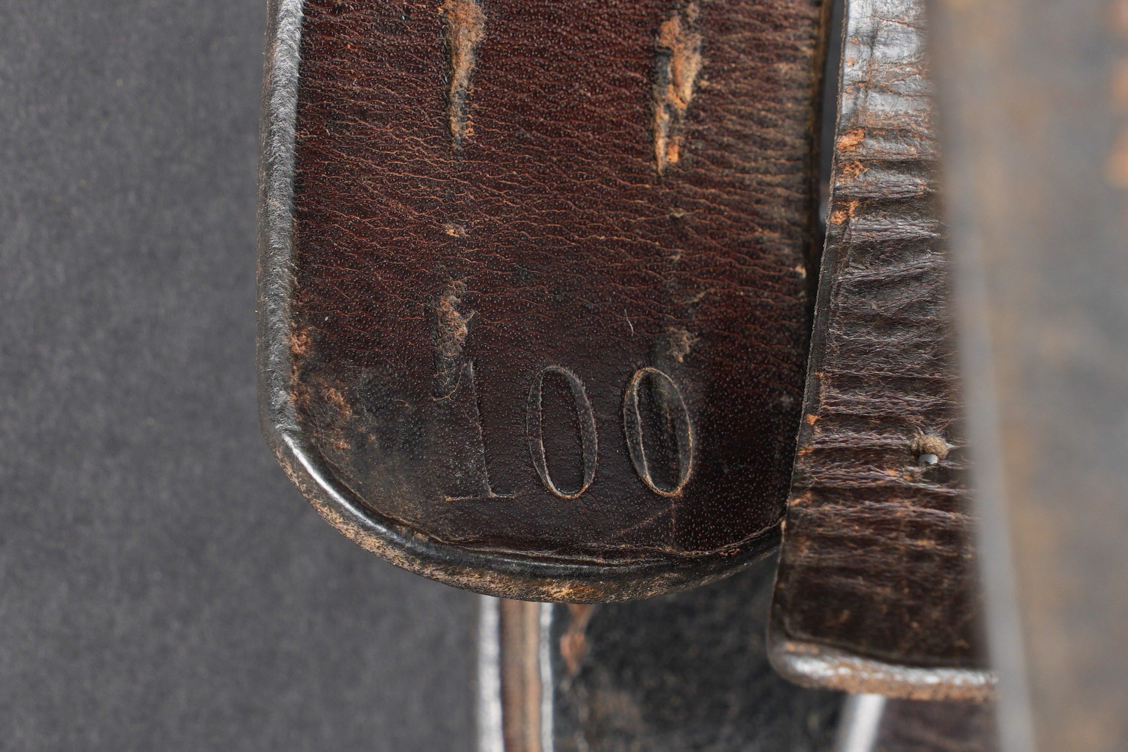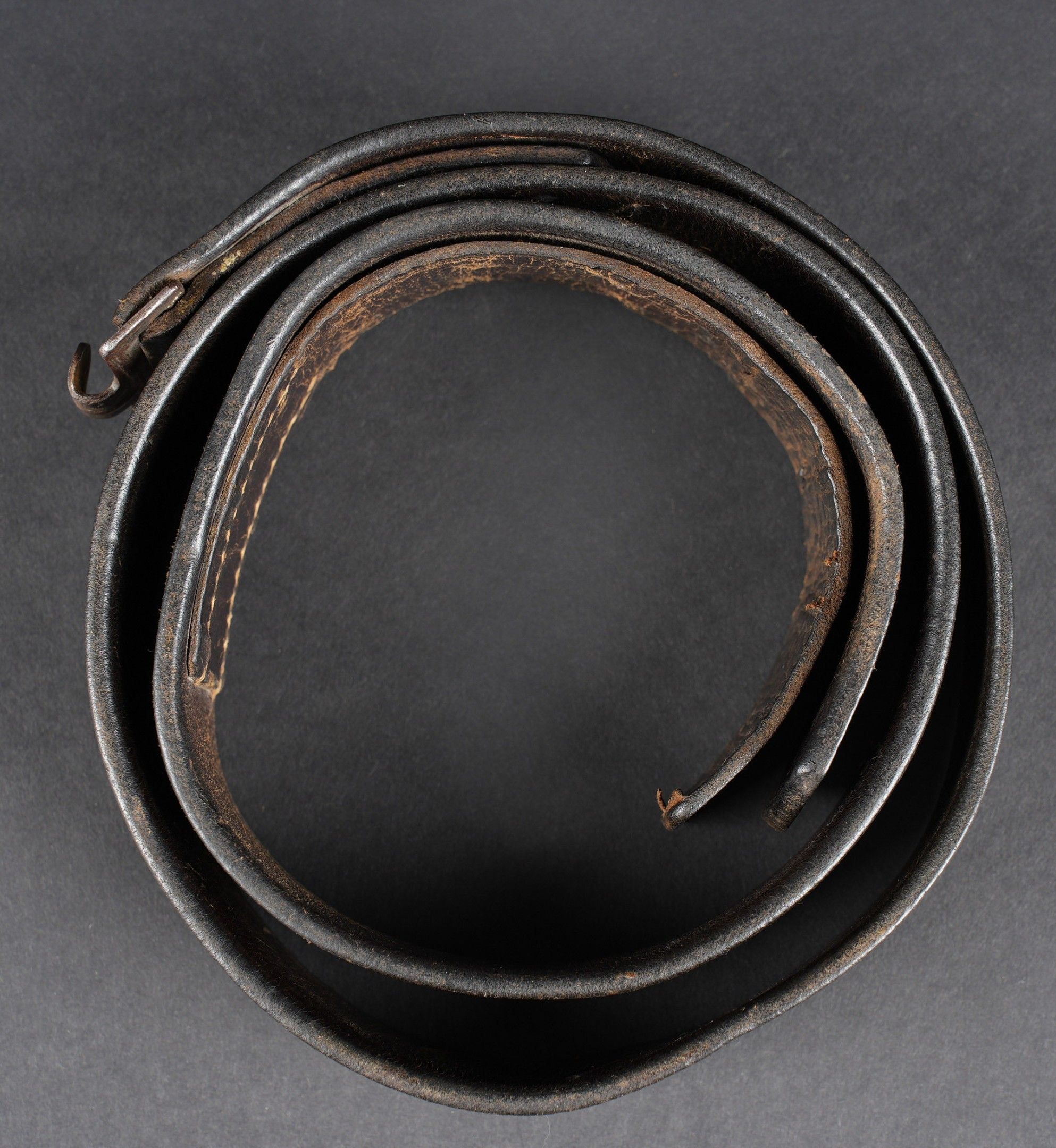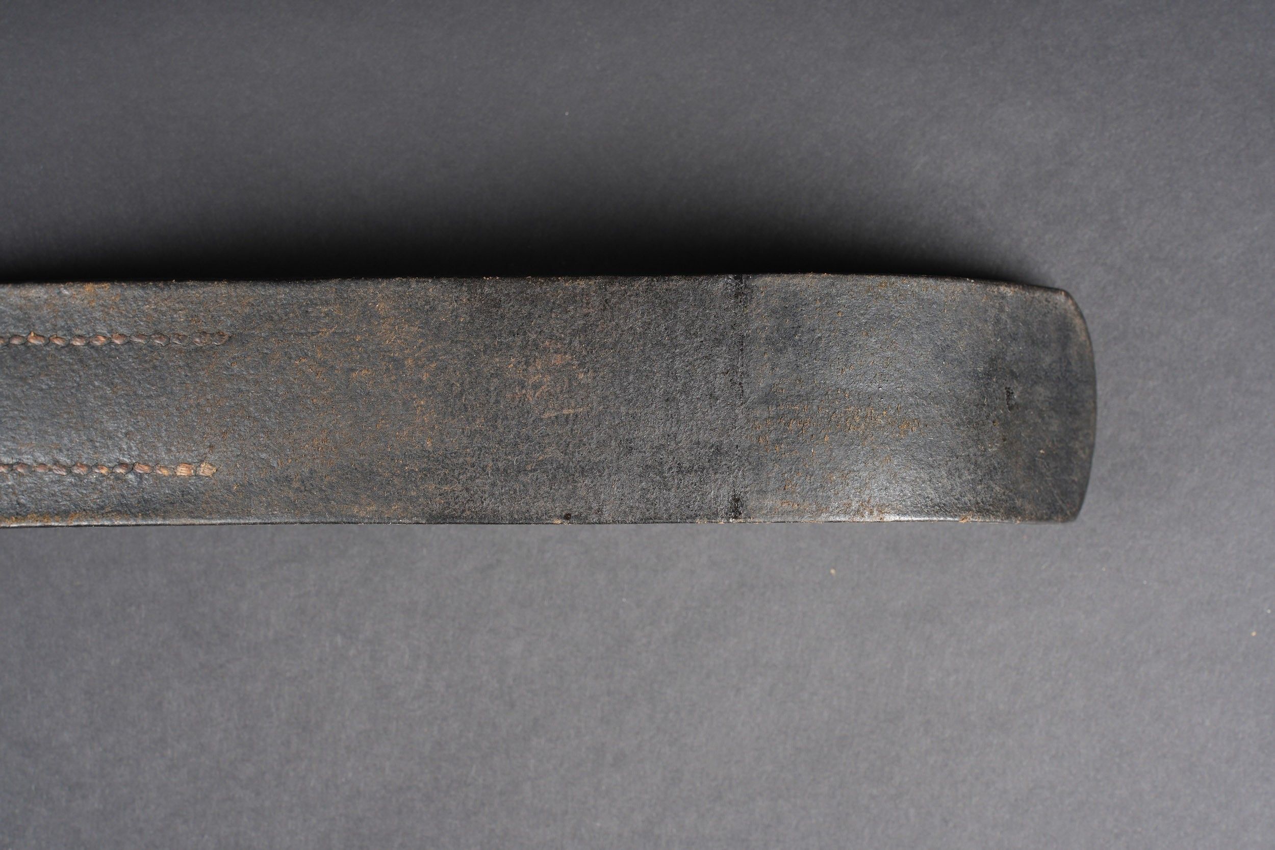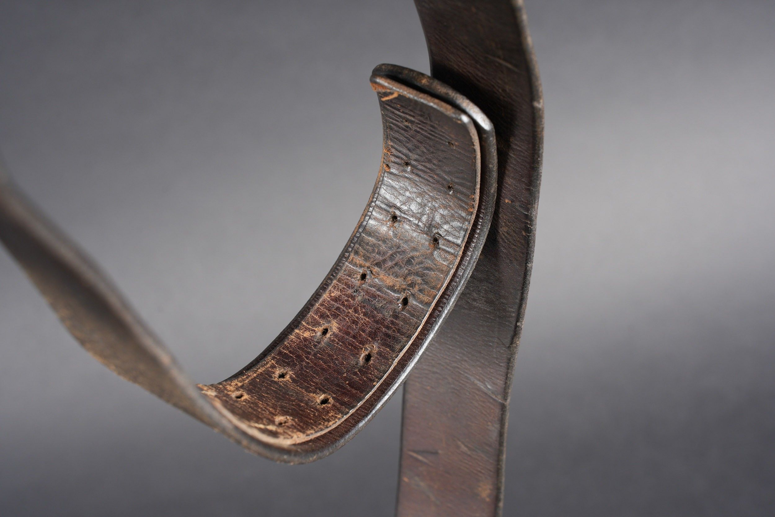 SS belt. Black leather belt with metal buckle. The belt markings are partially illegible. Complete adjustment tab. Size 100. Metal SS belt buckle, 20% Feldgrau paint residue. Made by RODO. Some wear and oxidation. Condition II+. SS Belt Black leather belt with metal buckle. Belt markings partially illegible. Adjustment tab complete. Size 100. SS metal buckle retaining about 20% of its Feldgrau paint. Maker RODO. Some wear and oxidation consistent with age. Condition II+.