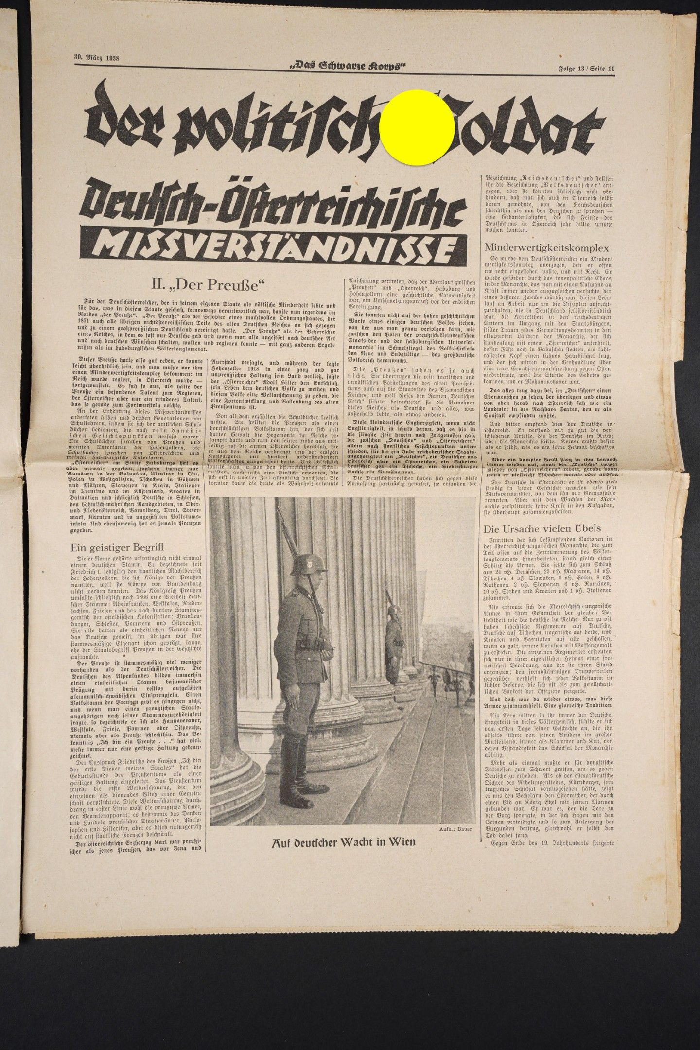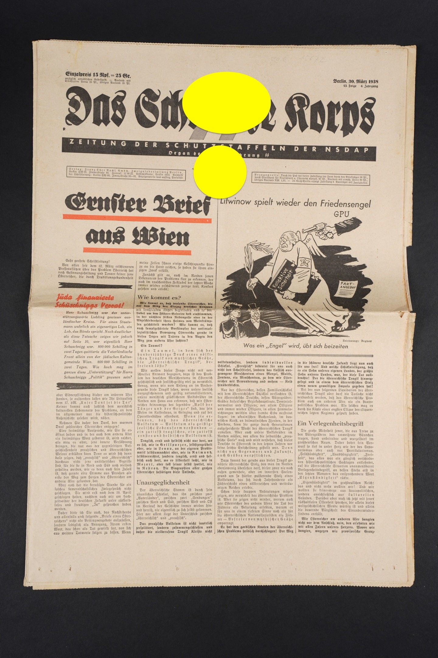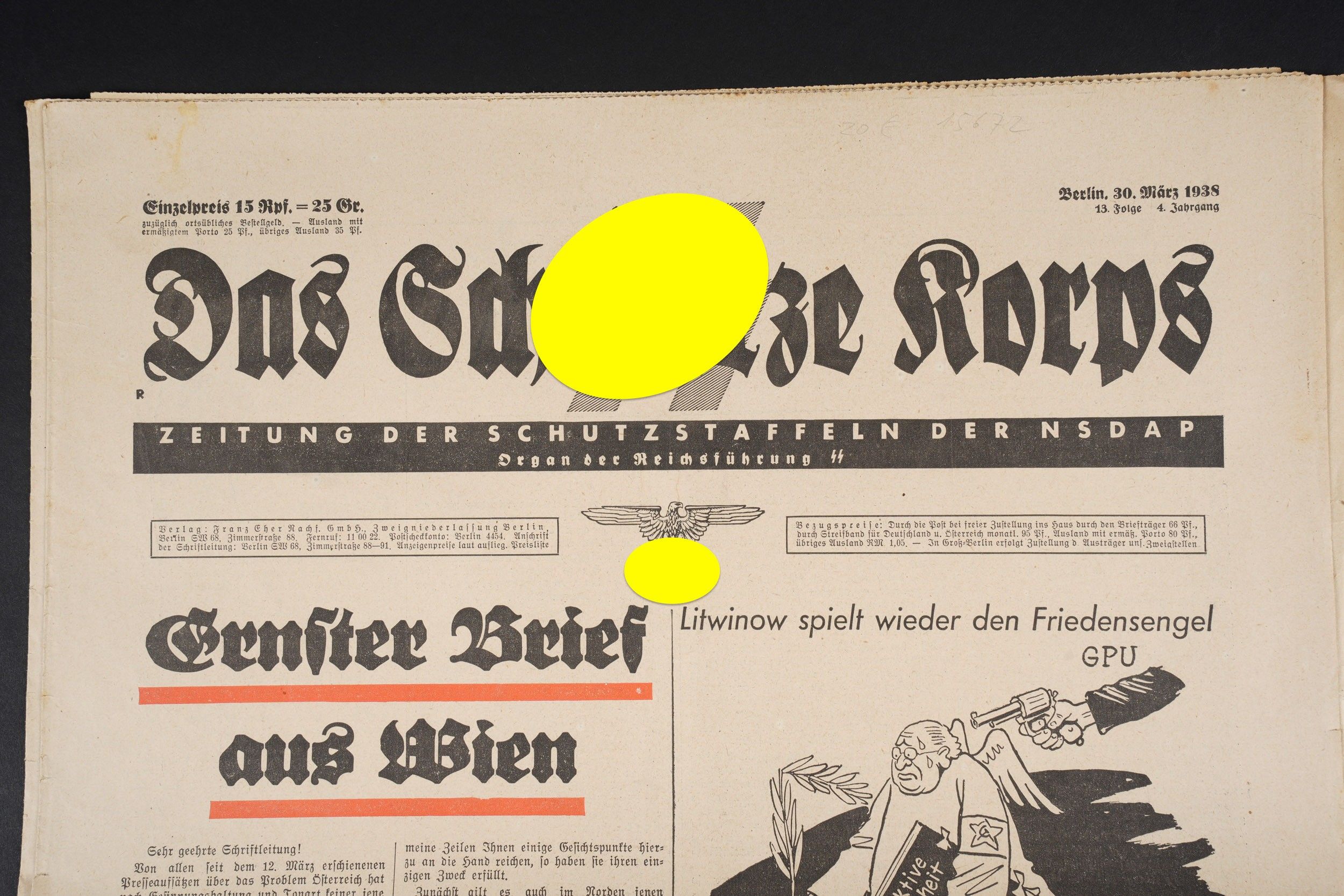 Diary Das Schwarze Korps. Complete and in very good condition. Dated 30 March 1938. To note some wear and patina of the piece, as well as some stains and tears on the edges. Condition II+. Das Schwarze Korps Newspaper Complete and in very good condition dated March 30 1938. Some wear and patina consistent with age with minor stains and edge tears. Condition II+.