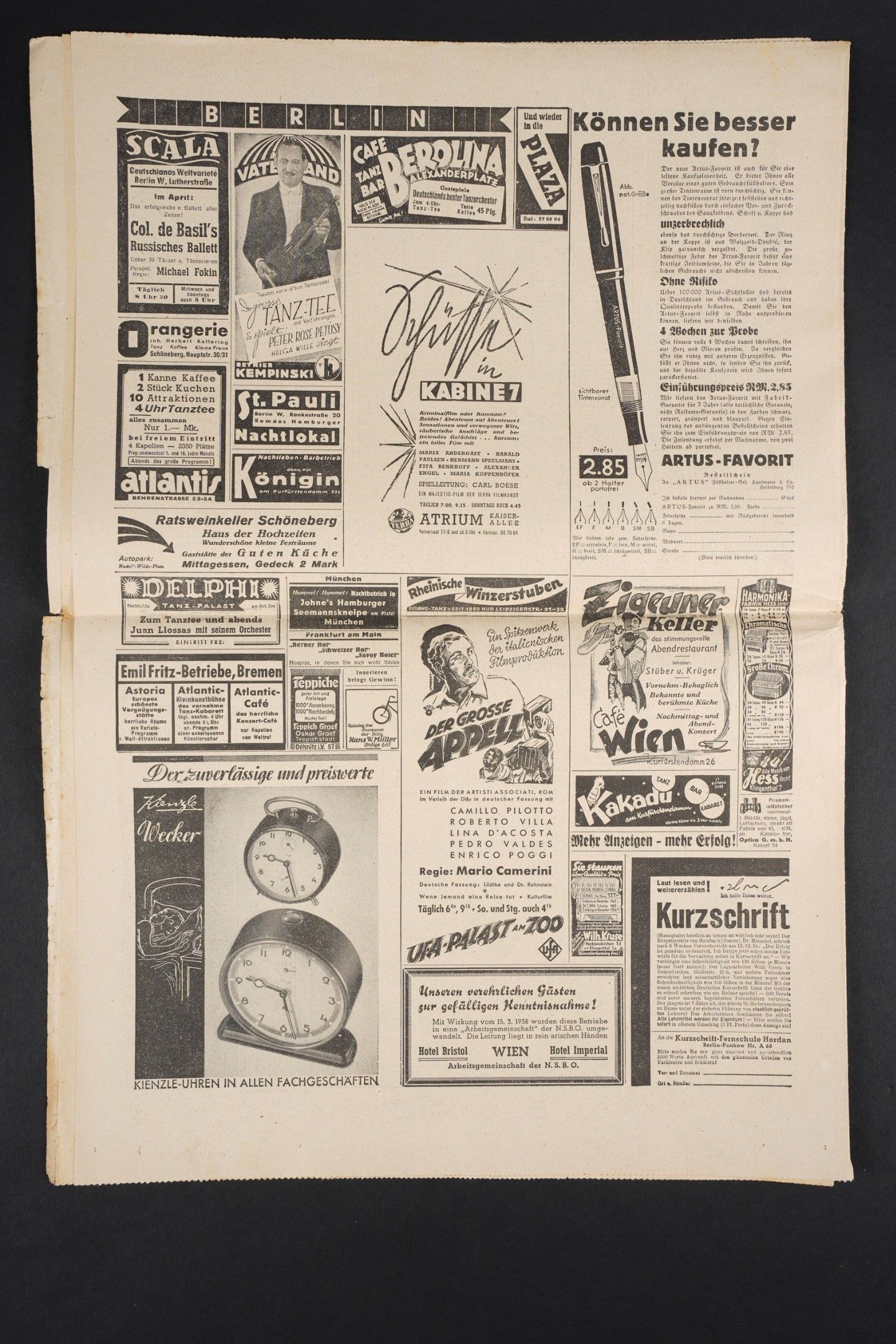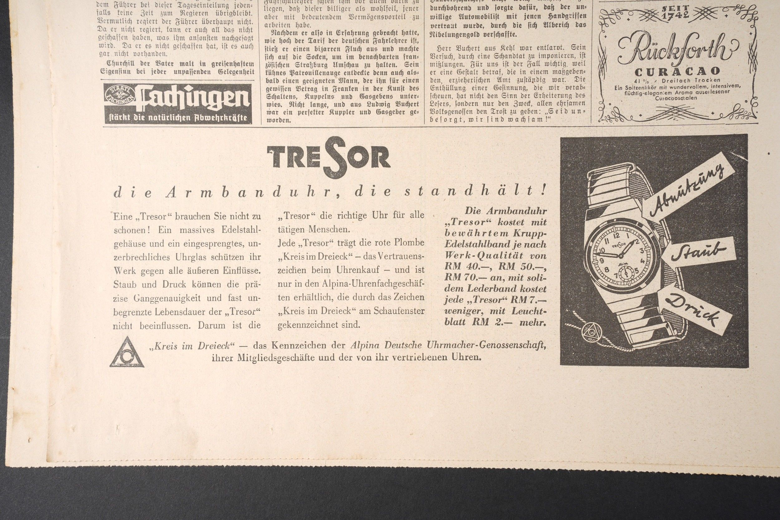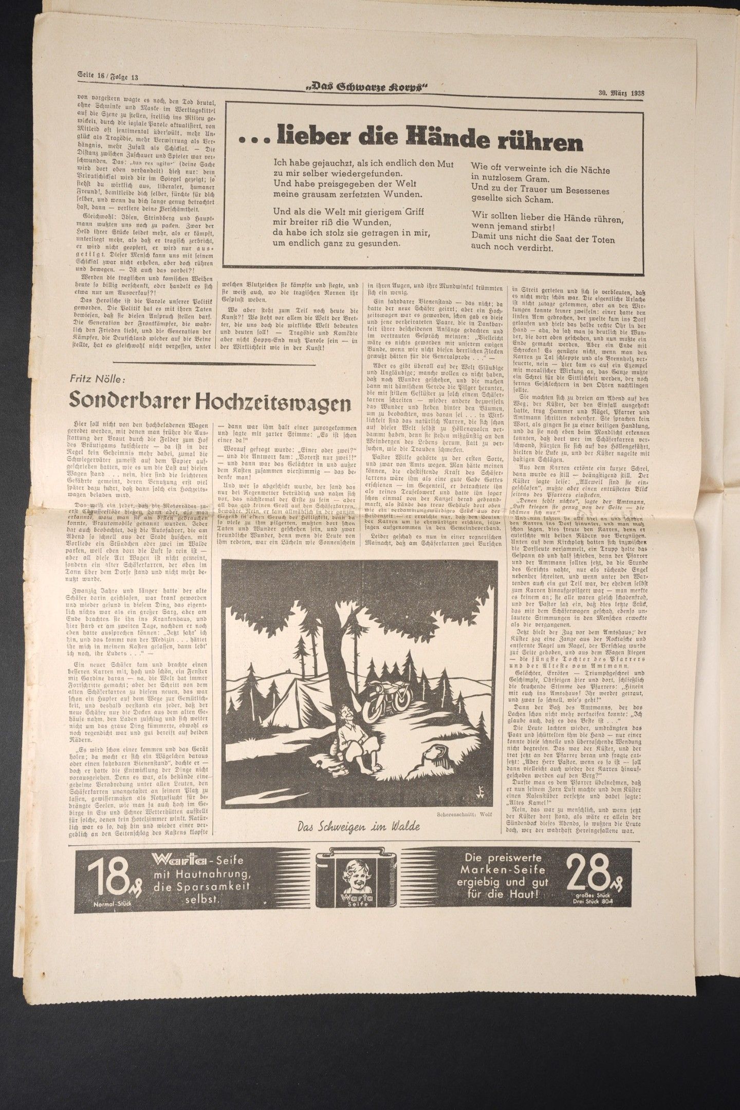 Diary Das Schwarze Korps. Complete and in very good condition. Dated 30 March 1938. To note some wear and patina of the piece, as well as some stains and tears on the edges. Condition II+. Das Schwarze Korps Newspaper Complete and in very good condition dated March 30 1938. Some wear and patina consistent with age with minor stains and edge tears. Condition II+.