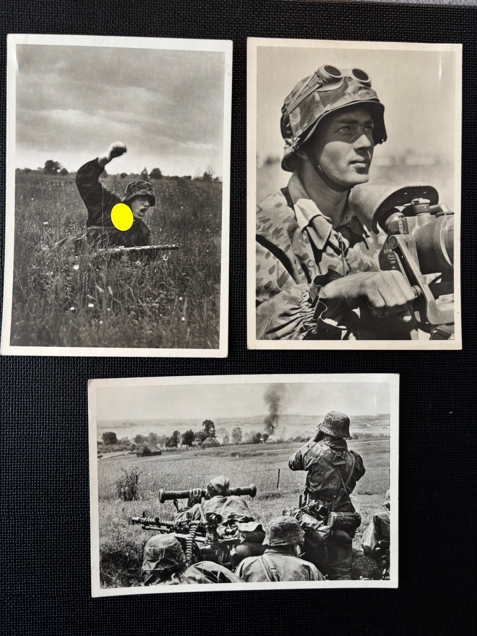 SS postcards. Three black and white photo postcards. Blank on back and marked Unsere Waffen SS and Enlist in the Waffen SS. Ersatzkommando Flandern, Antwerp. Some wear and patina to be noted. Condition II+. SS Postcards. Three black and white photographic postcards the reverse sides are blank and marked Unsere Waffen SS and Engagez-vous à la Waffen SS Ersatzkommando Flandern Antwerp showing light wear and a period patina Condition II+