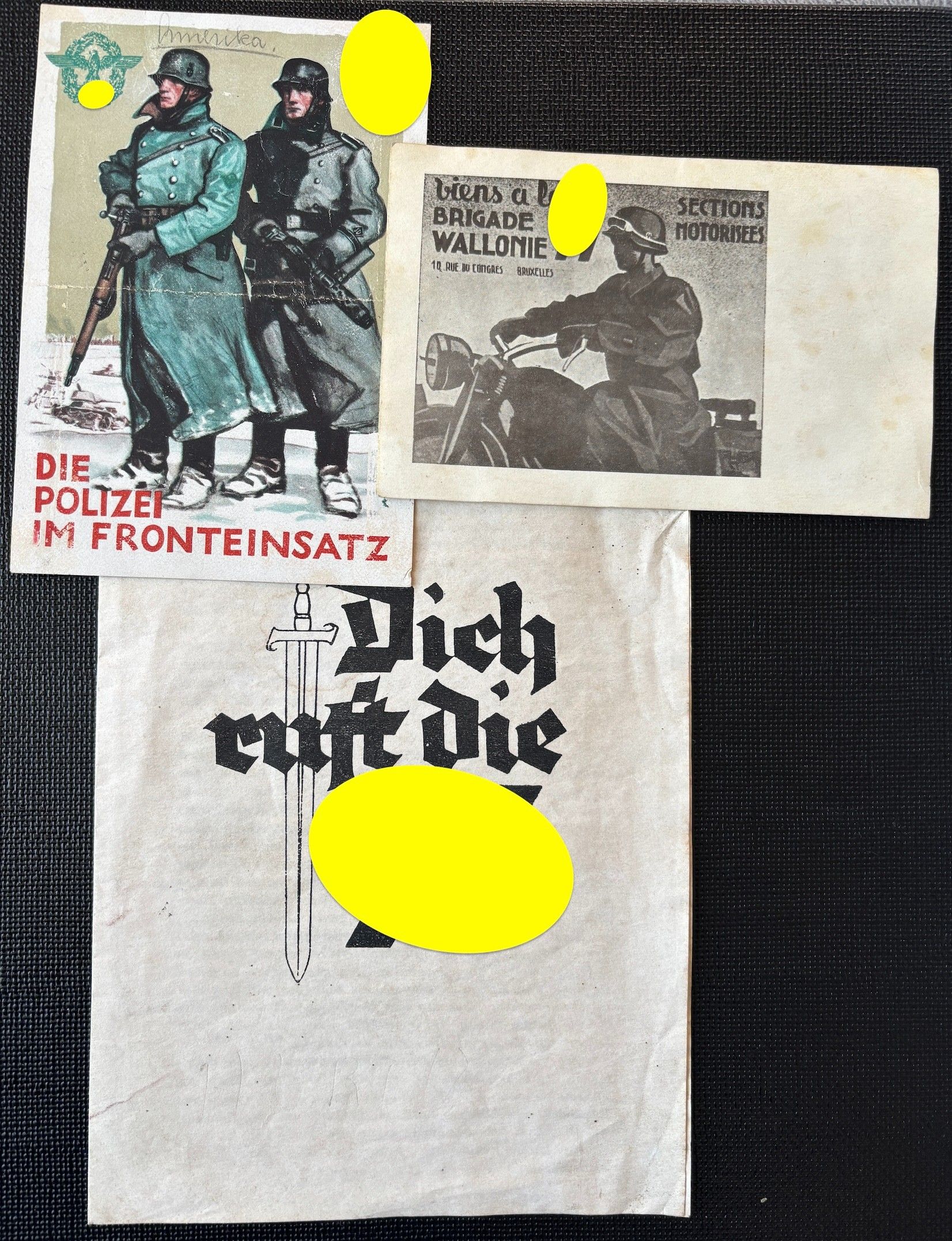 SS postcards. Comprising one colour postcard, marked Die Polizei im Fronteinsatz, traces of glue on back. Two SS Wallonie postcards. Traces of glue on back. Enclosed is a Dich ruft die SS booklet for the town of Douai. Some wear and patina to be noted. Condition II+. SS Postcards. Including a colour postcard marked Die Polizei im Fronteinsatz with glue traces on the reverse two SS Wallonie postcards also with glue traces a Dich ruft die SS leaflet for the city of Douai is included showing light wear and a period patina Condition II+