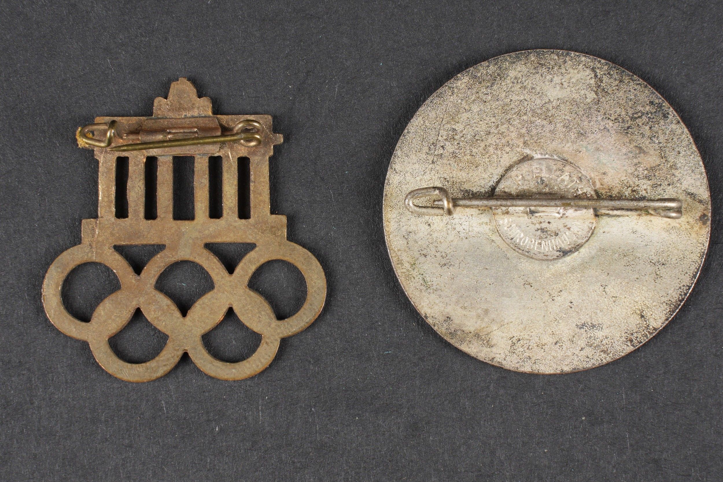 Olympic badges. Comprising an enamelled metal badge from the 1936 Berlin Olympic Games, complete clip, no visible markings. An enamelled metal badge from the 1938 Garmisch Partenkirchen Olympic Games, complete clip, markings illegible. Some wear and patina to be noted. Condition II+. Olympic Games Badges Including an enameled metal badge from the 1936 Berlin Olympic Games with complete pin and no visible markings and an enameled metal badge from the 1938 Garmisch Partenkirchen Olympic Games with complete pin and illegible markings. Some wear and patina consistent with age. Condition II+.