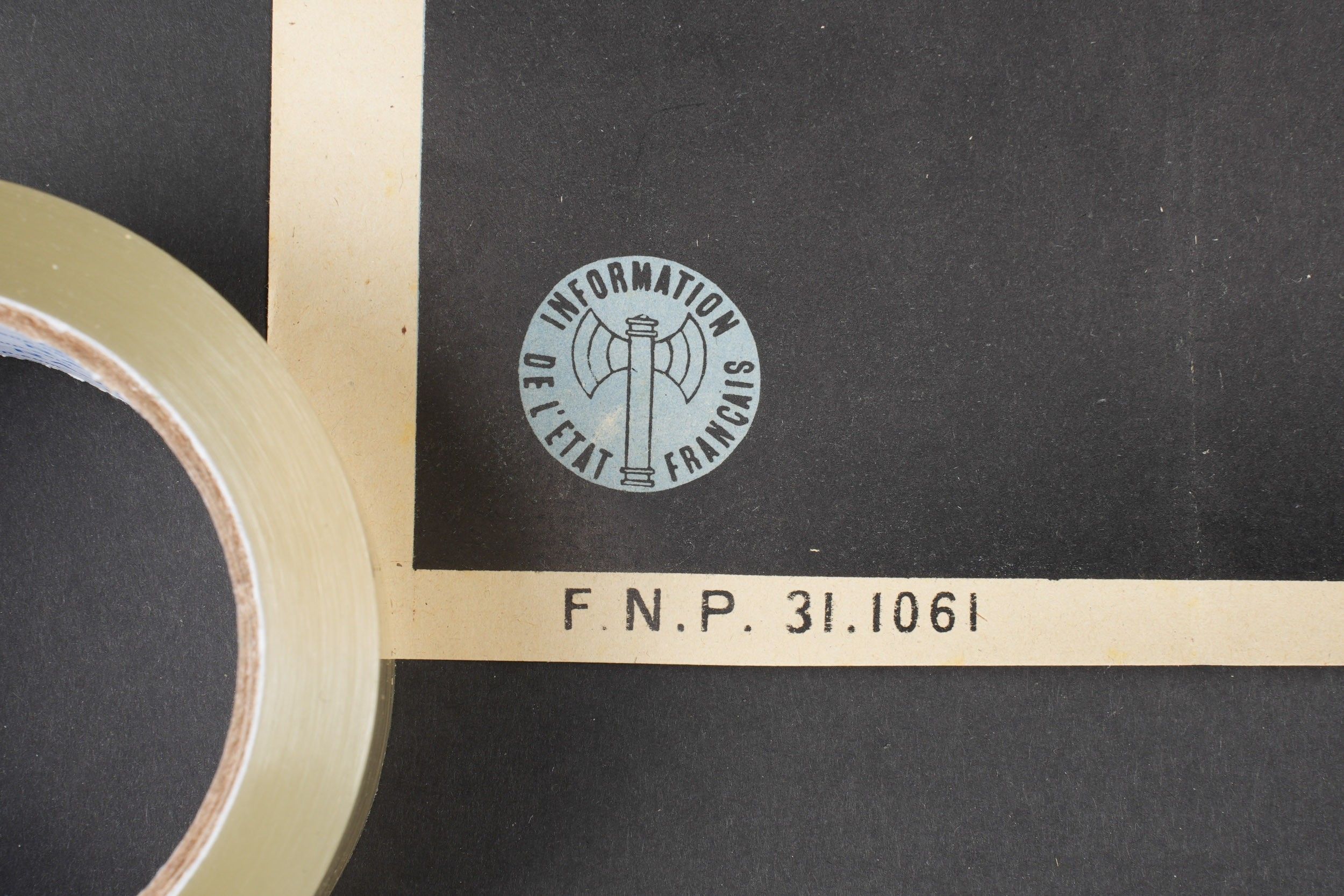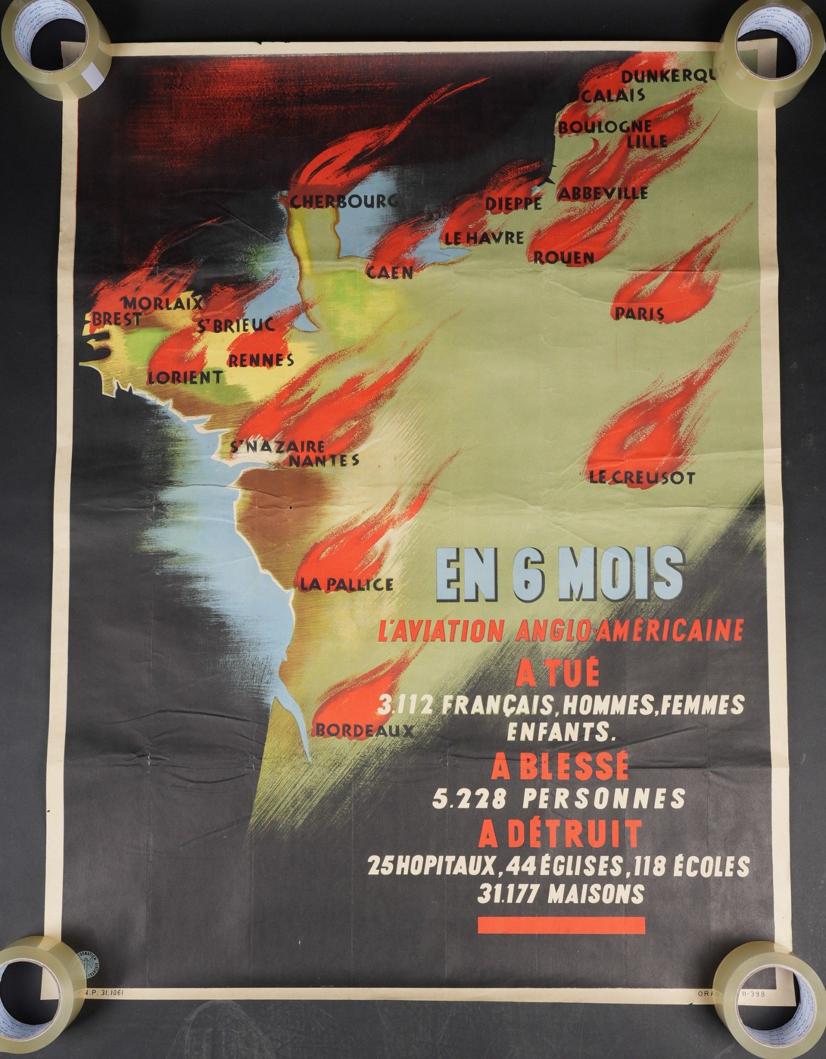 Poster in 6 months the Anglo-American air force killed. In colour by cartoonist Eric dit Castel (1915-1997). Published in 1943. This poster accuses the Anglo-American air force of killing and wounding French people and destroying places where they lived, cared for and worshipped. Markings ORAFF VII 398. FNP 31 1061, logo of the French State Information Service. Dimensions approx. 80 x 120 cm. Slight wear and patina to be noted, as well as a few discreet fold marks. Condition I-. Poster In Six Months Anglo-American Aviation Has Killed Color drawing by artist Eric also known as Castel (1915-1997) Published in 1943 This poster accuses Anglo-American aviation of killing and injuring French civilians and destroying places of life worship and care Markings ORAFF VII 398 FNP 31 1061 logo of the Information Service of the French State Dimensions approximately 80 x 120 cm Light wear and patina consistent with age with minor folding traces Condition I-.
