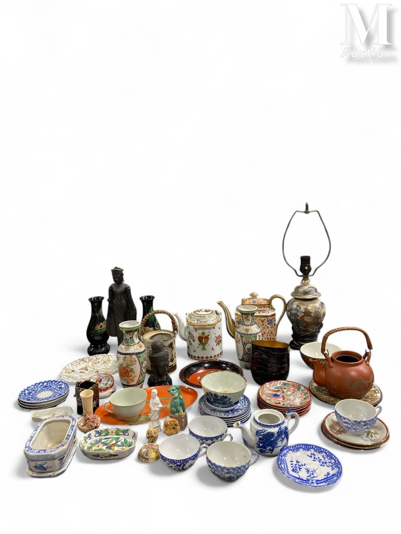 Comprising buddha, part of services: cups, teapots, vases, bowls, tray, resin Netsuke, ceramic phô dog, and miscellaneous.