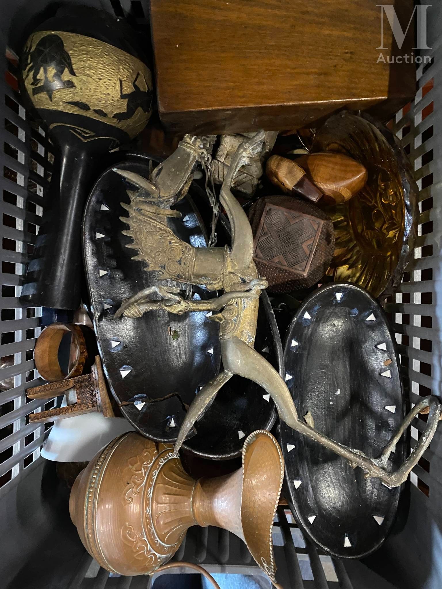 HANDKERCHIEF of trinkets and decorative objects including: vases, jugs, medals, coins, travel souvenirs, mini-frames, bowls, wooden duck and miscellaneous ... As is.