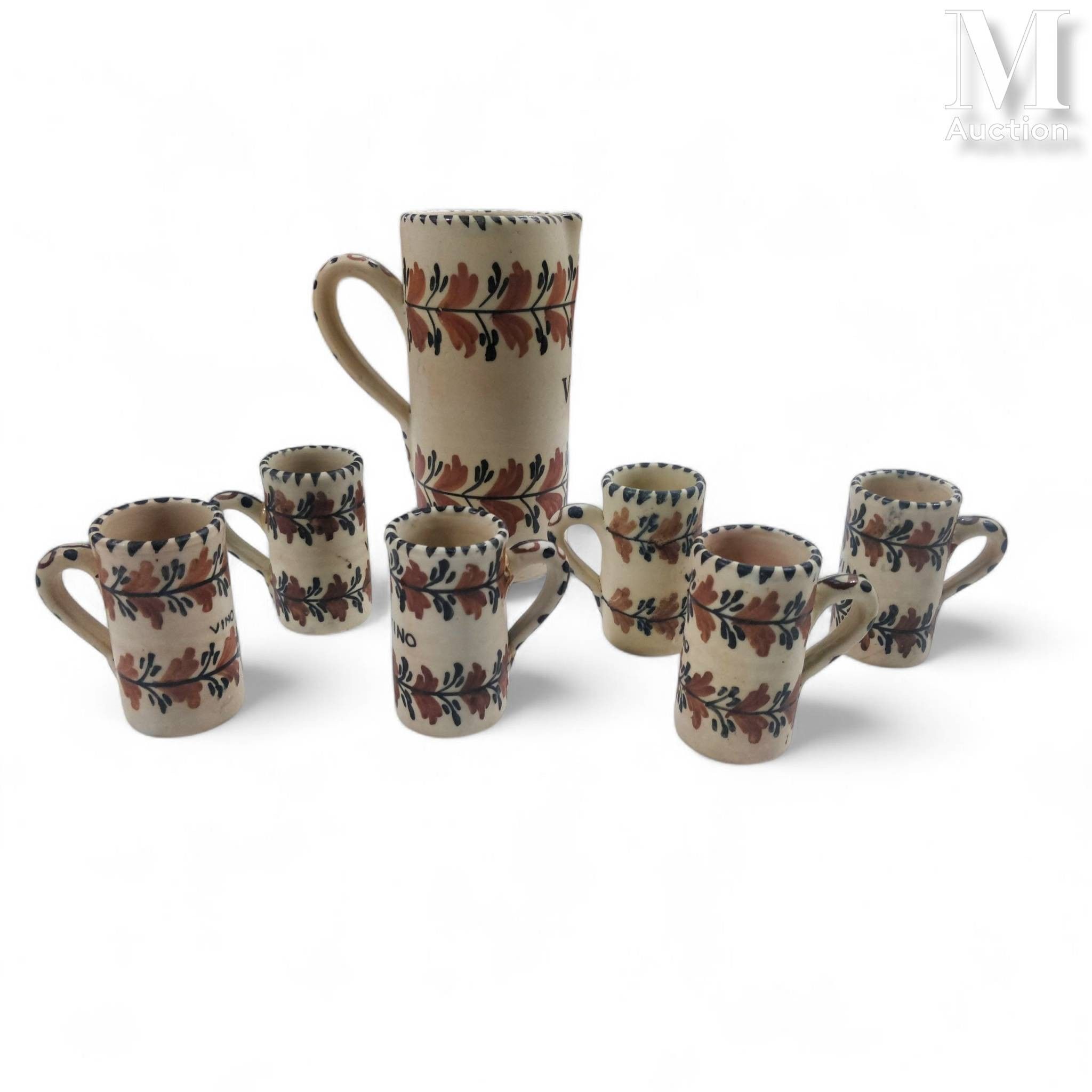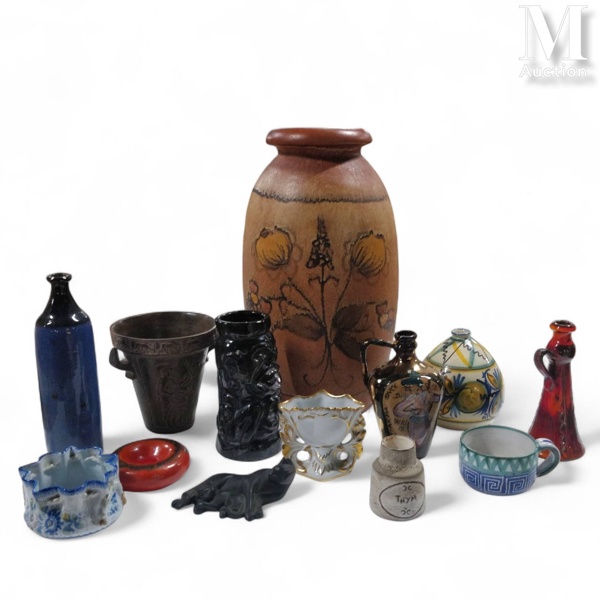 a large terracotta vase with an ochre glaze shaded with yellow and decorated with a bouquet of flowers (H.: 47 cm), a gourd with a handle in the style of Bessin ceramics, a vase reproducing an antique Greek bronze, an elongated bottle with a blue glaze, a cup in the style of Robert PICAULT and miscellaneous.