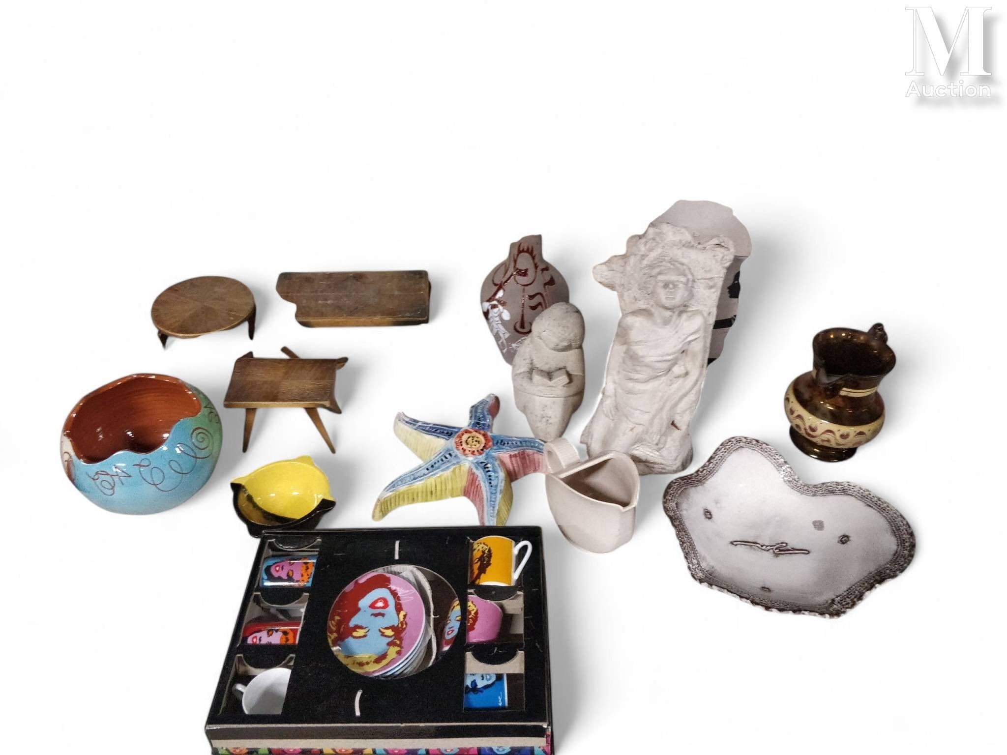 Comprising: three pieces of modern master's furniture, part of a Marilyn Monroe coffee service, a large ceramic flower pot decorated with an Egyptian profile, a vase and miscellaneous.