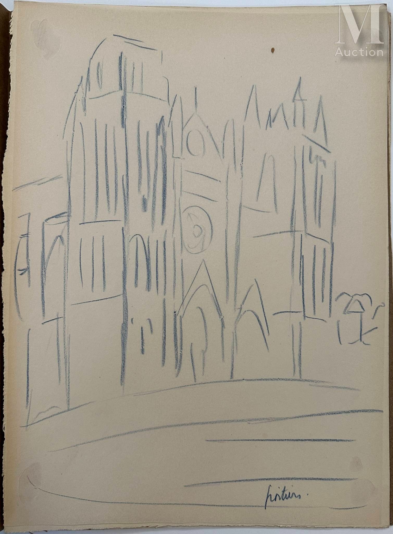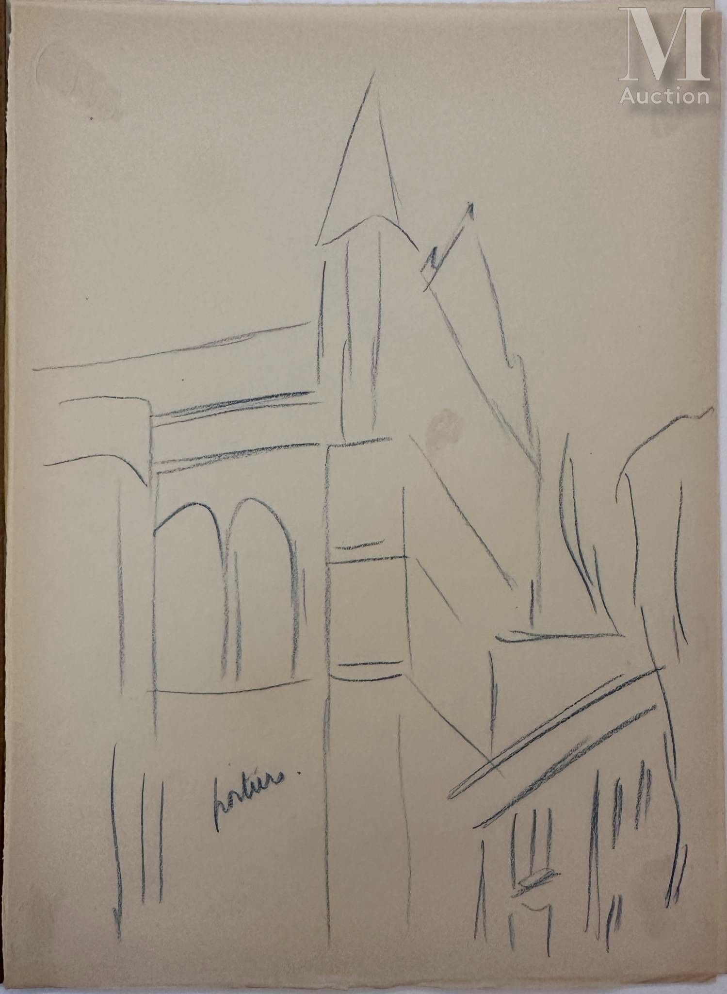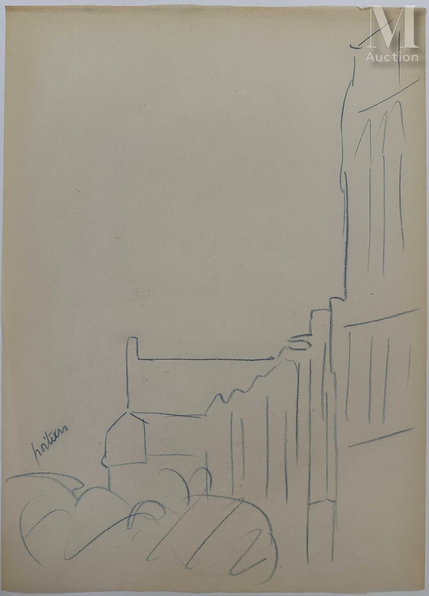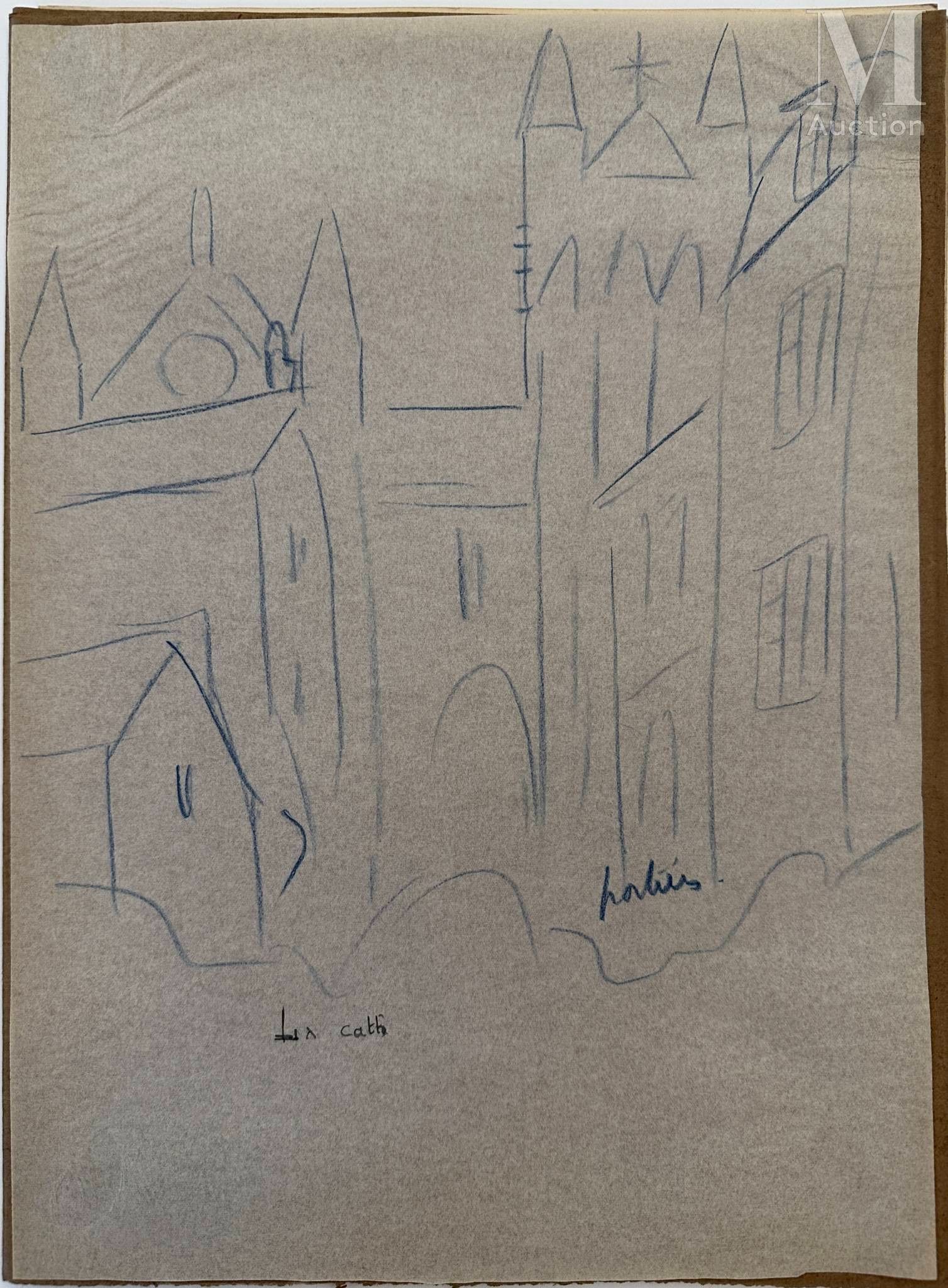 Lot of 9 works comprising 6 blue pencil drawings on tracing paper, 4 of which glued to the corners on paper and 1 glued to the corners on brown paper, 1 charcoal and watercolour drawing, and 2 prints