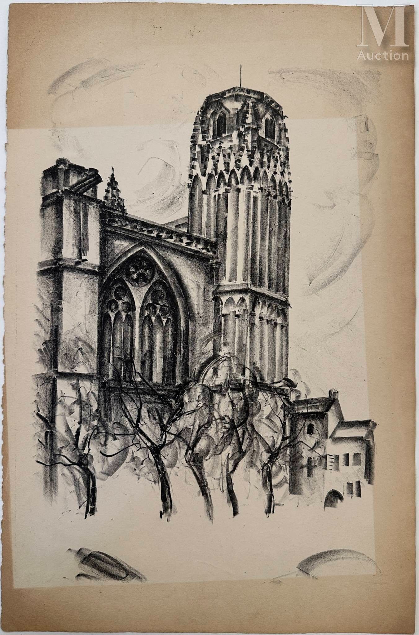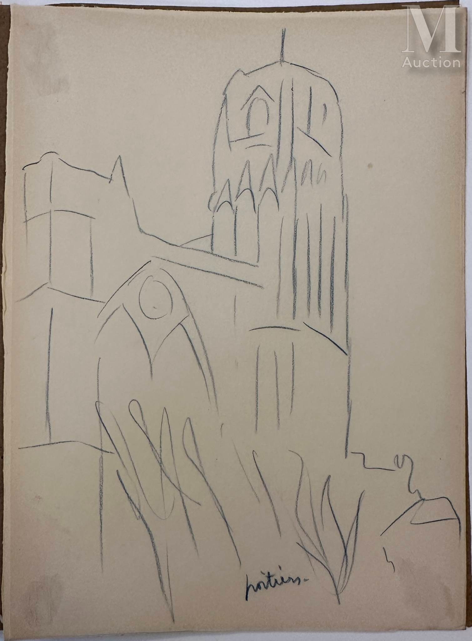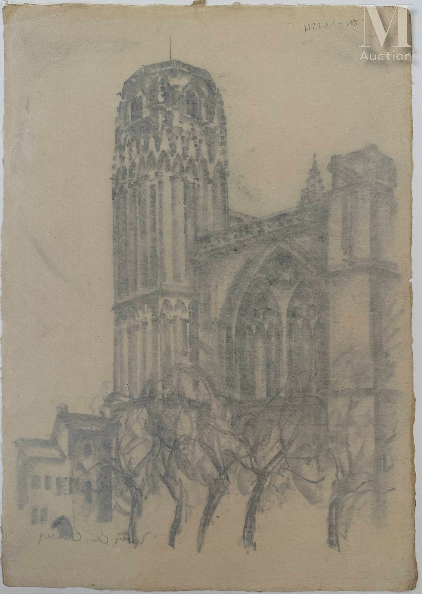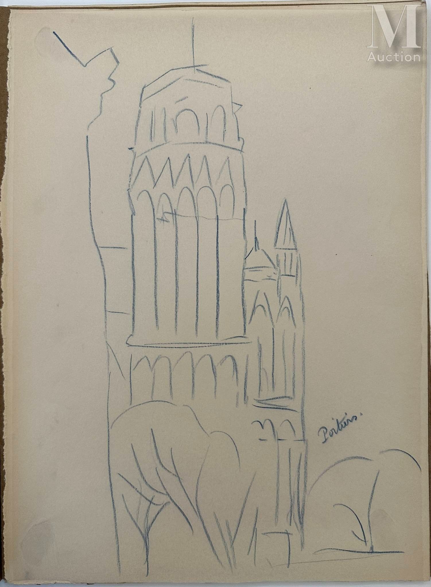 Lot of 9 works comprising 6 blue pencil drawings on tracing paper, 4 of which glued to the corners on paper and 1 glued to the corners on brown paper, 1 charcoal and watercolour drawing, and 2 prints