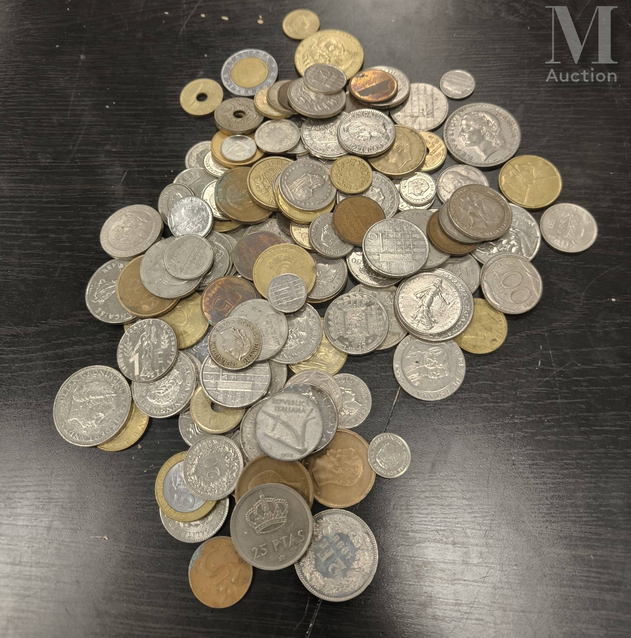 Lots of various coins: French francs, Belgian francs, pesetas, florins, etc...