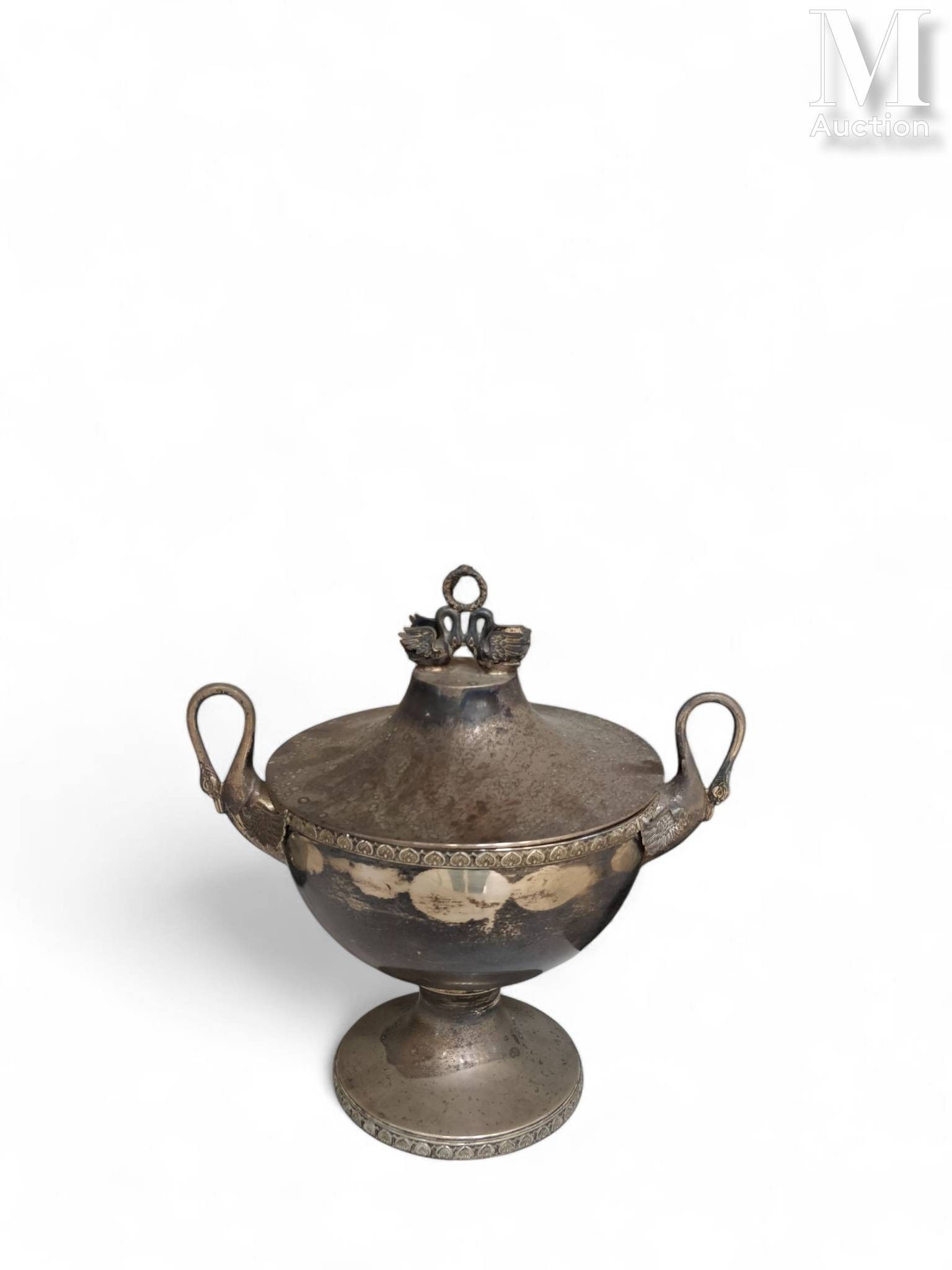 In silver-plated metal, flanked by swan-neck handles, the lid with facing swans surmounted by a laurel garland, a frieze of palmettes on the rim and base