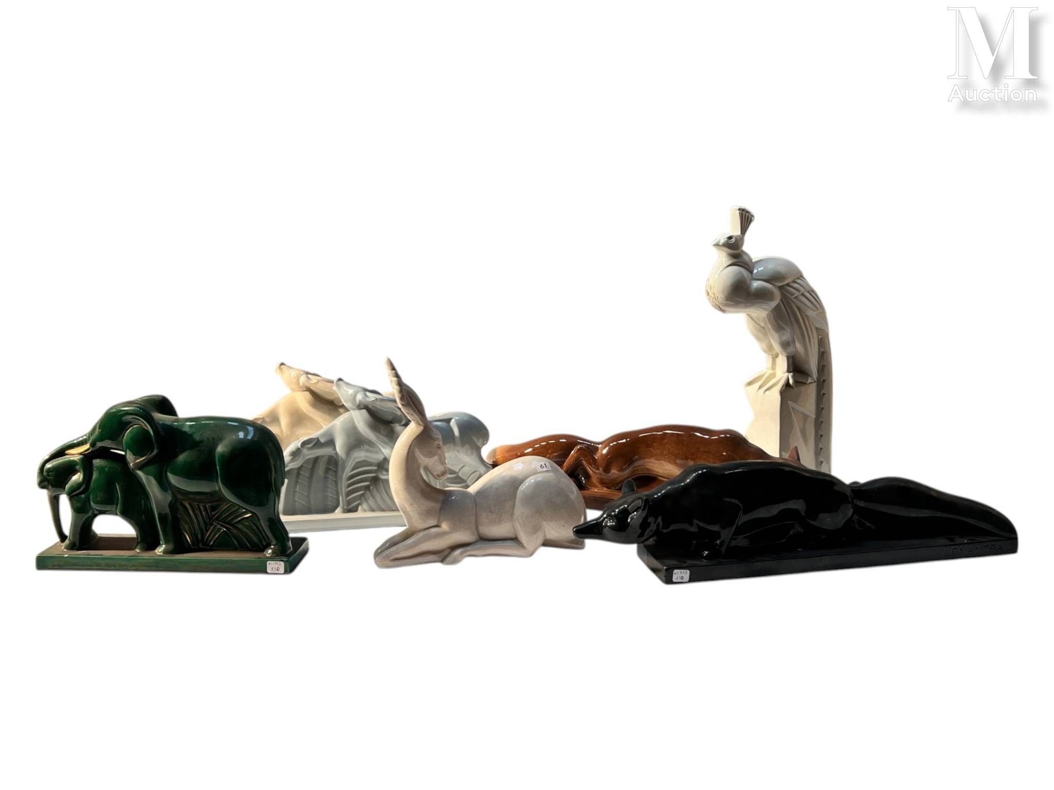 Enamelled and crackled ceramics in shades of green, white, black, brown and light blue comprising: a fox (Clement manufacture), a pan (Clement manufacture), an elephant and its mother (Charles Lemanceau, signed on the terrace), a gazelle (Charles Lemanceau, signed on the terrace), two pairs of gazelle (Clement manufacture) and a fox (Charles Lemanceau, signed on the terrace).