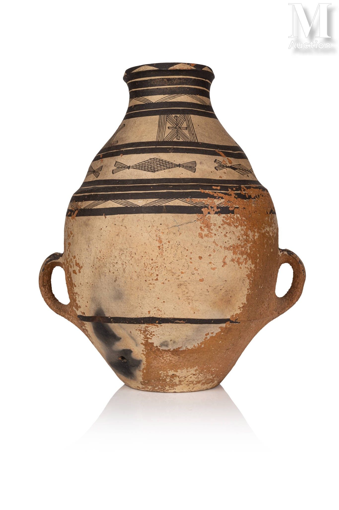 A jug with a flared neck and an ovoid body with two handles. It is decorated with manganese paint from the shoulder to the lip on a cream slip.