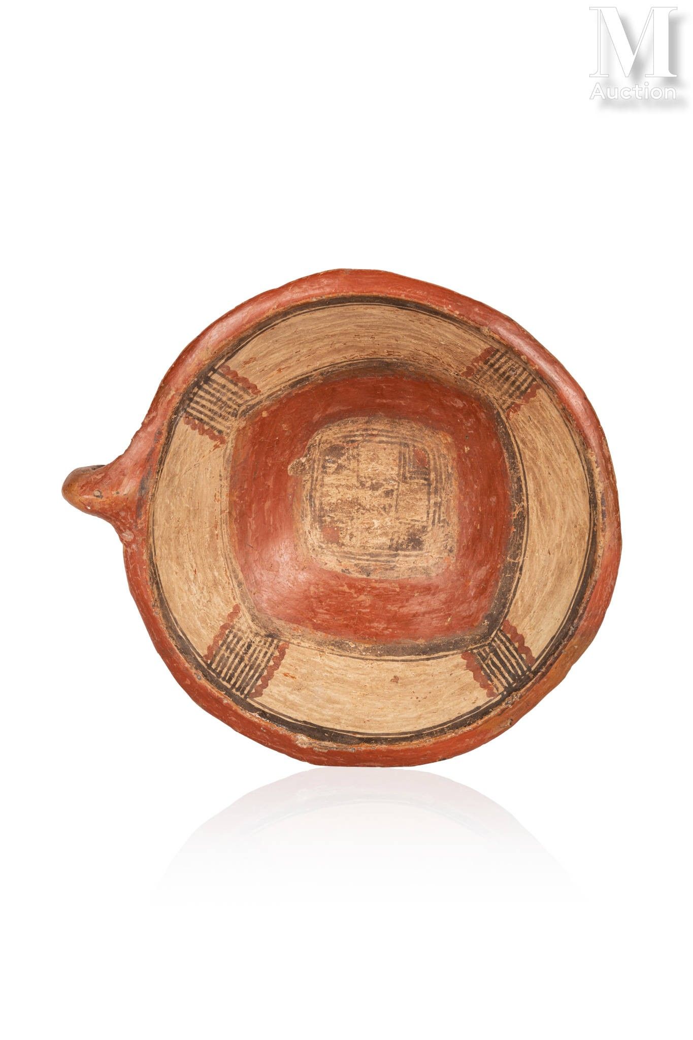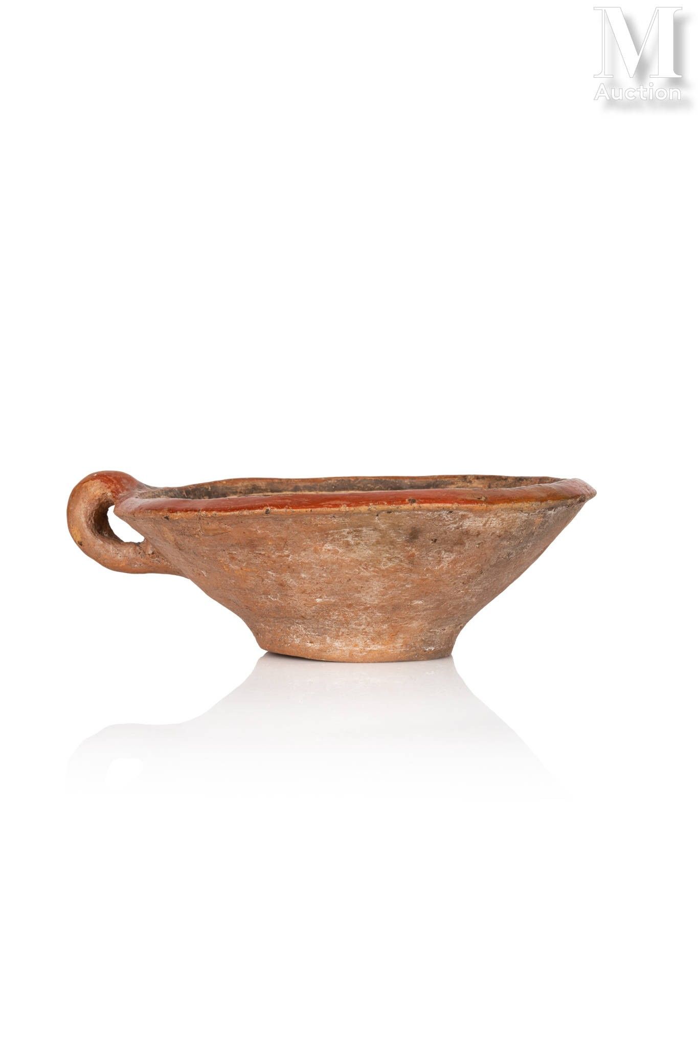 Dish with small handle, decorated with black and red geometric decoration on brown slip, under a fine glaze.