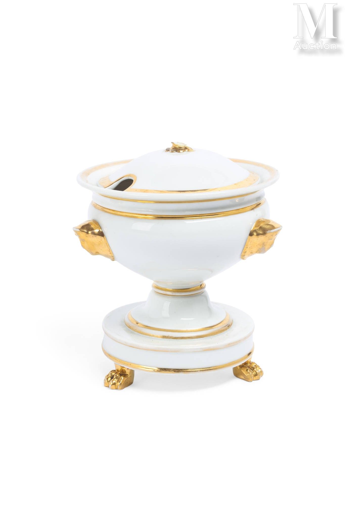 In white Paris porcelain, decorated with fillets, mascarons and a gold claw base.