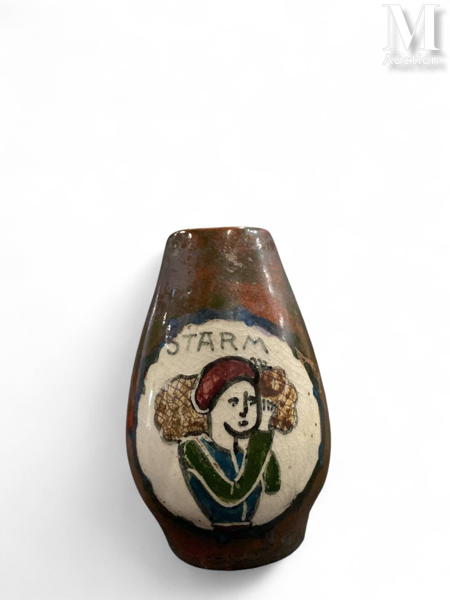 Small ochre glazed earthenware vase with a play of iridescent green and craquelure, decorated with a figure carrying a basket in a white reserve, after the Bayeux tapestry.
