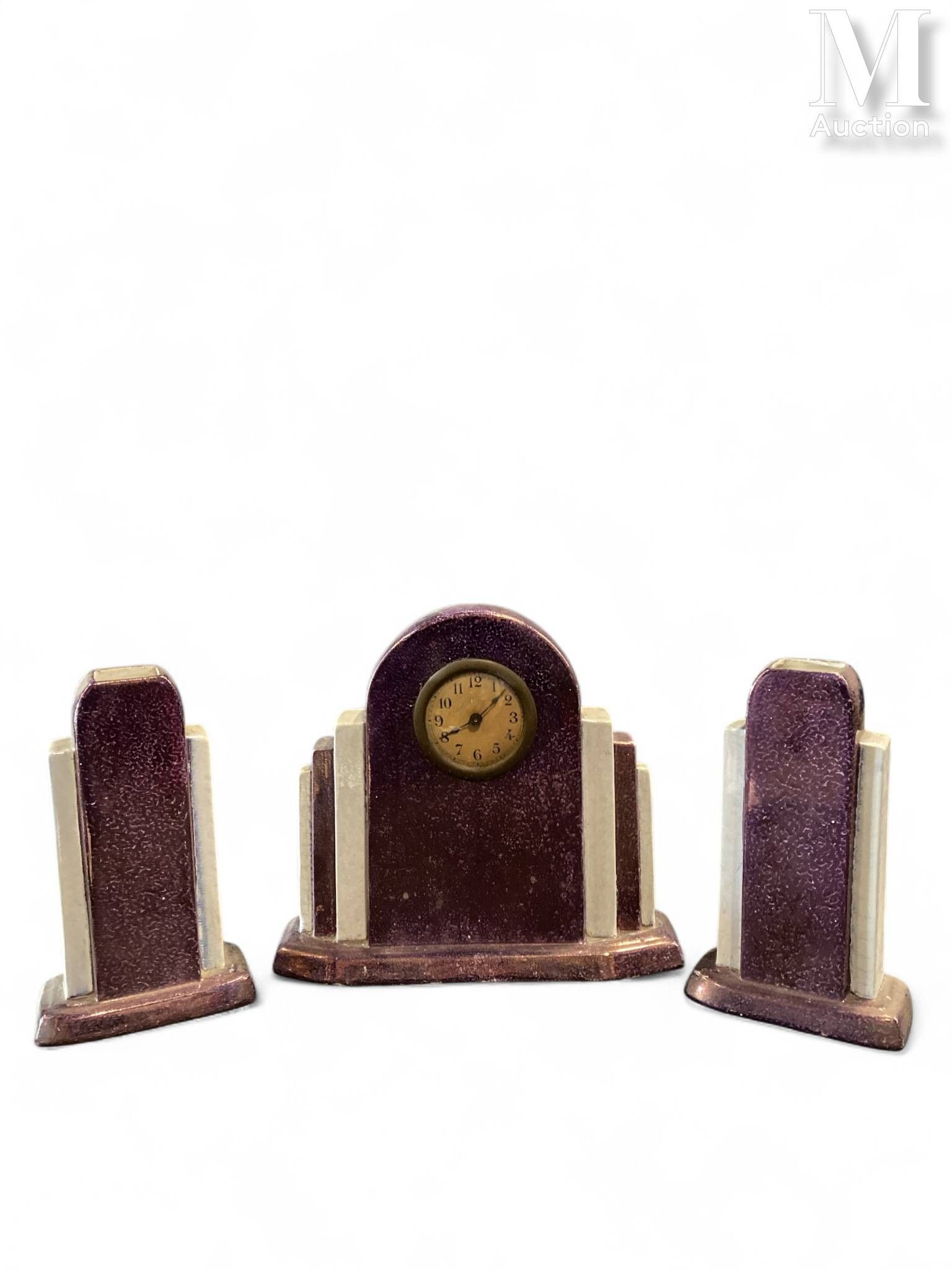 in white and violet iridescent ceramic, composed of a clock and a pair of vases.