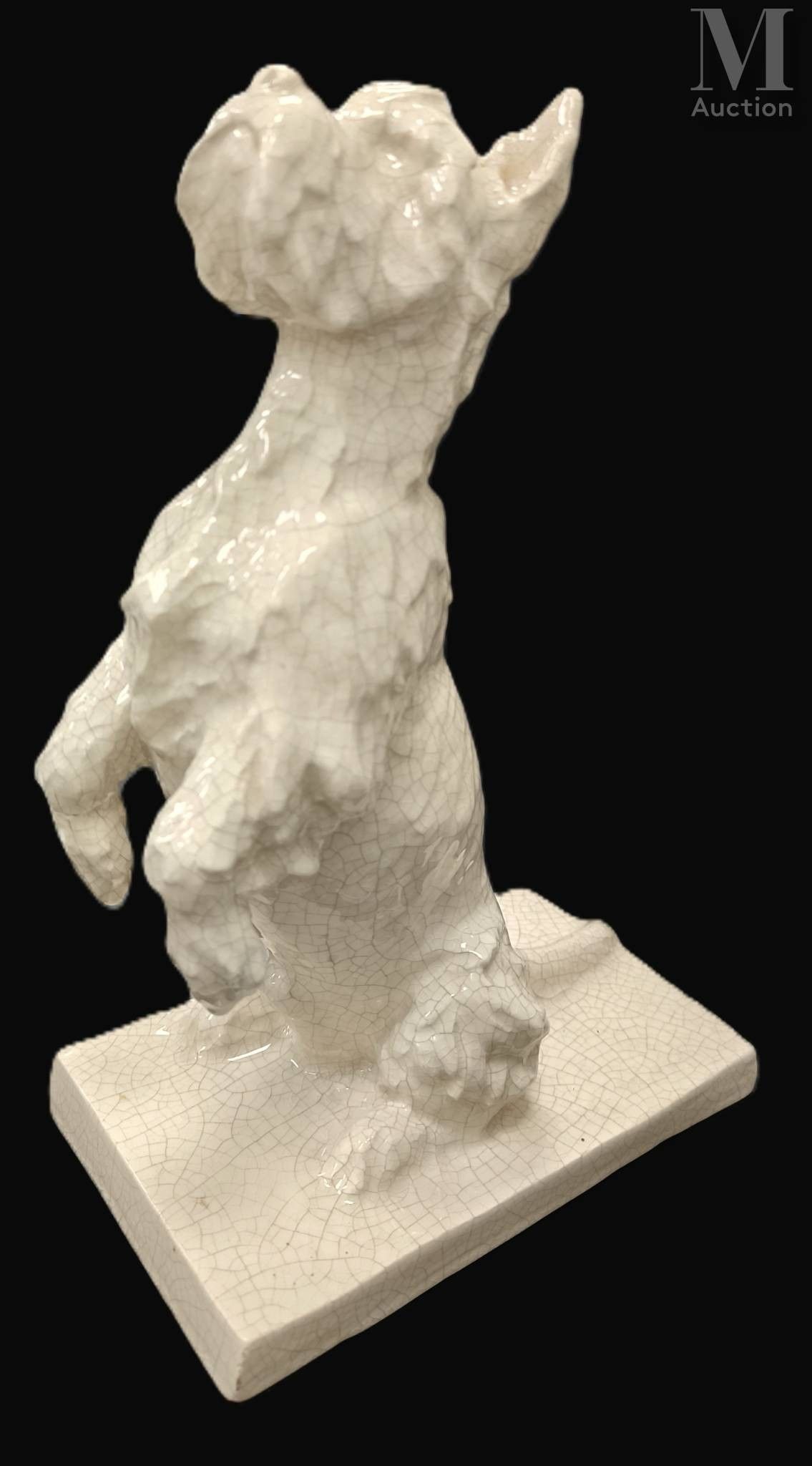 Crackled white glazed earthenware sculpture of a Scottish Terrier showing off.