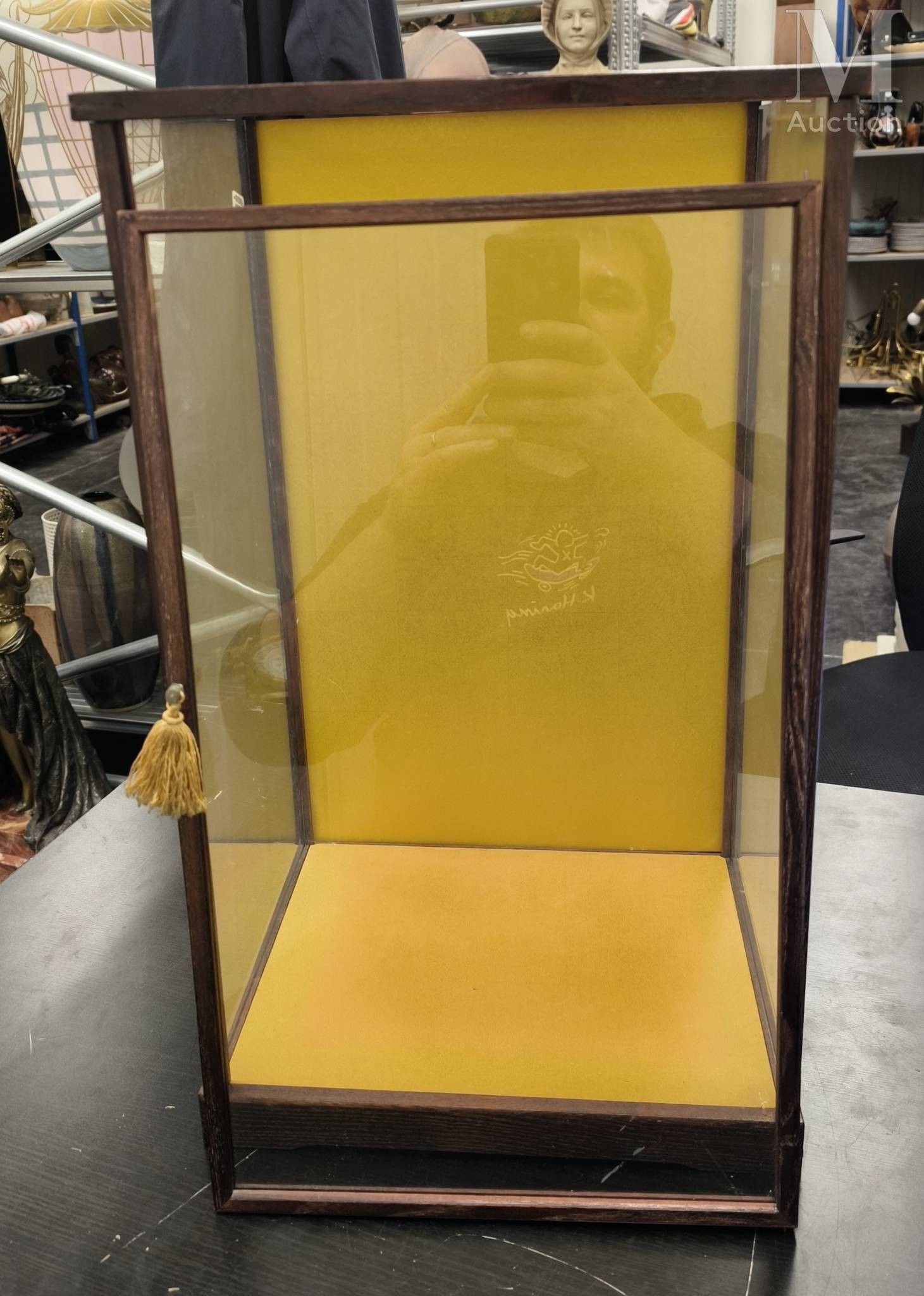 Display case Stained wood and glass display case opening wit…