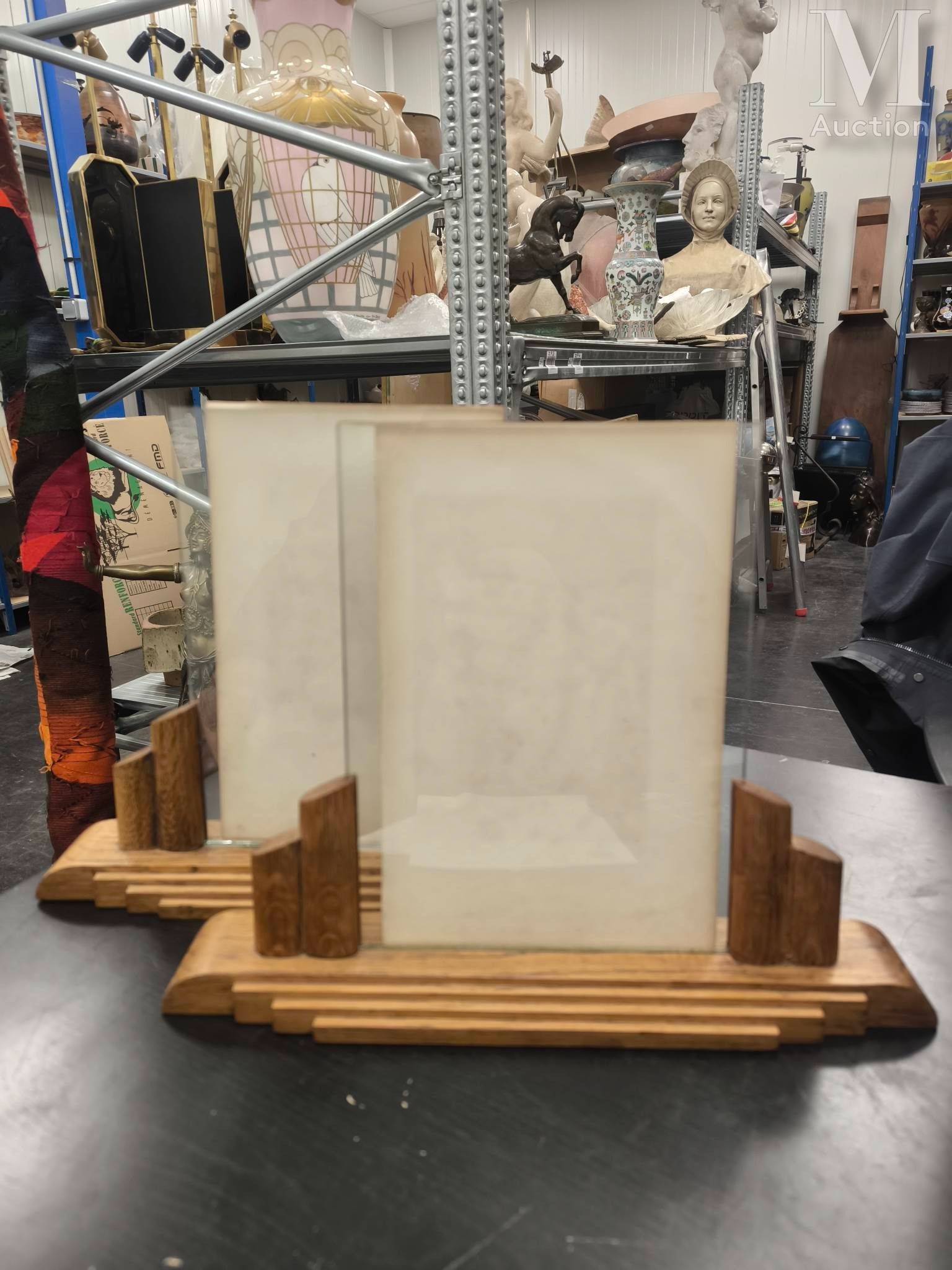 Two Art Deco style varnished wood photo holders.
