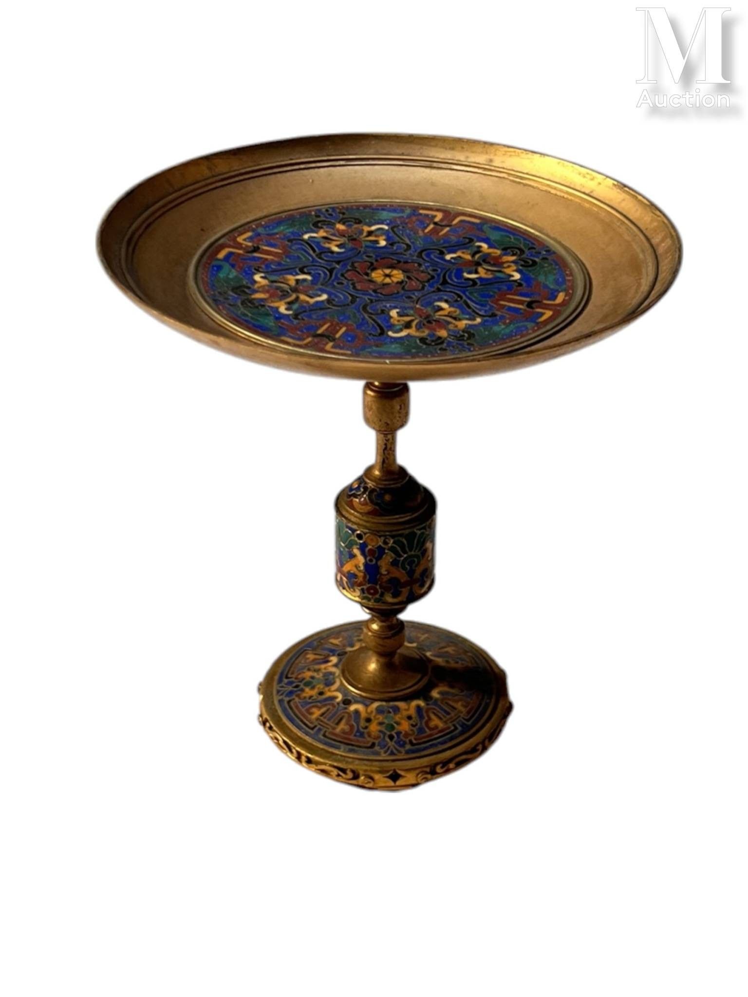 BARBEDIENNE, late 19th century Bronze bowl with red, blue and green cloisonné enamels forming stylised plant motifs Signed under the base E. BARBEDIENNE H. 19 - Diam. 17.5 cm