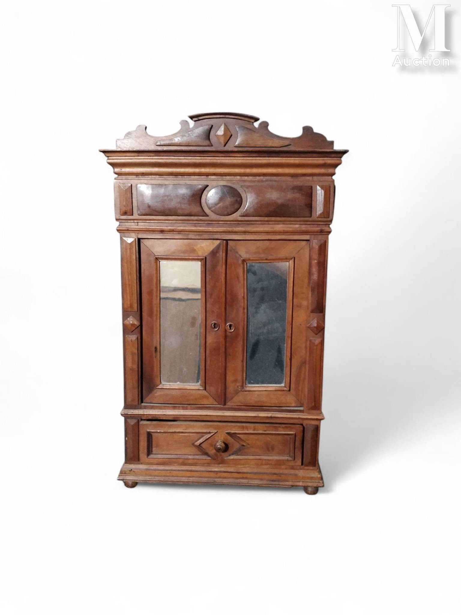 in carved wood decorated with diamond points, it opens to two mirrored doors in the upper part and a drawer in the lower part. Base in moulded plinth ending in four small feet.