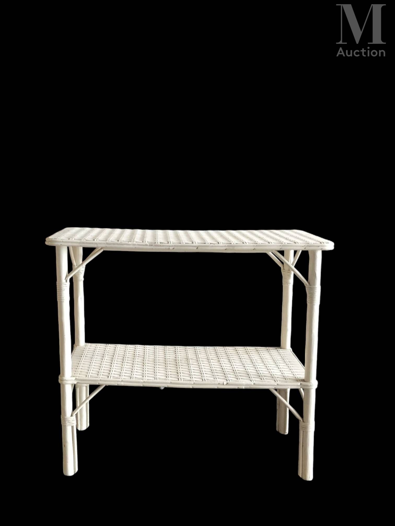 in white lacquered rattan, with two shelves; resting on four straight legs