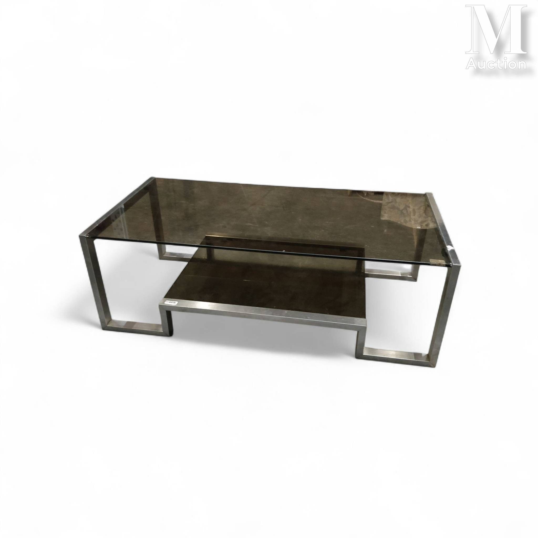 Rectangular coffee table Circa 1960 with modernist chrome-plated metal base, smoked glass top and spacer shelf H. 33 - W 100 - D 50 cm Chips in the glass H: 33 x W: 100 x D: 50 cm