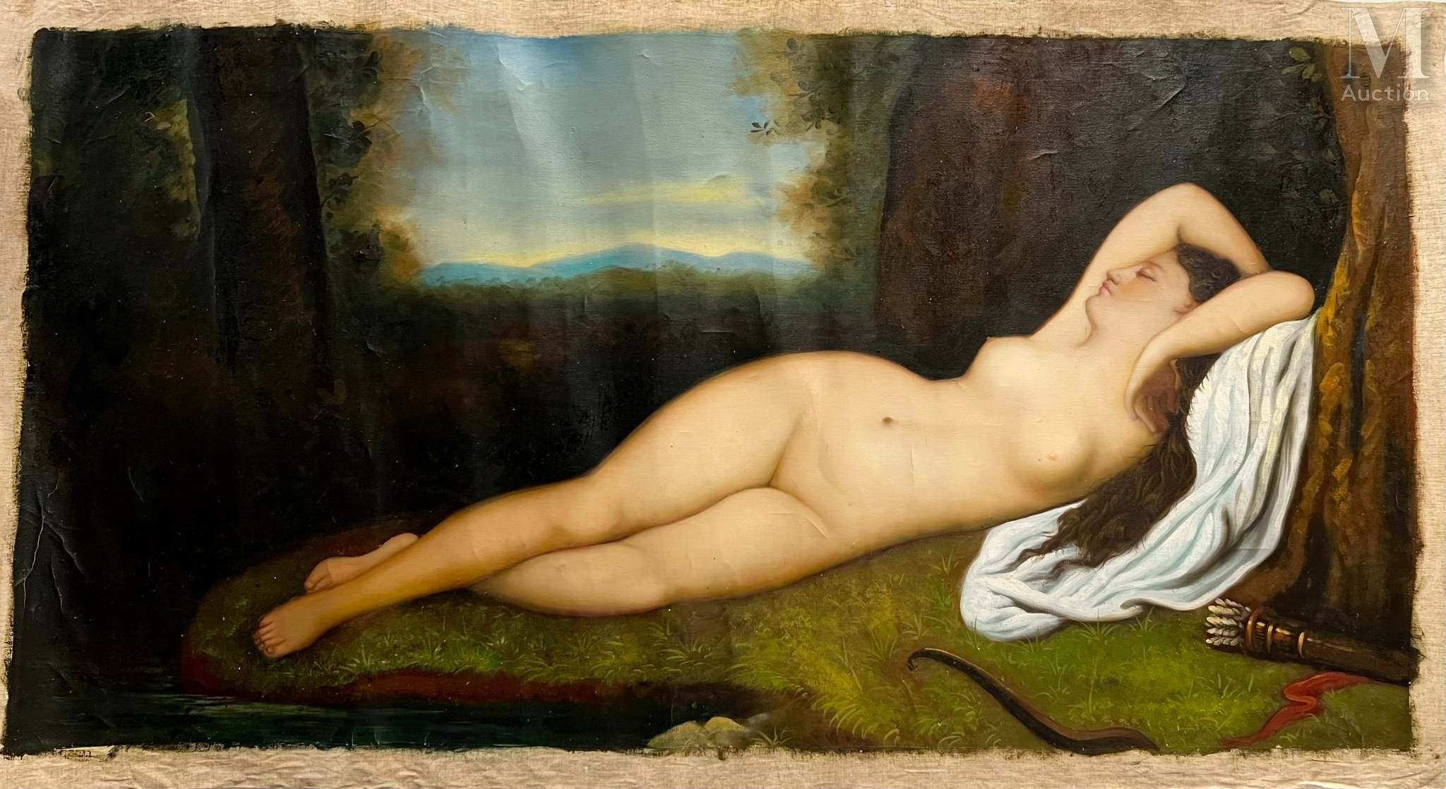 Sleeping Venus - 20th century FRENCH SCHOOL Oil on canvas Unsigned Modern work, XXth century In the taste of the Italian Renaissance (Titian, Giorgione...) 70 x 127 cm the canvas 62 x 120 cm the subject without stretcher, some craquelure This work of the nude woman is reminiscent of twentieth-century artists such as Renoir, Lamberton, Picart Le Doux, Ottmann, Baes, Bonnefoit, Bissière, Kvapil, Tchoubanoff, Elhinger, Dulac, Henner, Souverbie, Domergue and Raoul le Jeune.