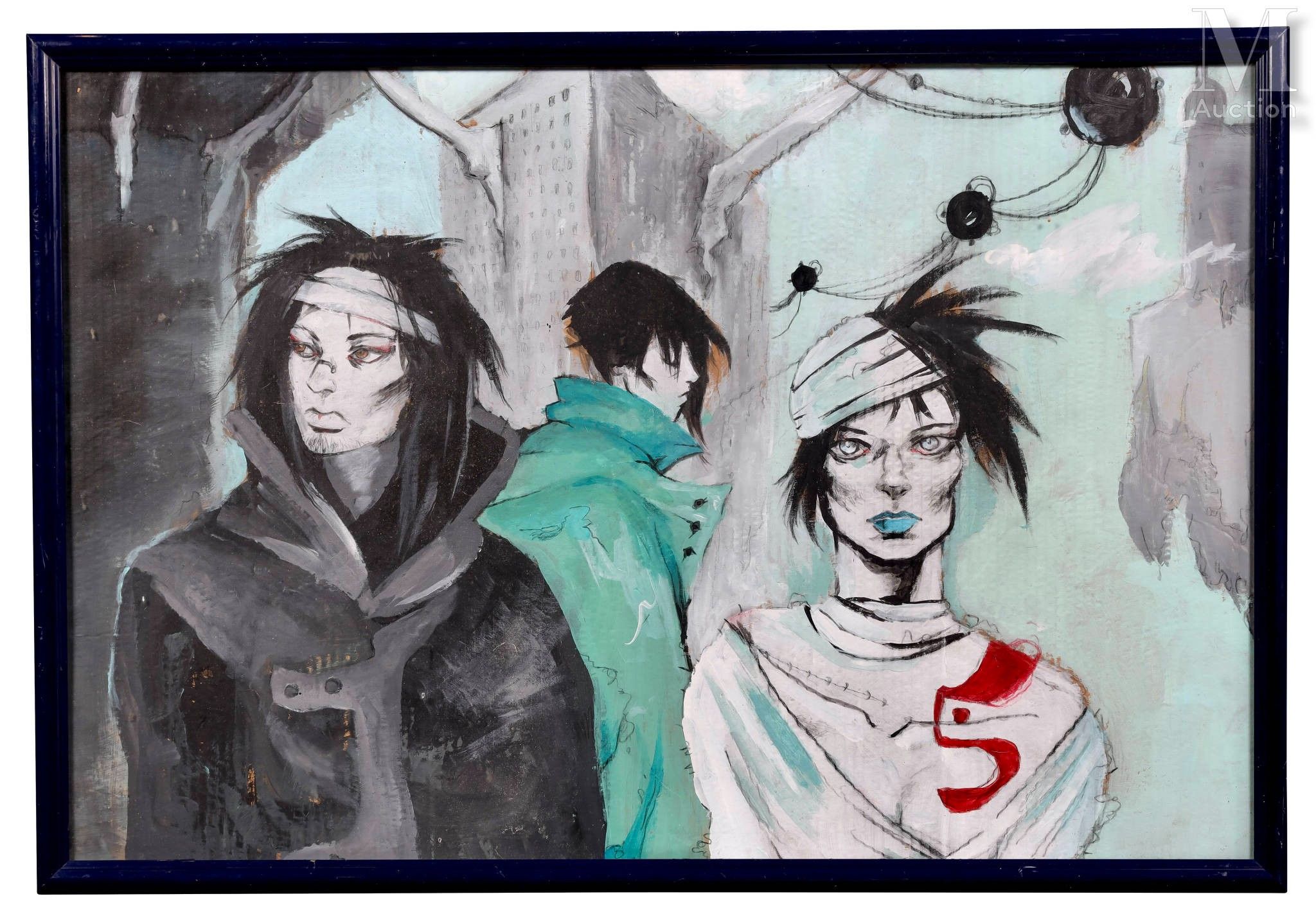 20th century FRENCH SCHOOL The three characters Mixed media on cardboard Unsigned 52 x 79 cm Framed under glass