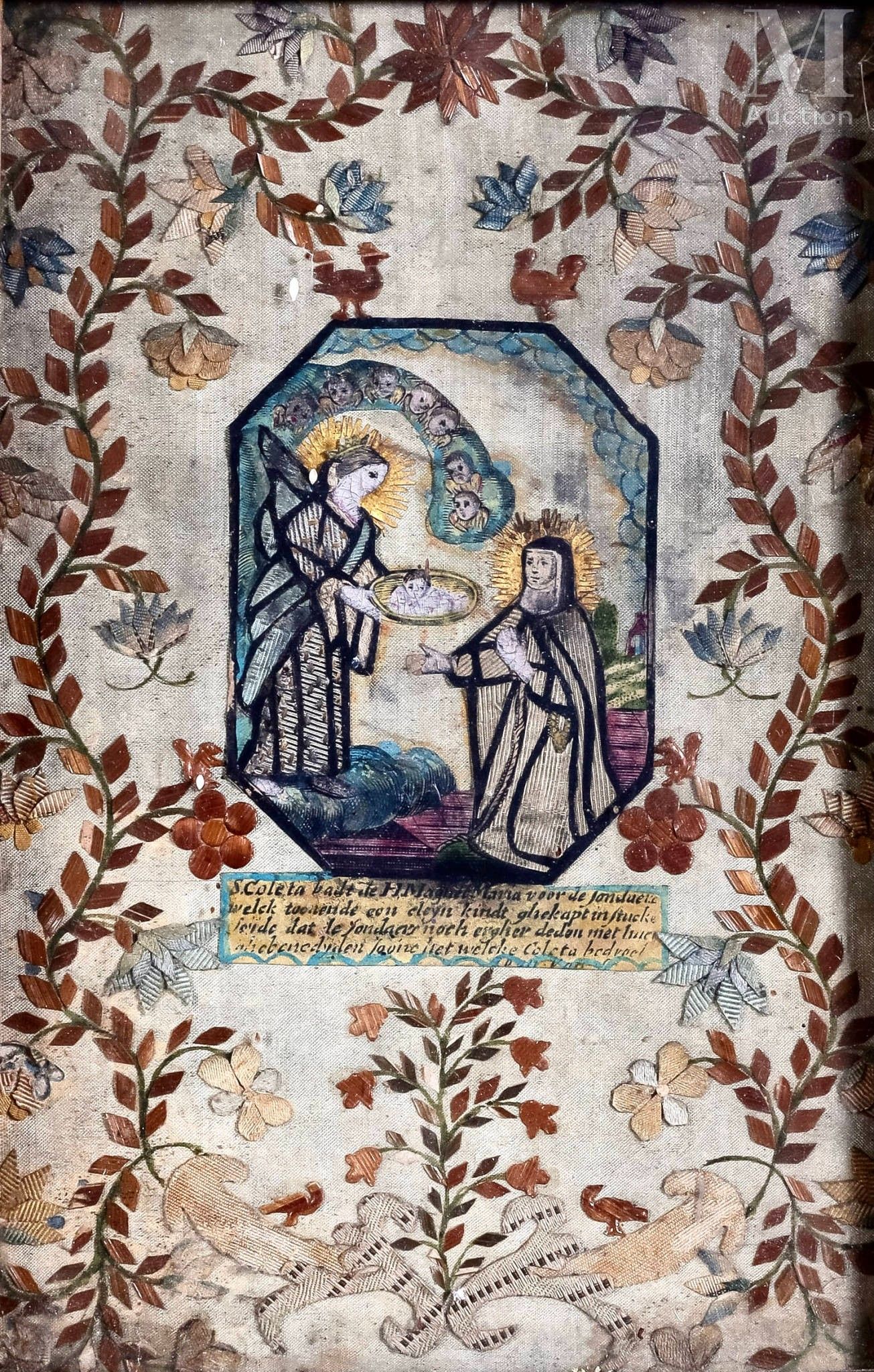 Rectangular cutwork embroidery in wool and rhinestones on ivory silk in a frame embroidered with polychrome foliage and floral scrolls, centred on a handwritten Flemish cartel in ink on paper.