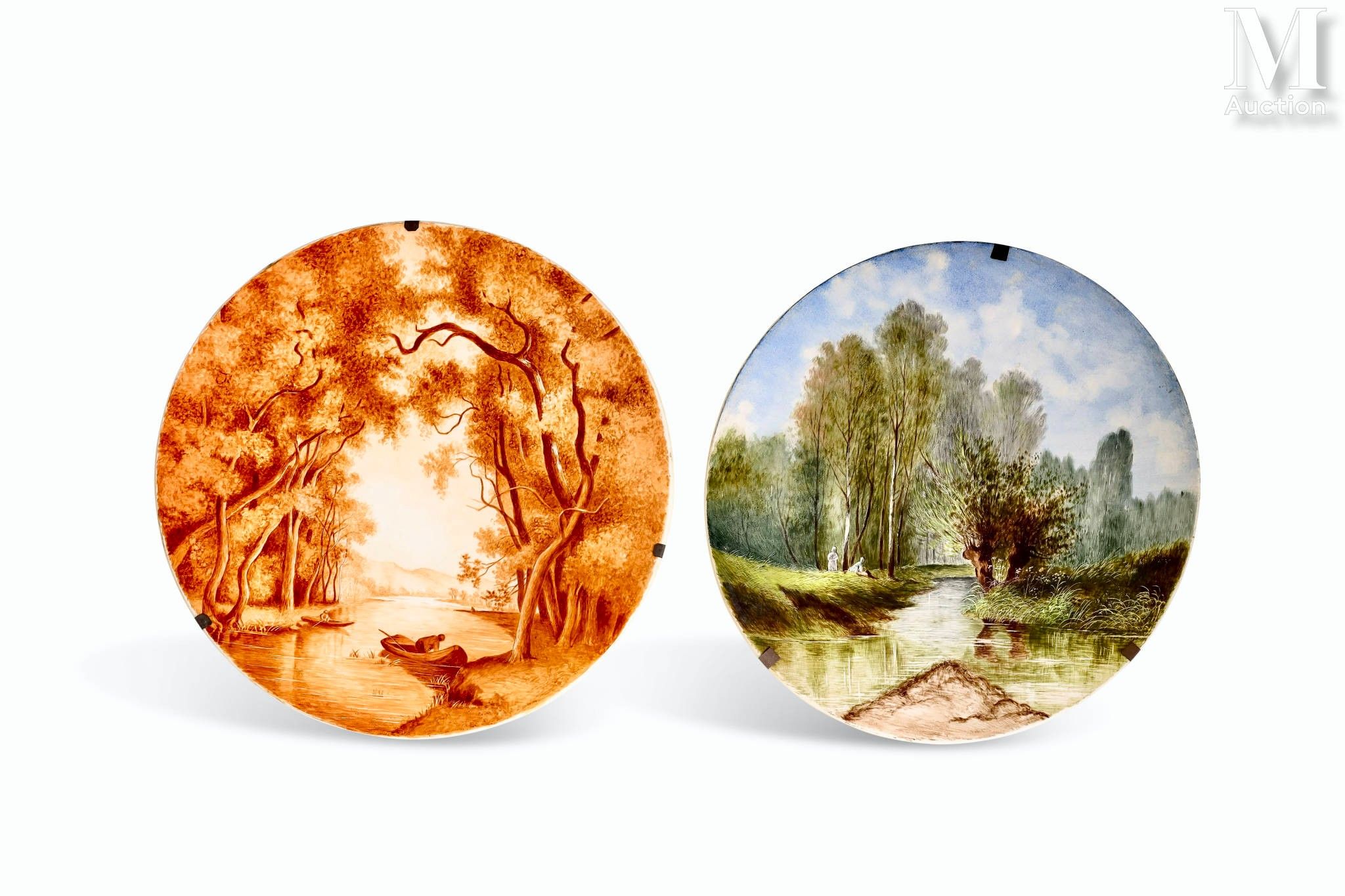 in white porcelain with painted polychrome decoration of figures in a forest and beside a river