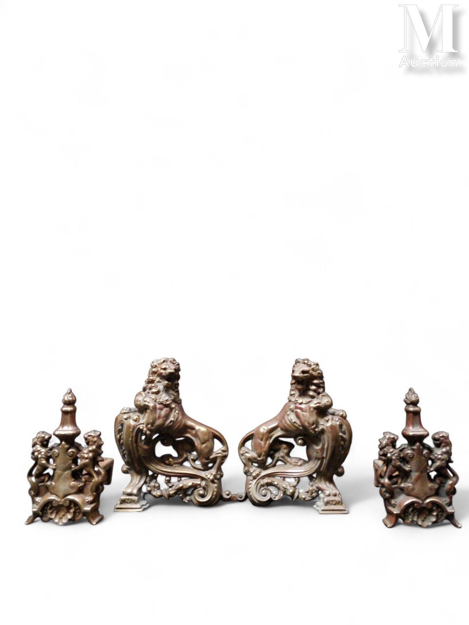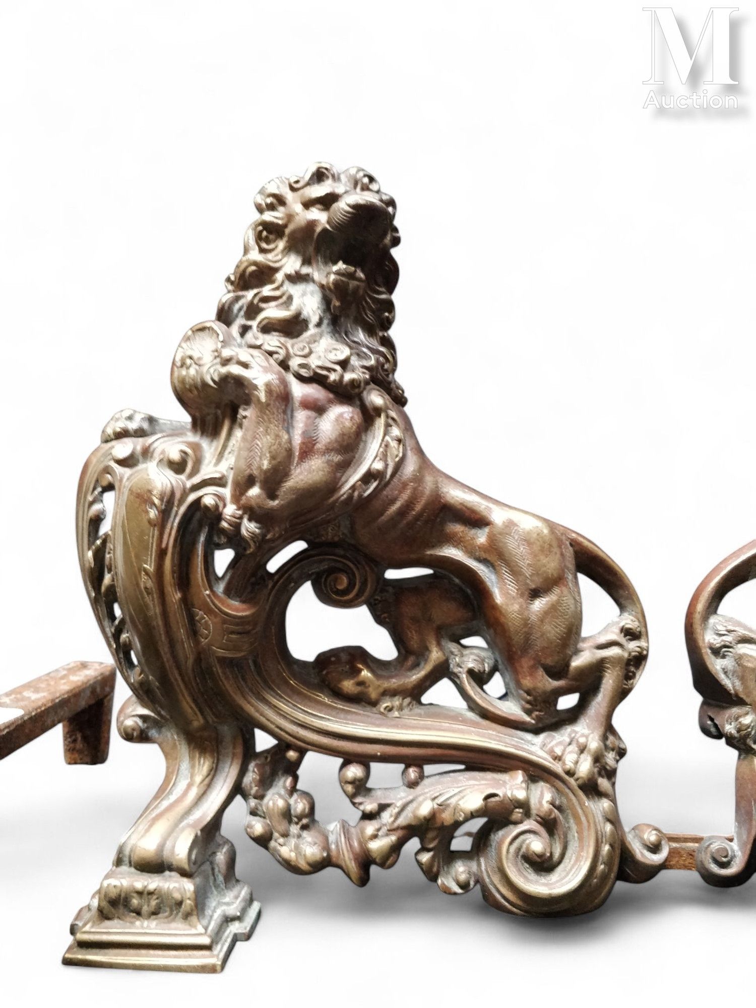gilt bronze; the first decorated with lions resting their paws on scrolls, the second with an escutcheon flanked by a lion facing each other and surmounted by a fire pot.