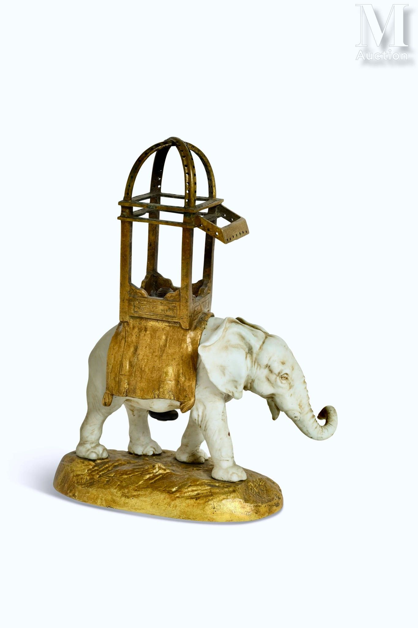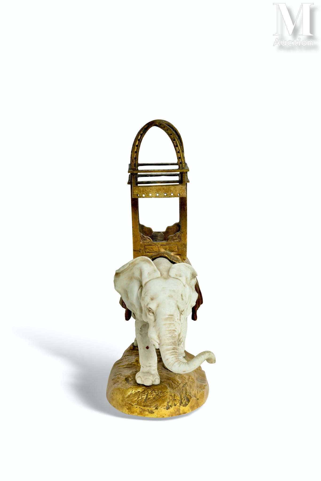 A bronze and biscuit porcelain proof representing an oriental elephant carrying on its back a kind of stick or palanquin known as a "howdah". It stands on a bronze base in the Barbedienne style.