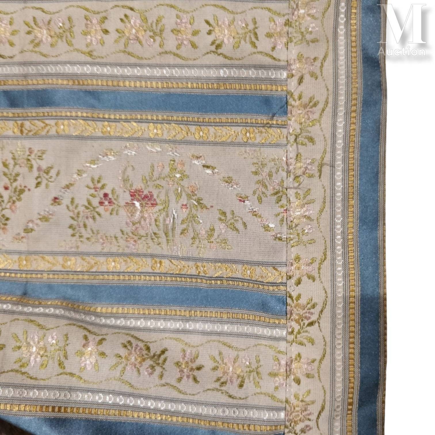 in embroidered silk decorated with garlands of polychrome flowers on a beige background.