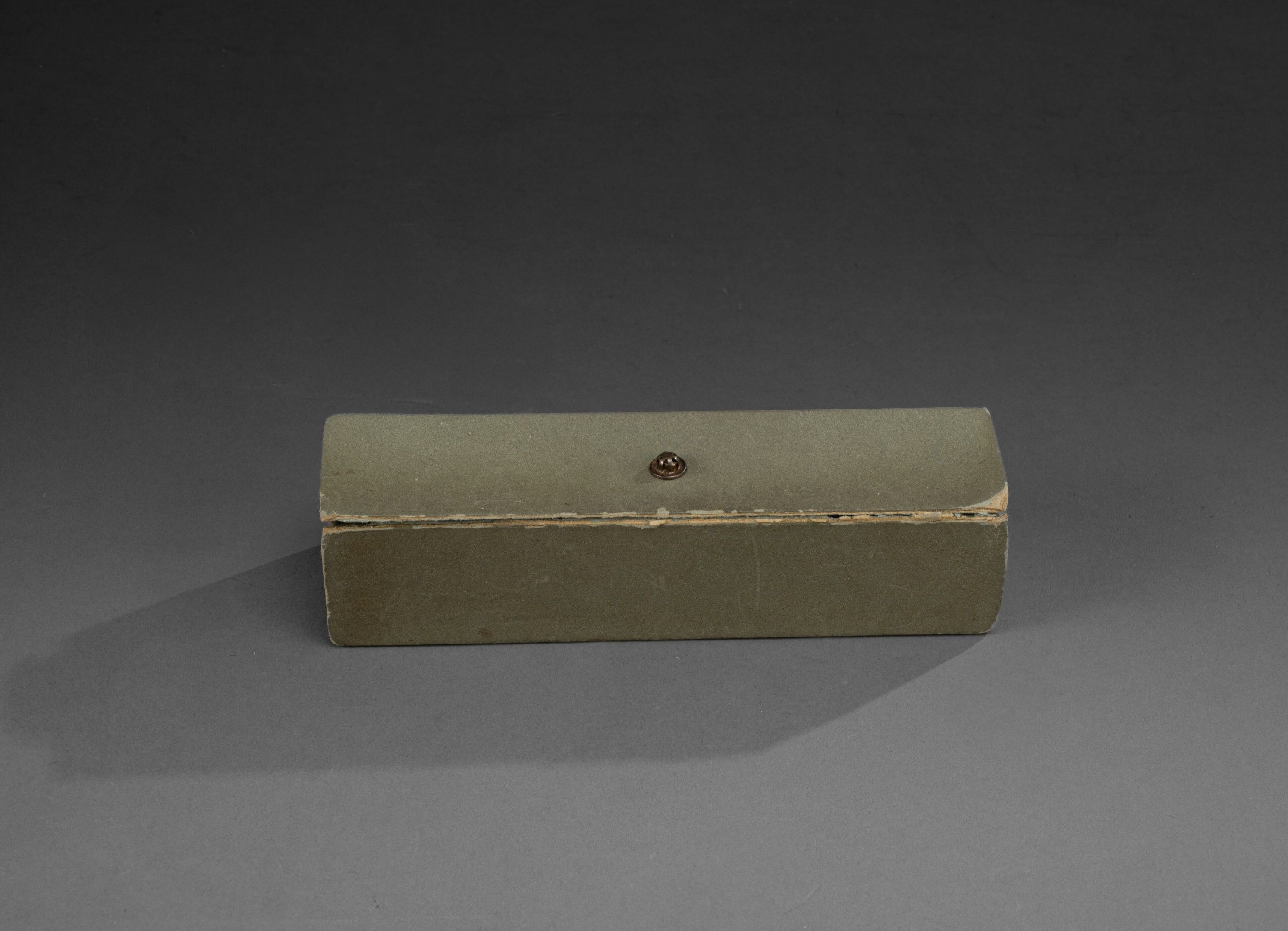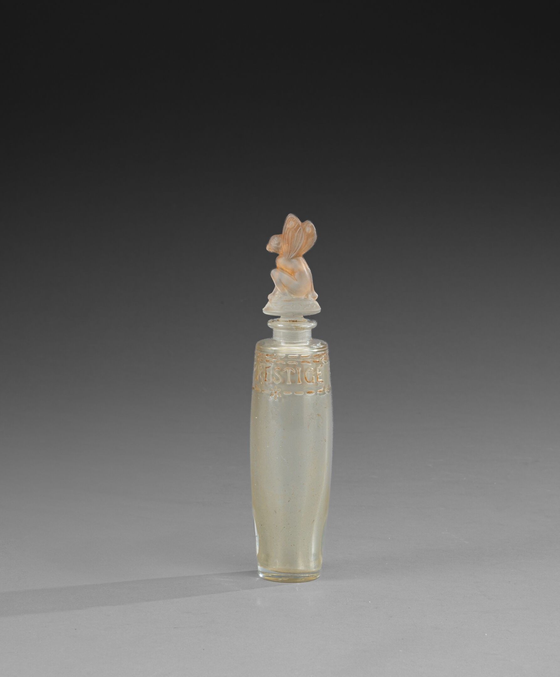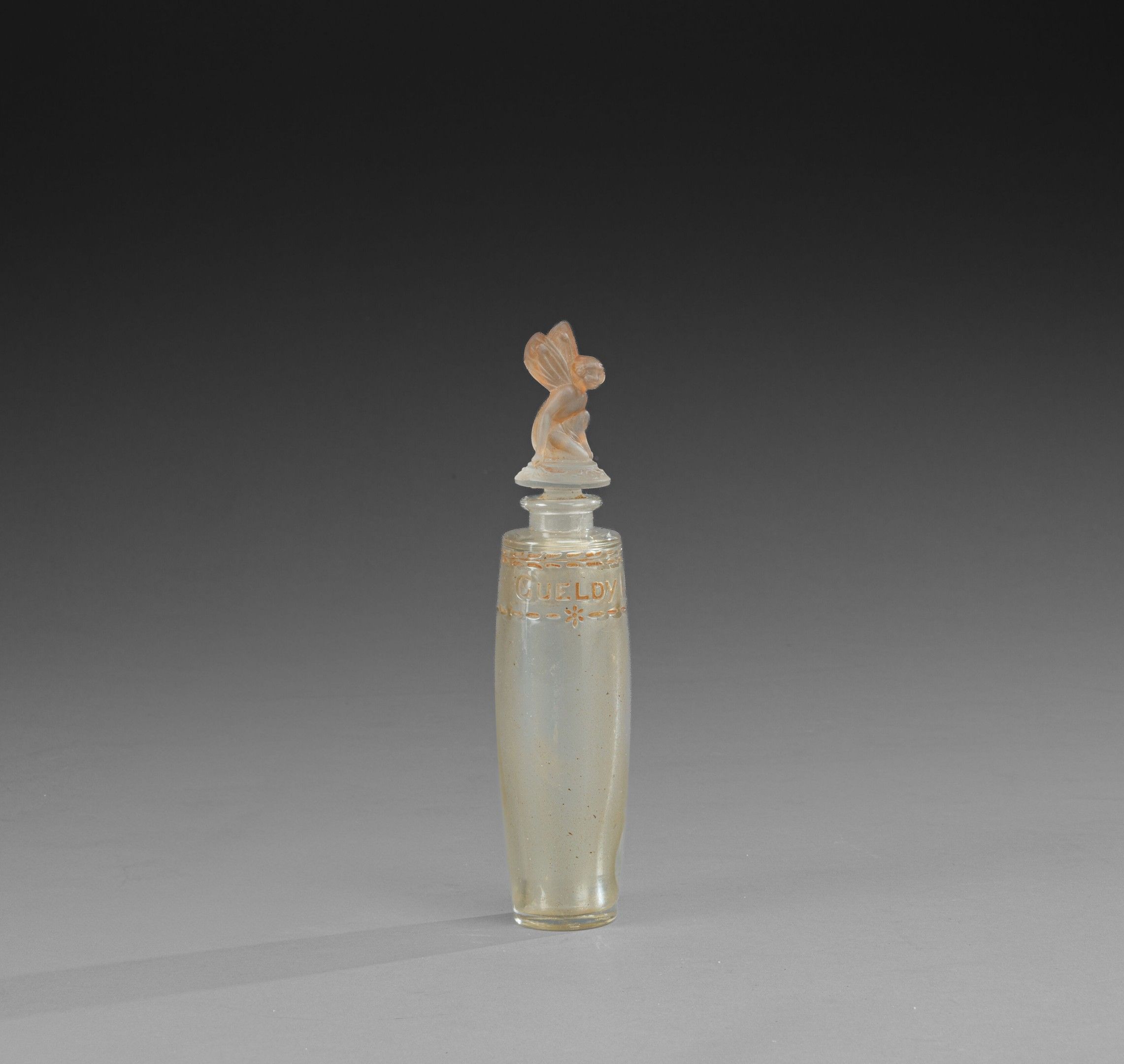 Barrel-shaped perfume bottle with the title and name of the perfumer in a decorative frieze with an ochre patina at the top. The stopper in moulded-pressed glass with a patina finish and depicting a winged fairy.