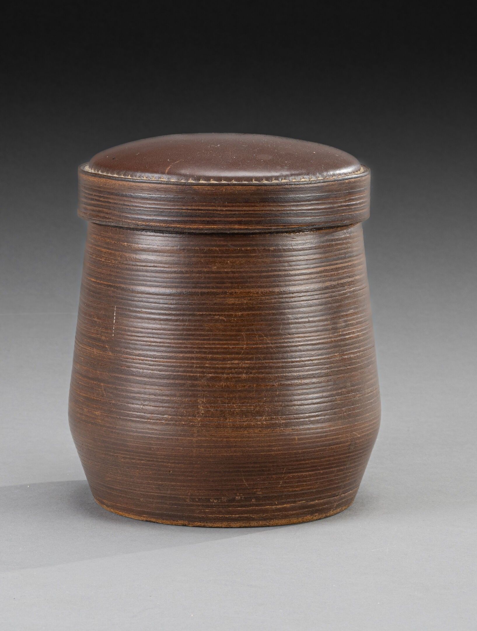 A compressed wood-turned tobacco pot with ovoid body and brown leather-covered lid with saddle-stitching, signed on the reverse in gold.
