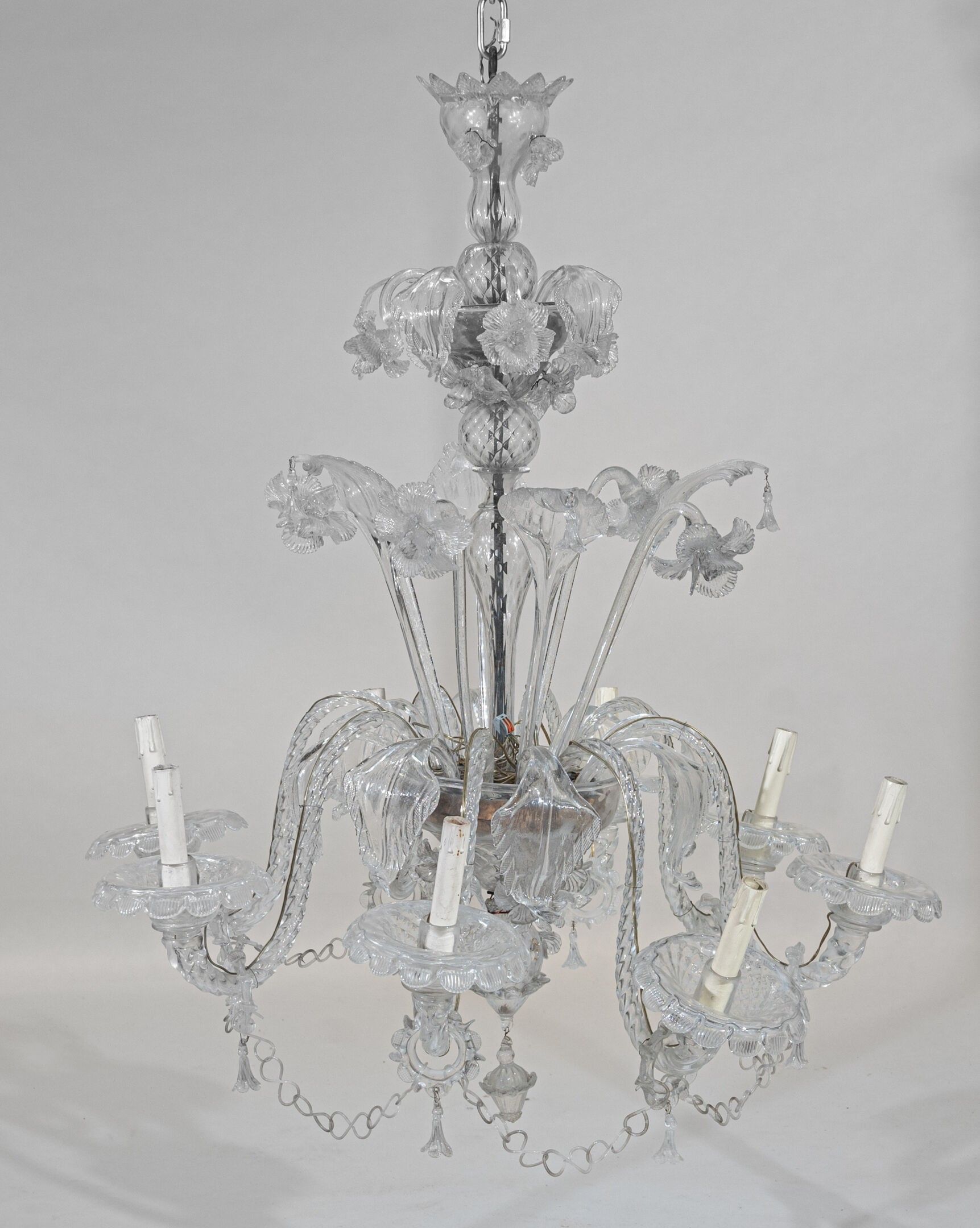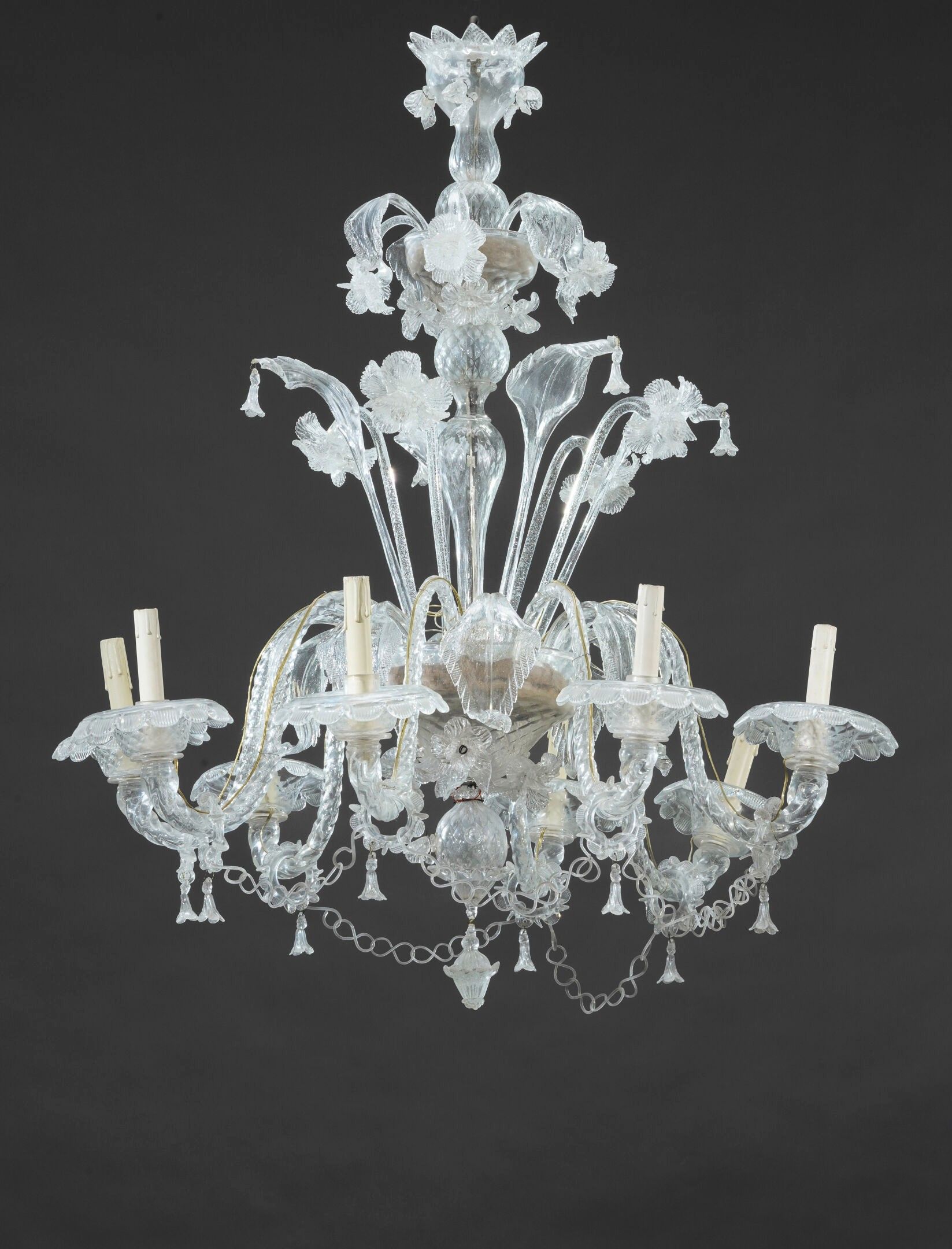 Colourless glass chandelier, worked with tongs, crowned with eight twisted arms of light, joined by chains and surmounted, around the shaft, by wreaths of flowers and leaves