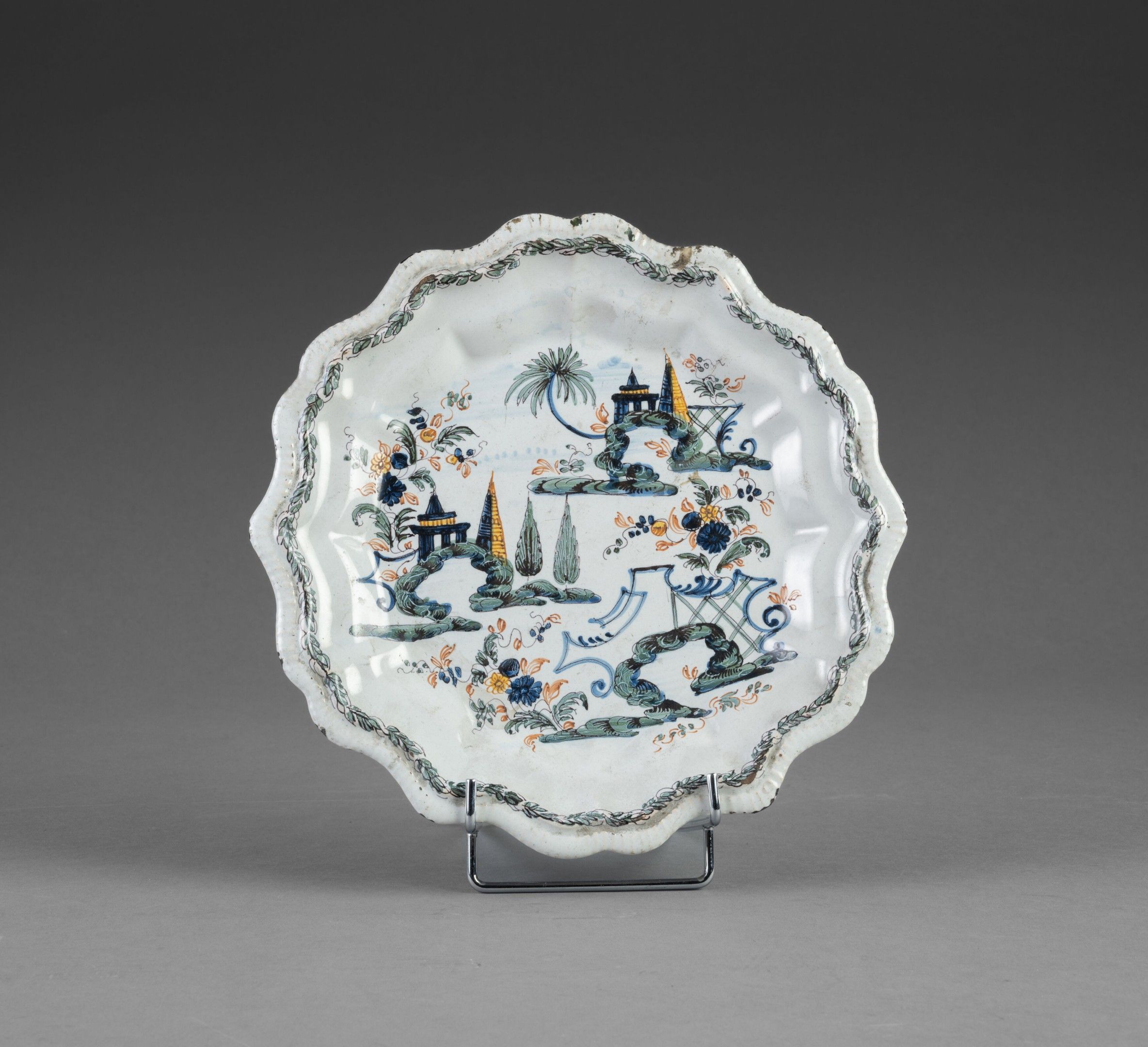 Earthenware plate with scalloped edges and polychrome "il ponte" decoration of pagodas and lattice work. Braid on the rim.